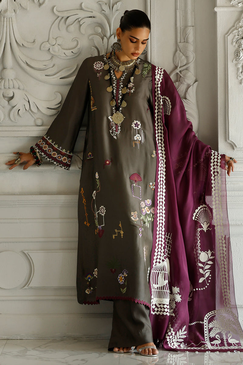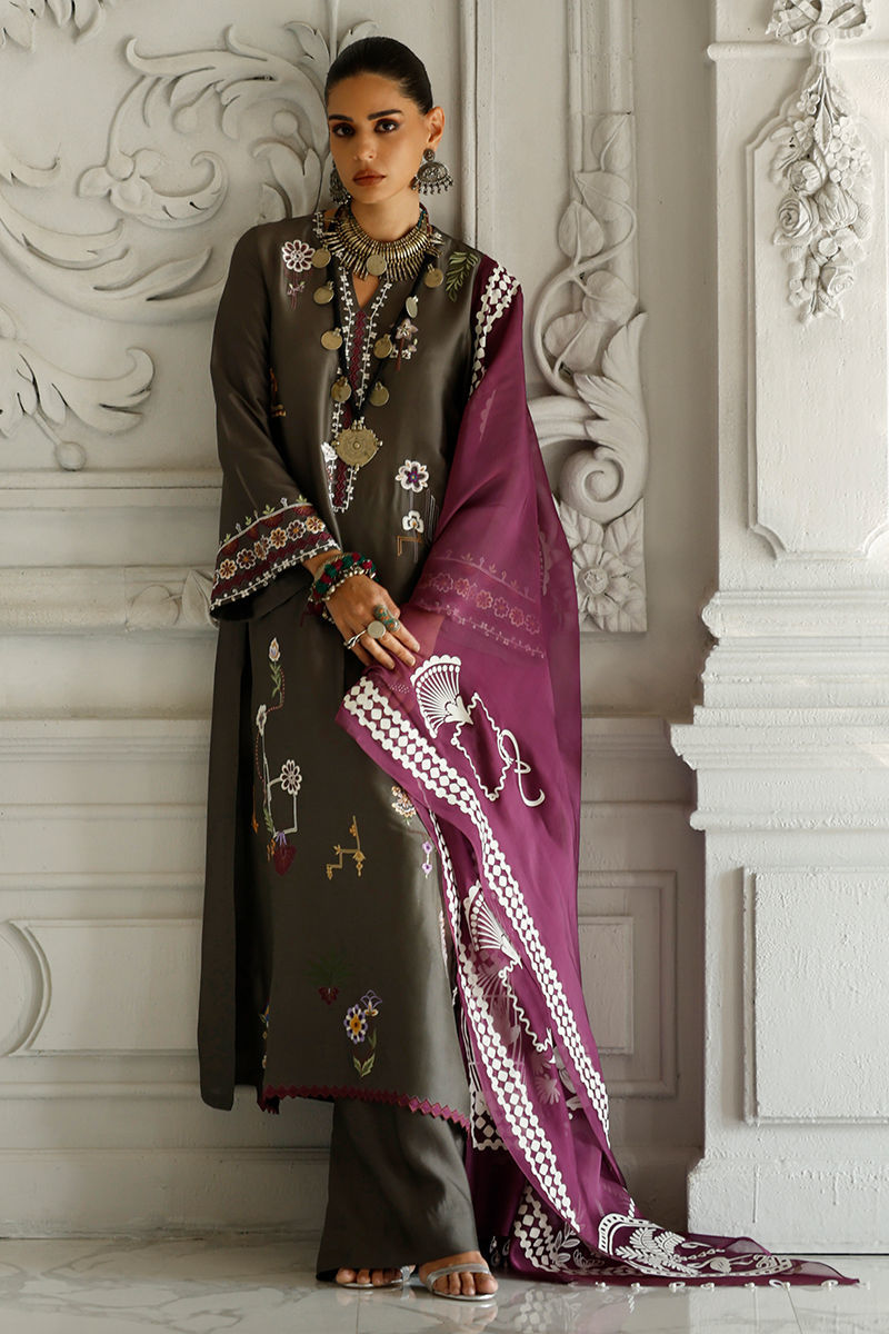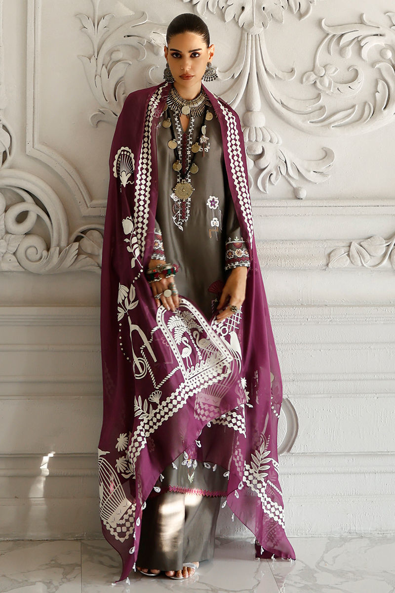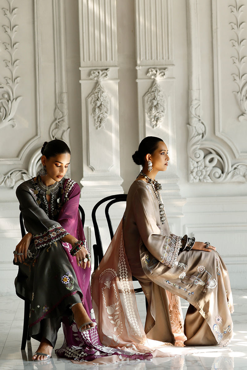 The mouse grey long shirt, crafted from butter silk, features refined appliqué work and intricate coloured resham embroidery across the front, back, and sleeves, finished with functional pockets. It is paired with pure cotton silk culottes for a fluid, elegant silhouette. The ensemble is completed with a purple shisha organza dupatta, adorned with screen print and finished with handmade tassels, adding a graceful, artisanal touch.