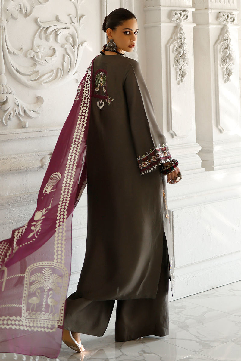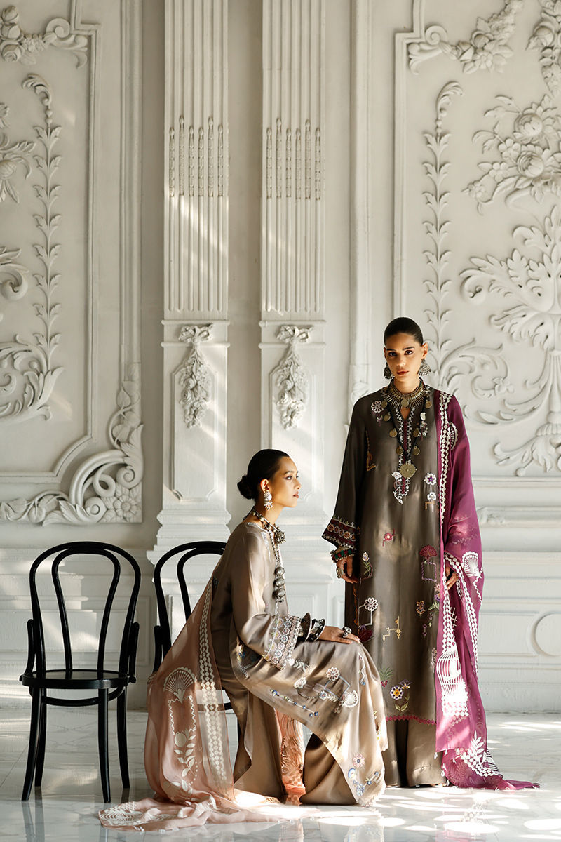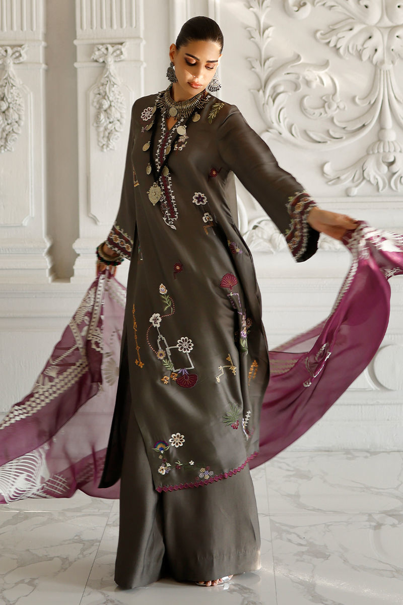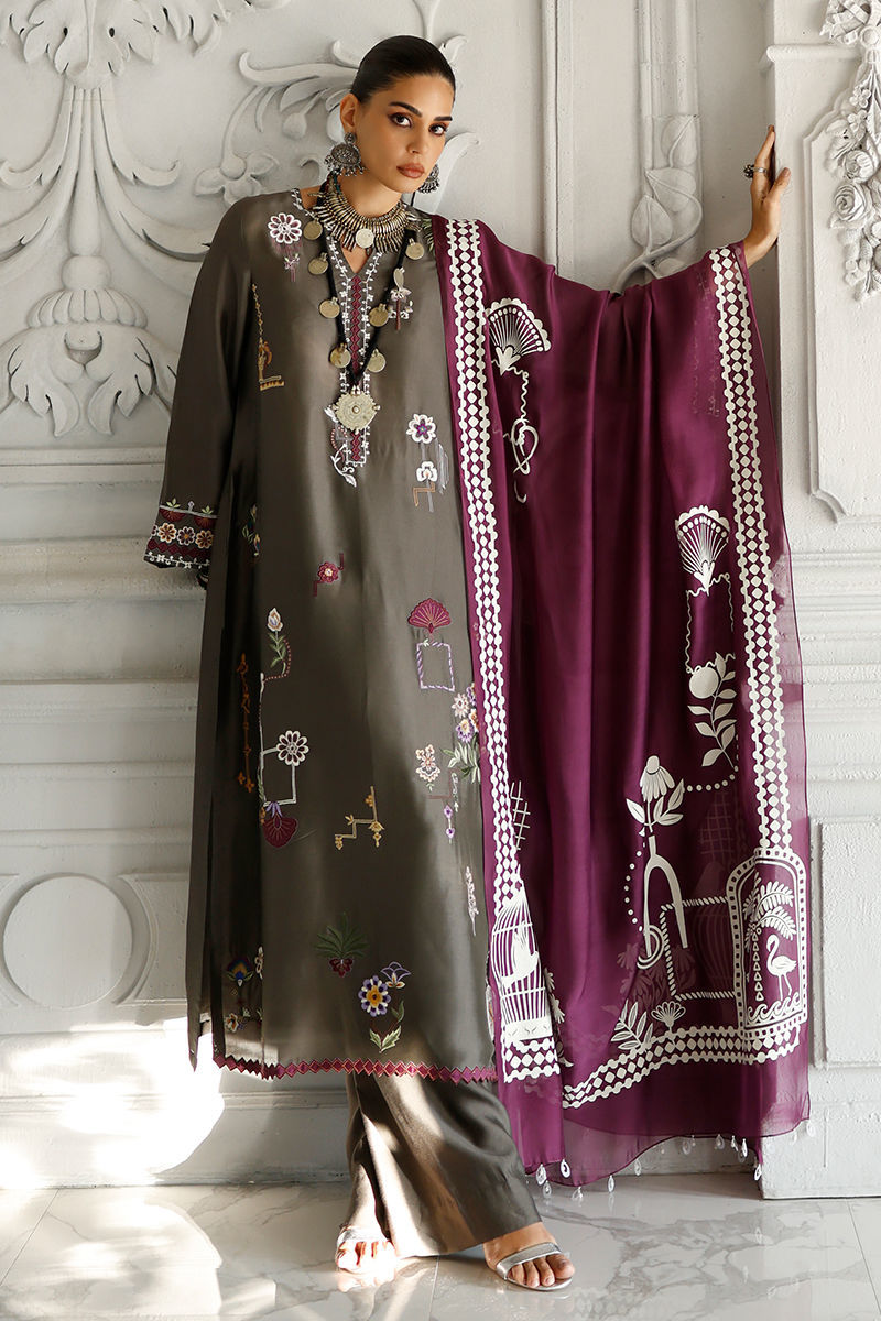 The mouse grey long shirt, crafted from butter silk, features refined appliqué work and intricate coloured resham embroidery across the front, back, and sleeves, finished with functional pockets. It is paired with pure cotton silk culottes for a fluid, elegant silhouette. The ensemble is completed with a purple shisha organza dupatta, adorned with screen print and finished with handmade tassels, adding a graceful, artisanal touch.