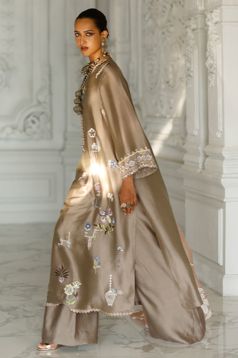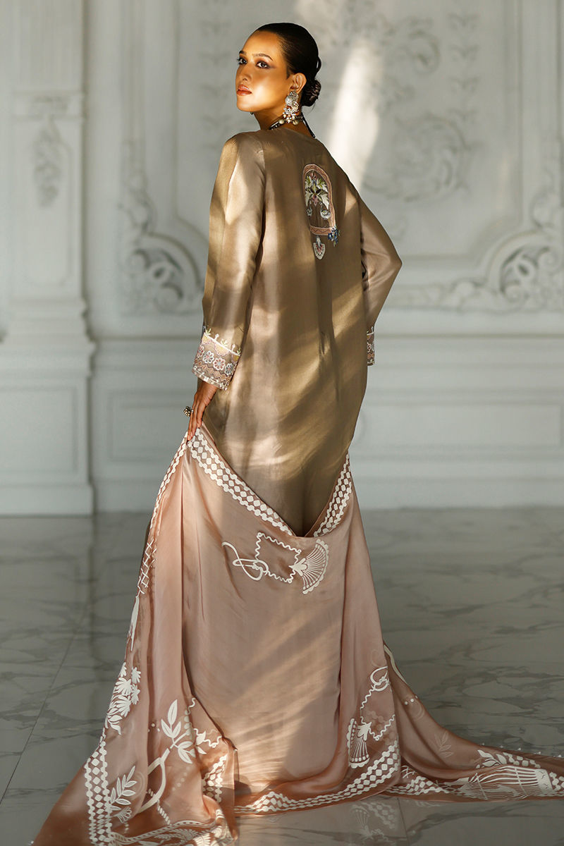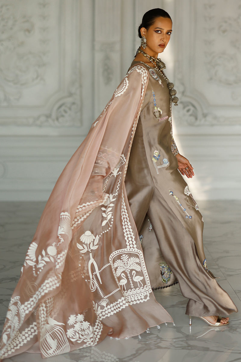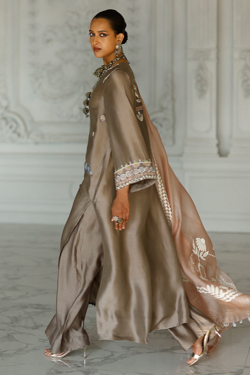 The caribou long shirt, crafted from butter silk, features refined appliqué work and intricate coloured resham embroidery across the front, back, and sleeves, finished with functional pockets. It is paired with pure cotton silk culottes for a fluid, elegant silhouette. The ensemble is completed with an adobe rose shisha organza dupatta, adorned with screen print and finished with handmade tassels, adding a graceful, artisanal touch.