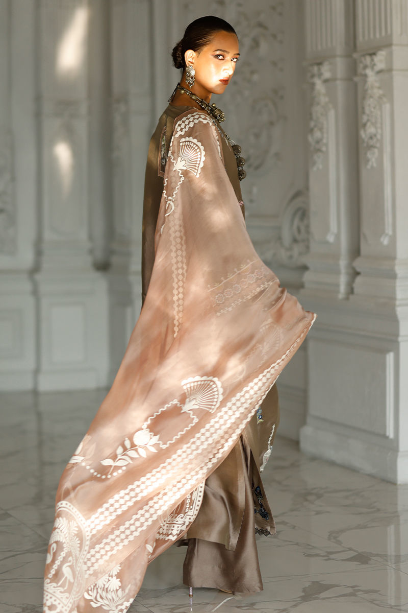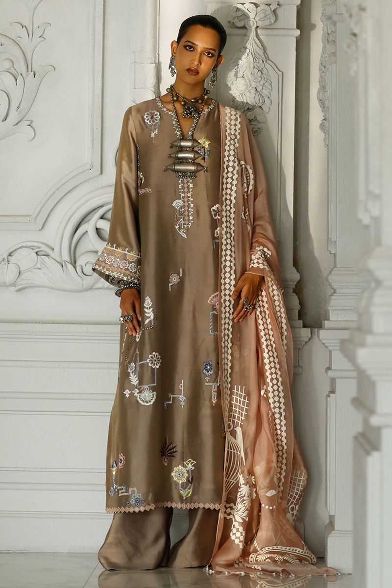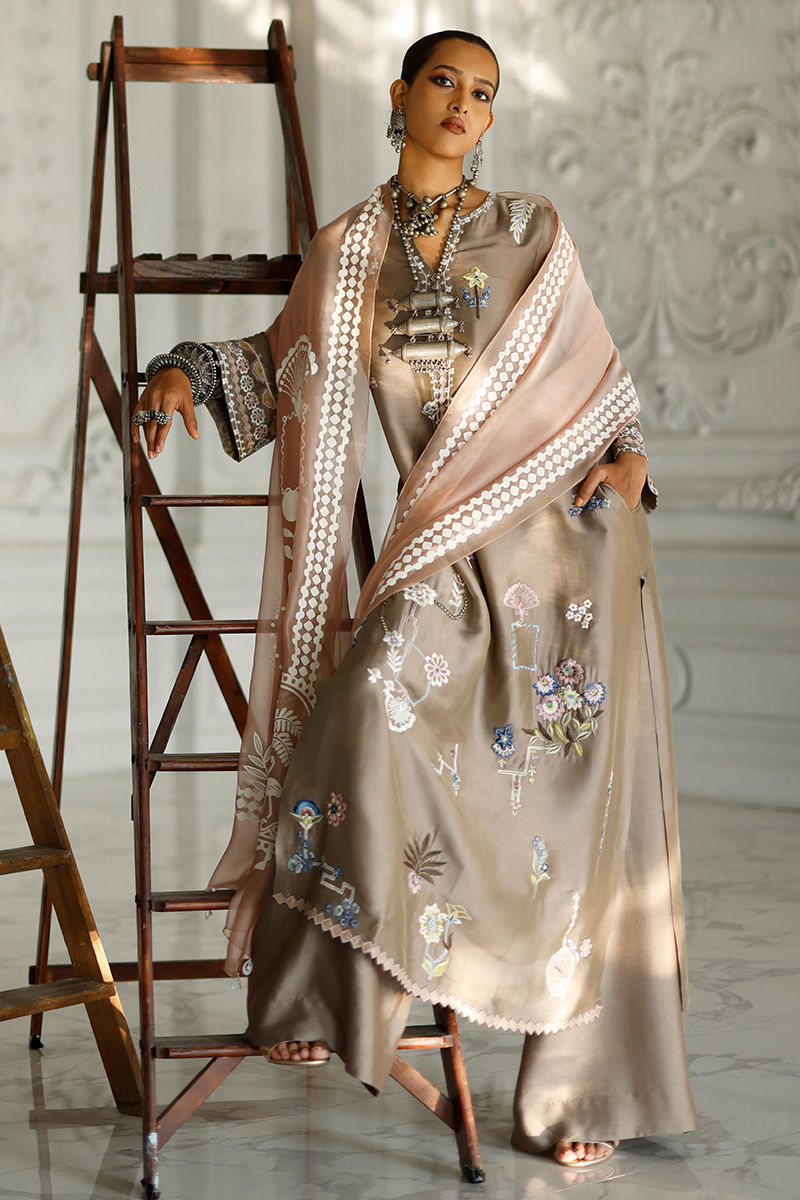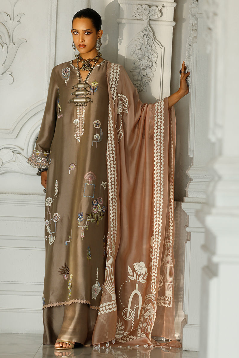 The caribou long shirt, crafted from butter silk, features refined appliqué work and intricate coloured resham embroidery across the front, back, and sleeves, finished with functional pockets. It is paired with pure cotton silk culottes for a fluid, elegant silhouette. The ensemble is completed with an adobe rose shisha organza dupatta, adorned with screen print and finished with handmade tassels, adding a graceful, artisanal touch.