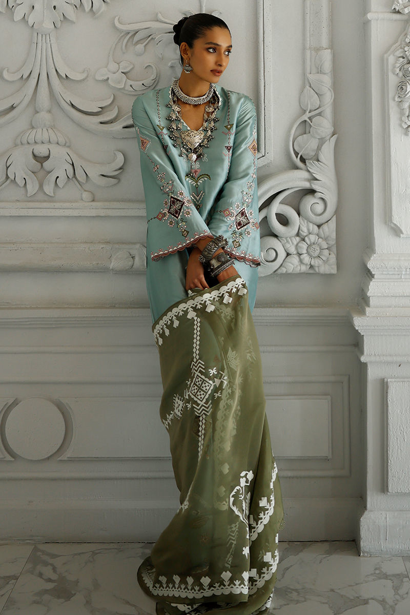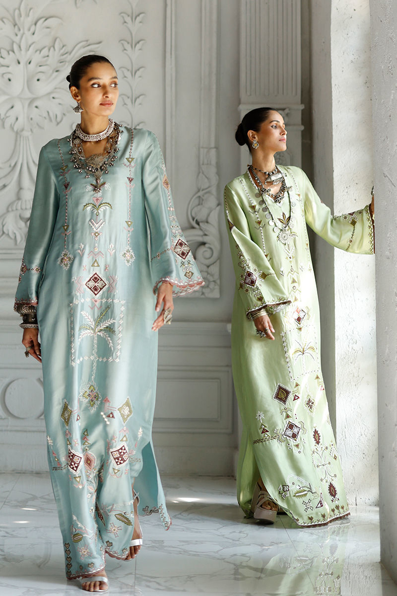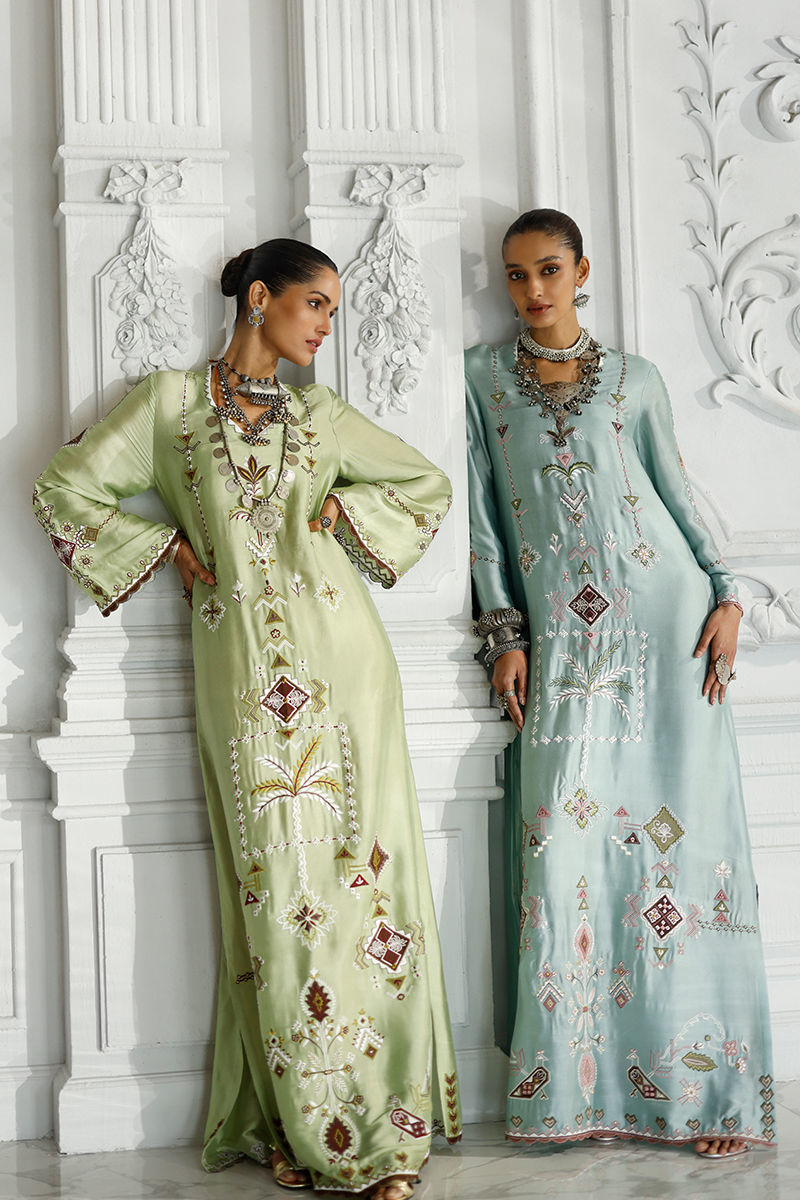 Hushed blue butter silk kaftan with coloured appliqué work and resham embroidery on front, back, and sleeves, finished with pockets. Paired with an olive shisha organza dupatta with screen print and handmade tassels.