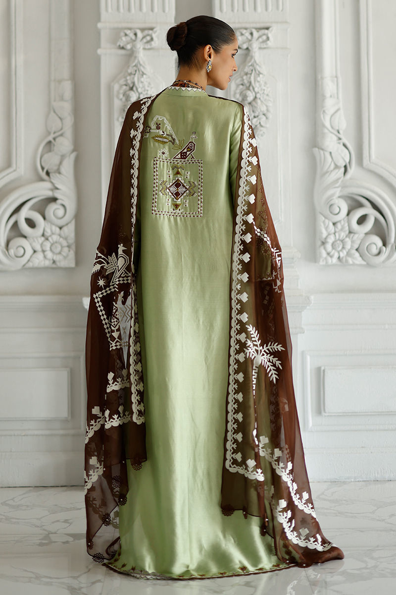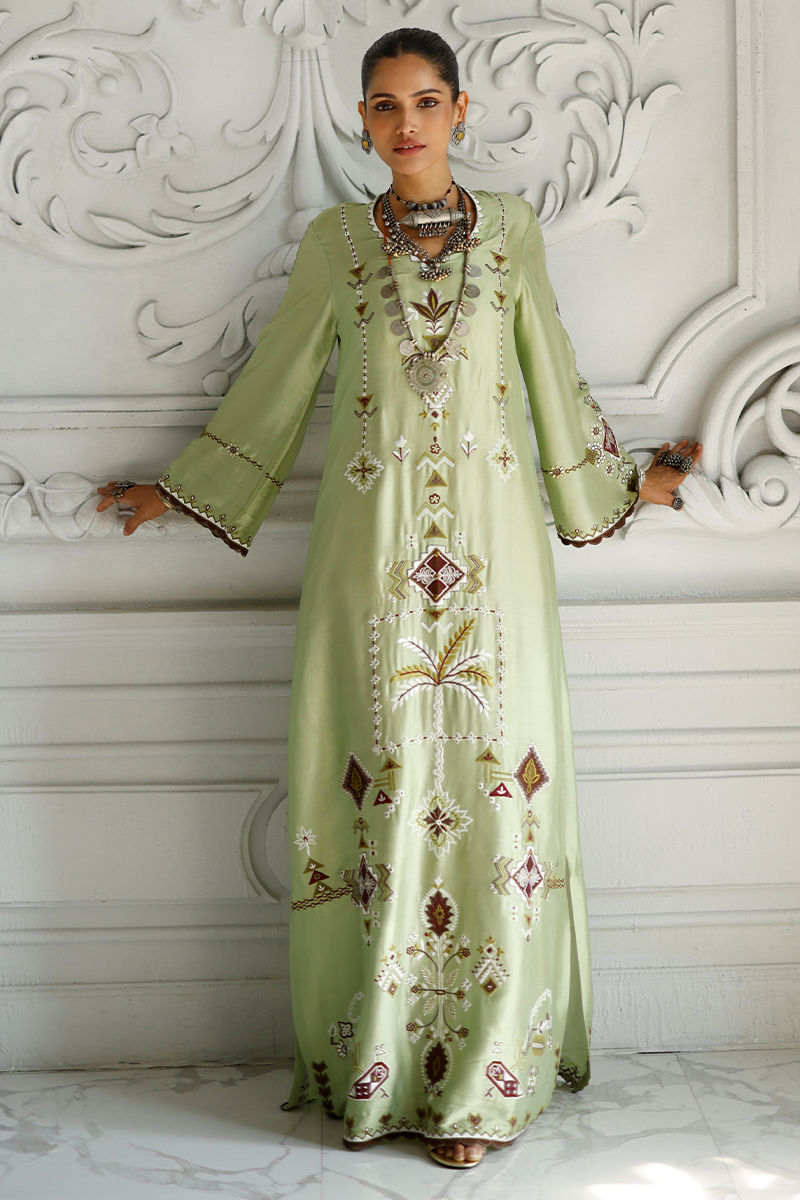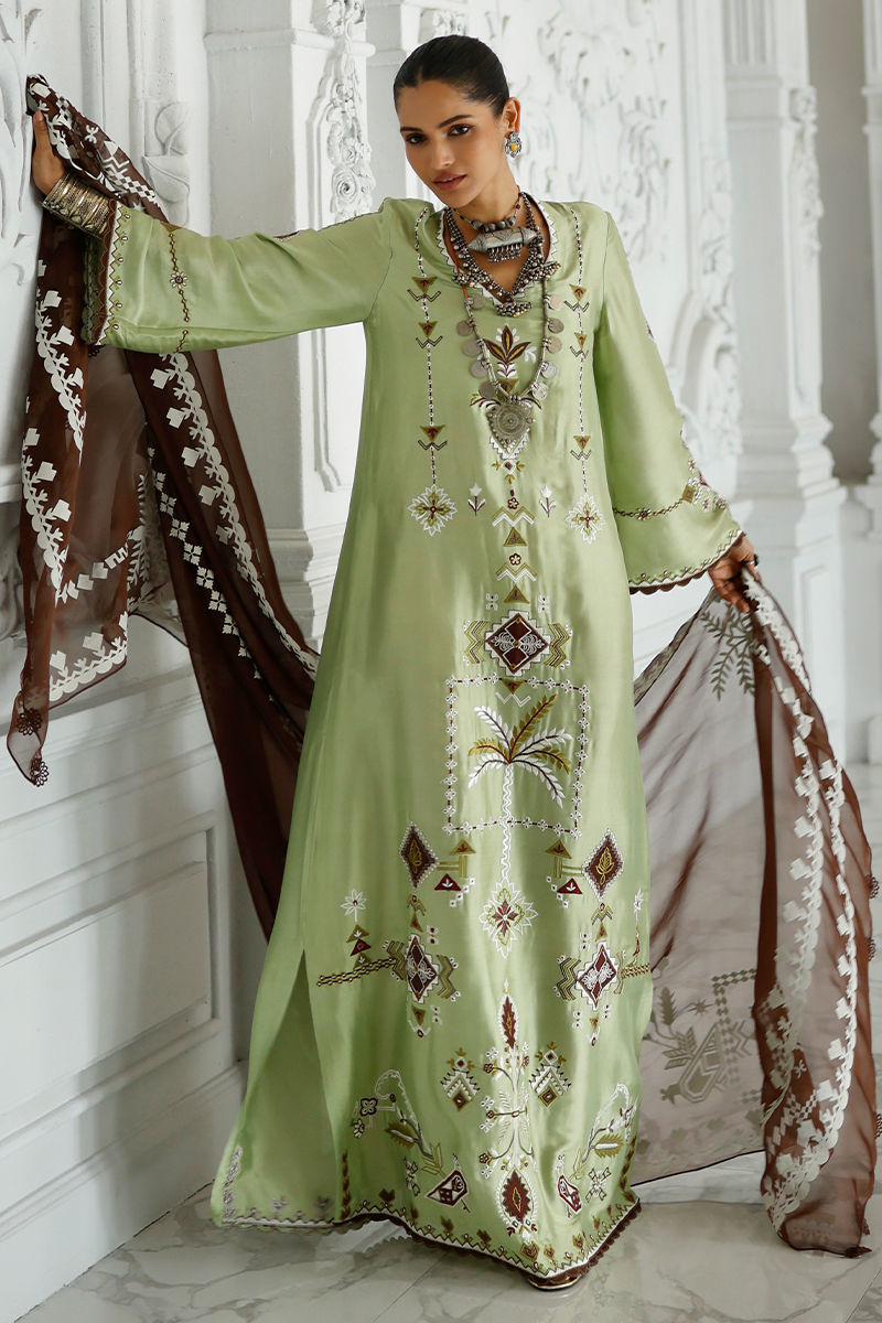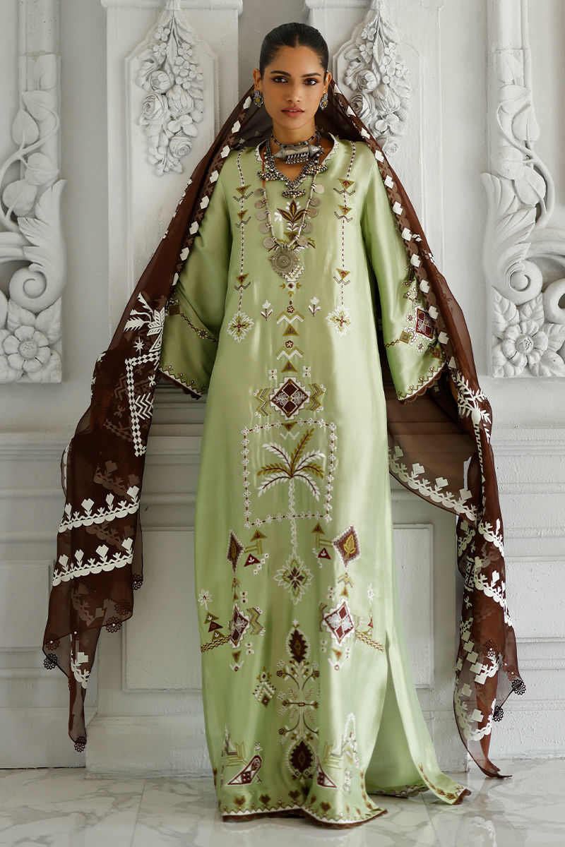Pistachio butter silk kaftan with pockets, detailed with coloured appliqué and resham embroidery on the front, back & sleeves. Styled with a brown shisha organza dupatta, screen printed and finished with hand-crafted tassels.