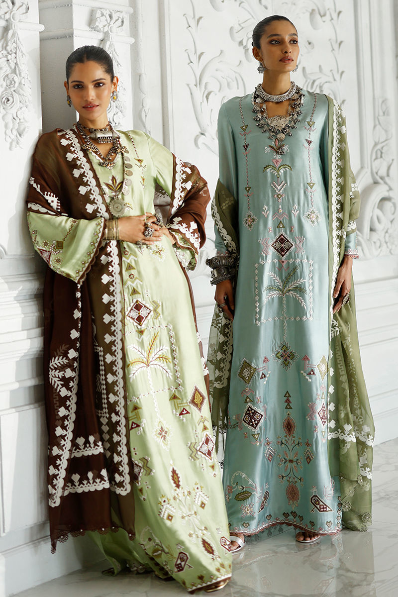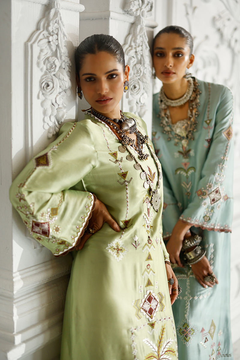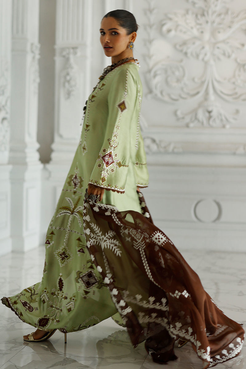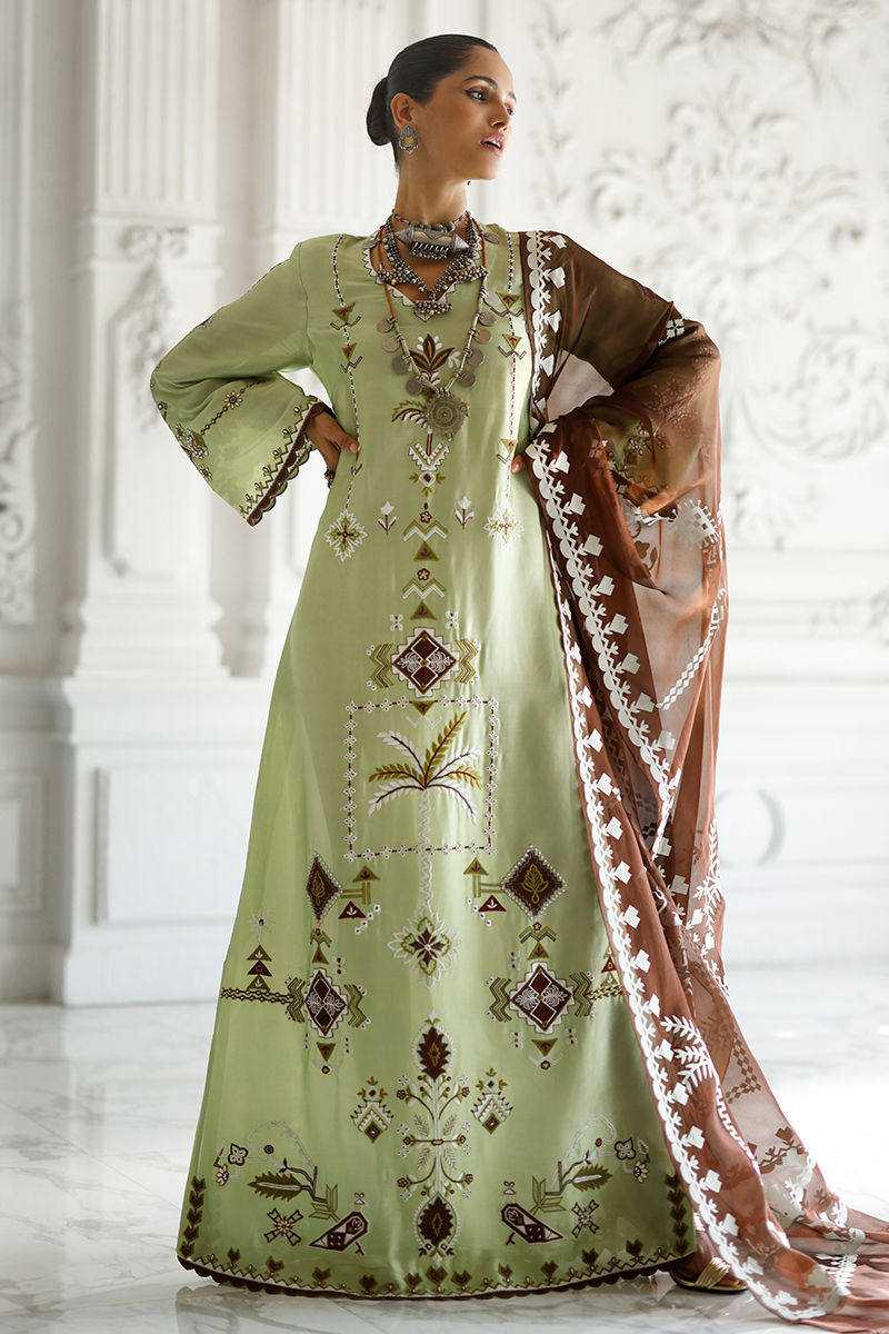 Pistachio butter silk kaftan with pockets, detailed with coloured appliqué and resham embroidery on the front, back & sleeves. Styled with a brown shisha organza dupatta, screen printed and finished with hand-crafted tassels.