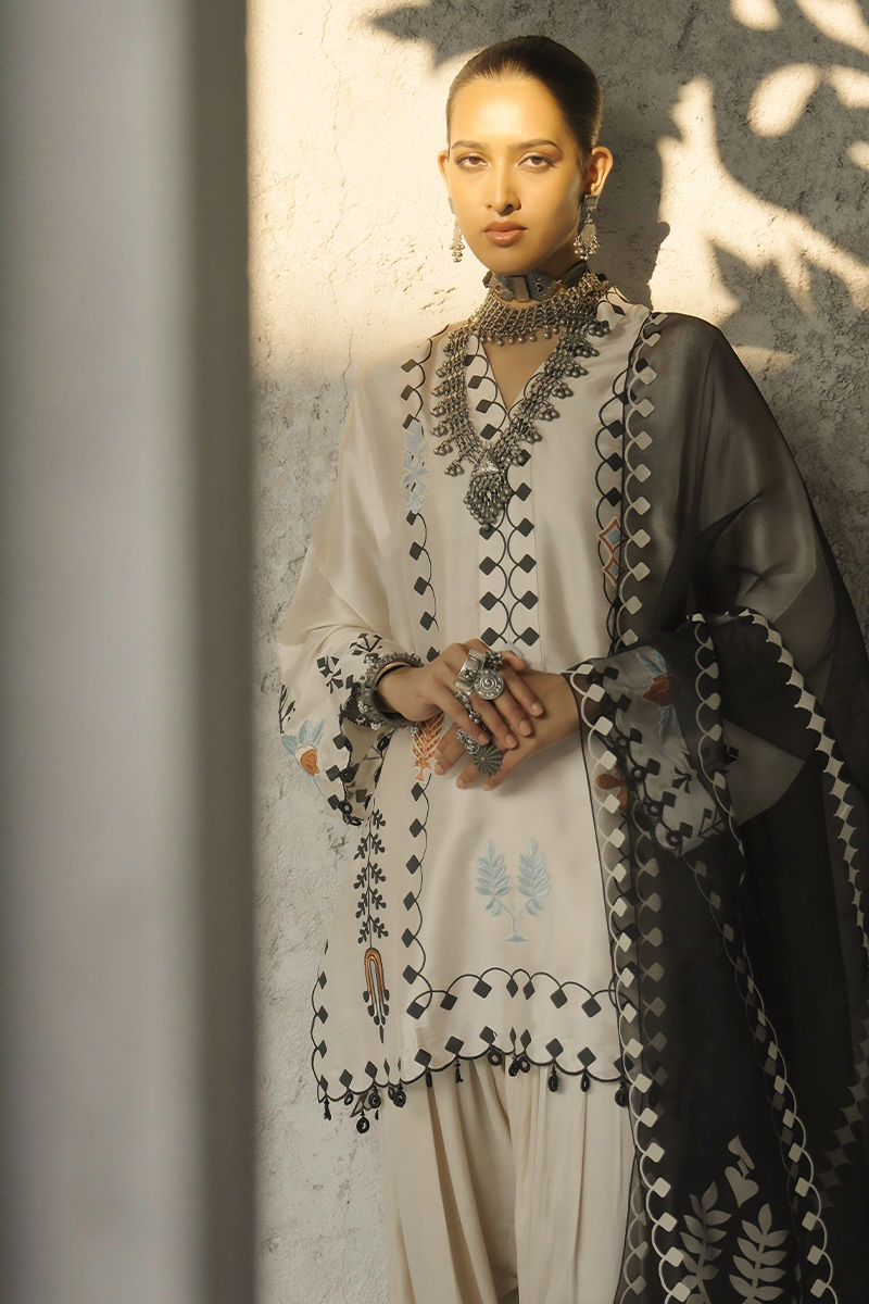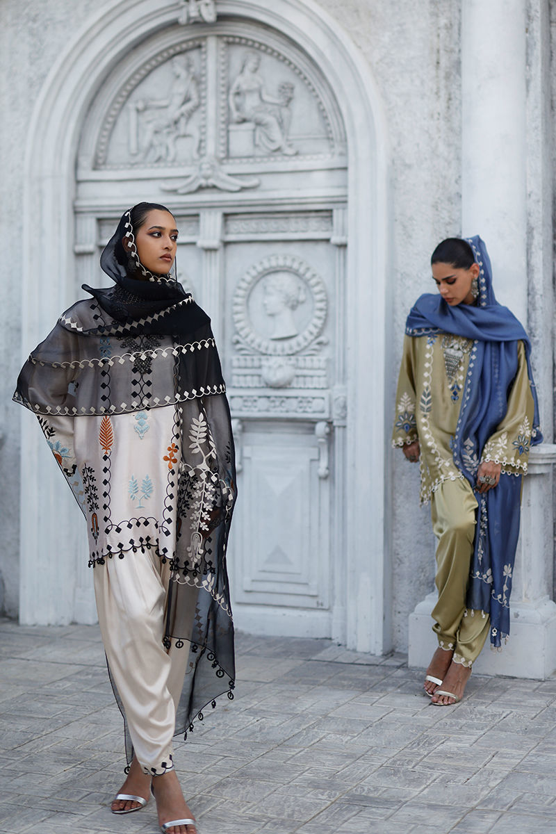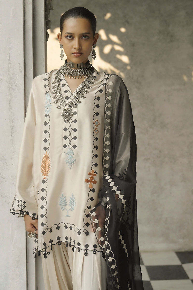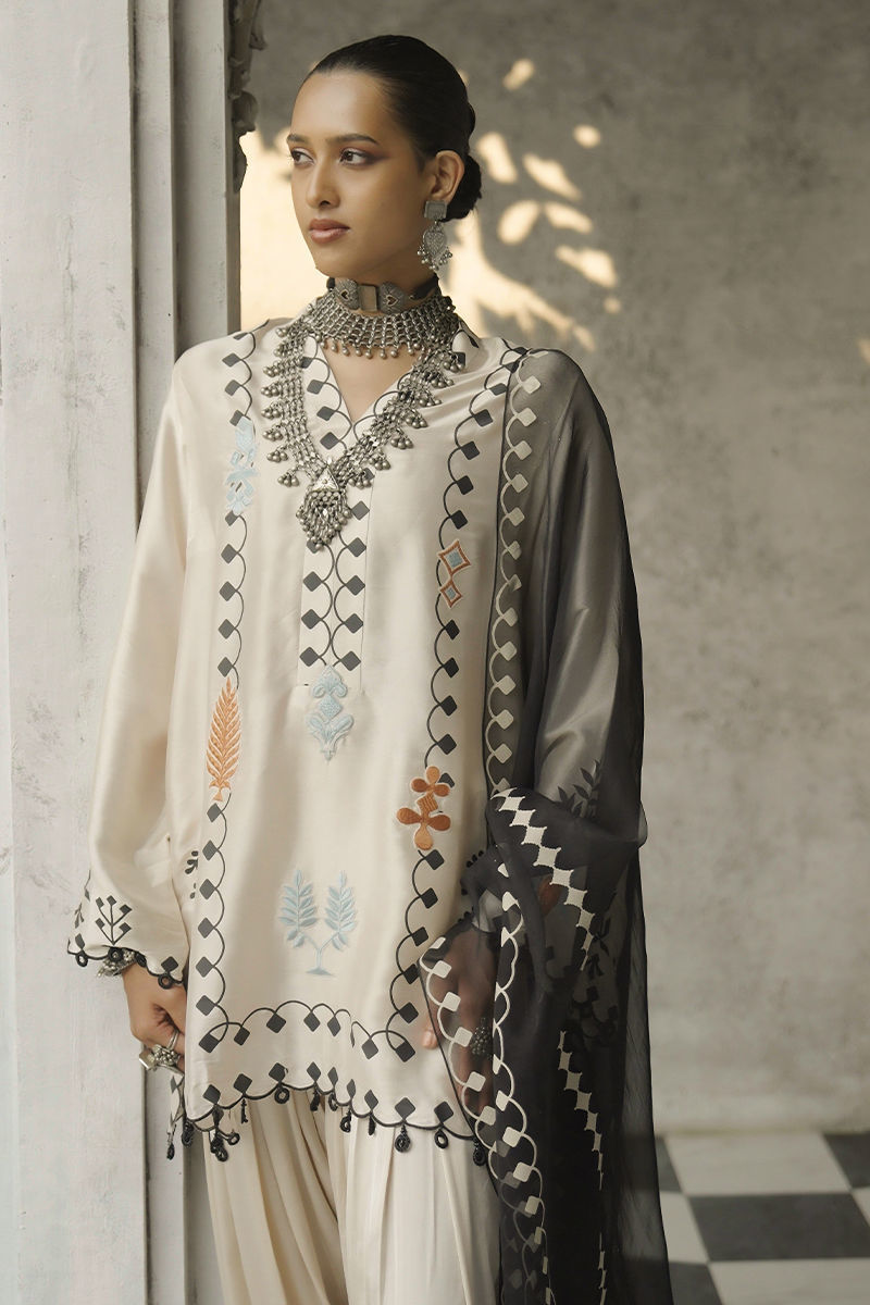 The cloud cream butter silk loose-cut short shirt, adorned with pockets, intricate screen print, coloured resham embroidery, and delicate hangings on front, back & sleeves, exudes artisanal elegance. Matched with cream gold khari shalwar in cotton charmeuse with screen-printed detailing at the bottom, and paired with a black shisha organza dupatta featuring screen print and handmade tassels for a contemporary, elevated look.