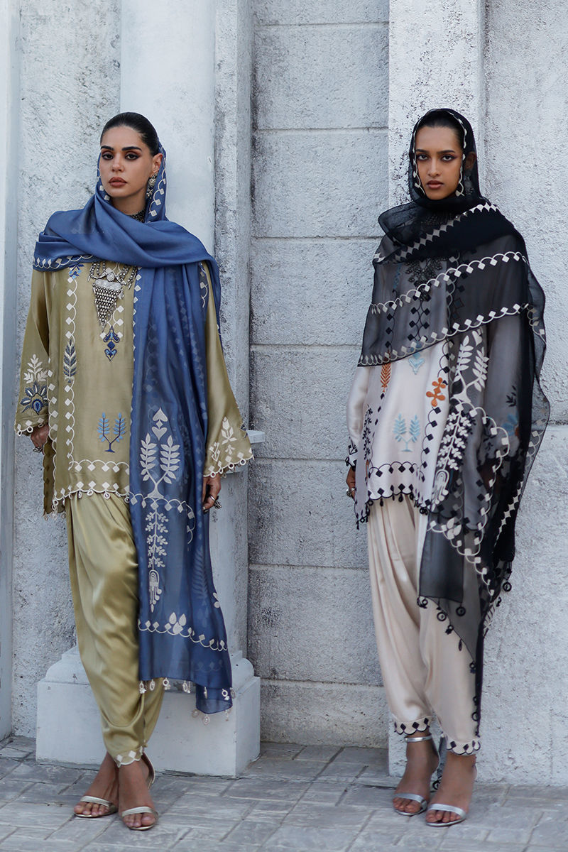 Fabric: Shirt: Butter Silk, Khadi Shalwar: Cotton Charmeuse, Dupatta: Shisha Organza