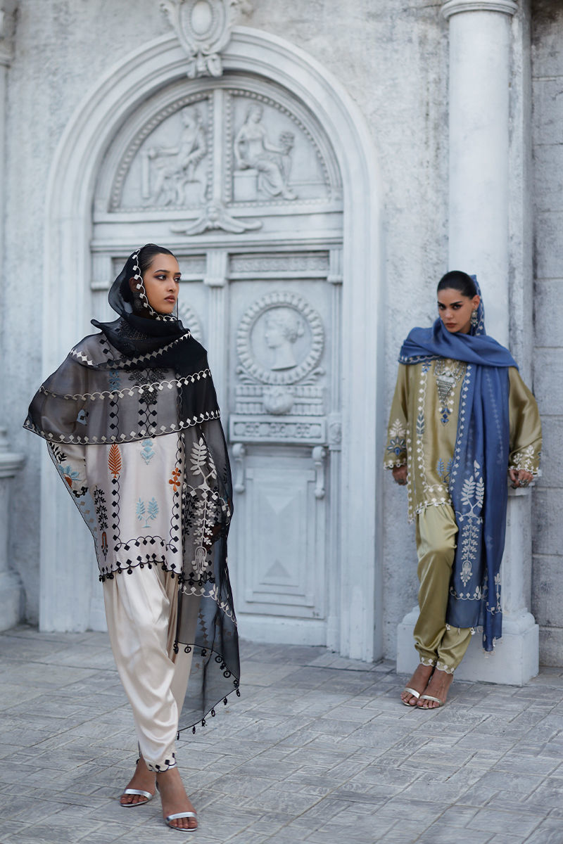 Fabric: Shirt: Butter Silk, Khadi Shalwar: Cotton Charmeuse, Dupatta: Shisha Organza