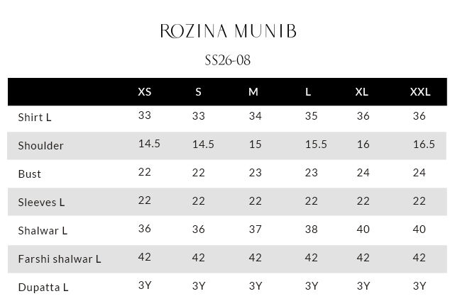 The yogurt tint loose-cut short shirt, crafted from butter silk, features pockets and is adorned with screen print, coloured resham embroidery, and delicate hangings across the front, back, and sleeves. It is paired with yogurt tint khari shalwar in cotton charmeuse, detailed with screen print on the bottom. The look is completed with a moon rock shisha organza dupatta, adorned with screen print and finished with handmade tassels, adding a refined and artisanal touch.