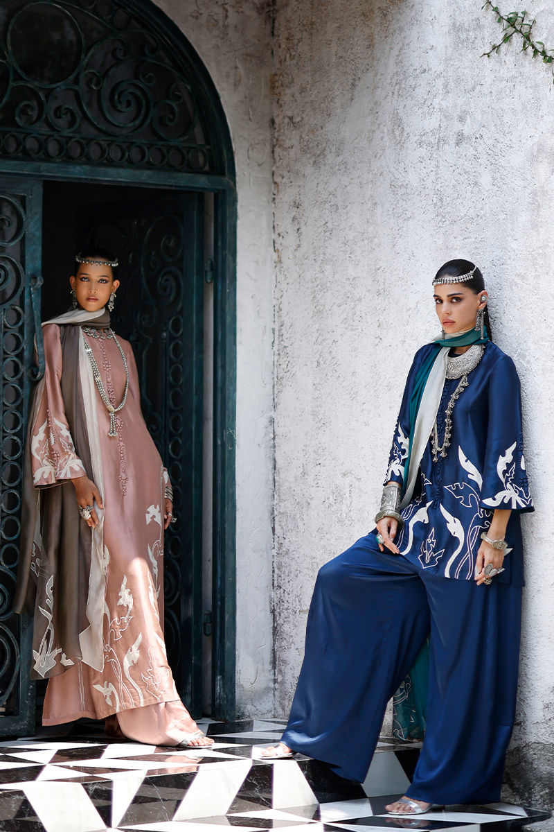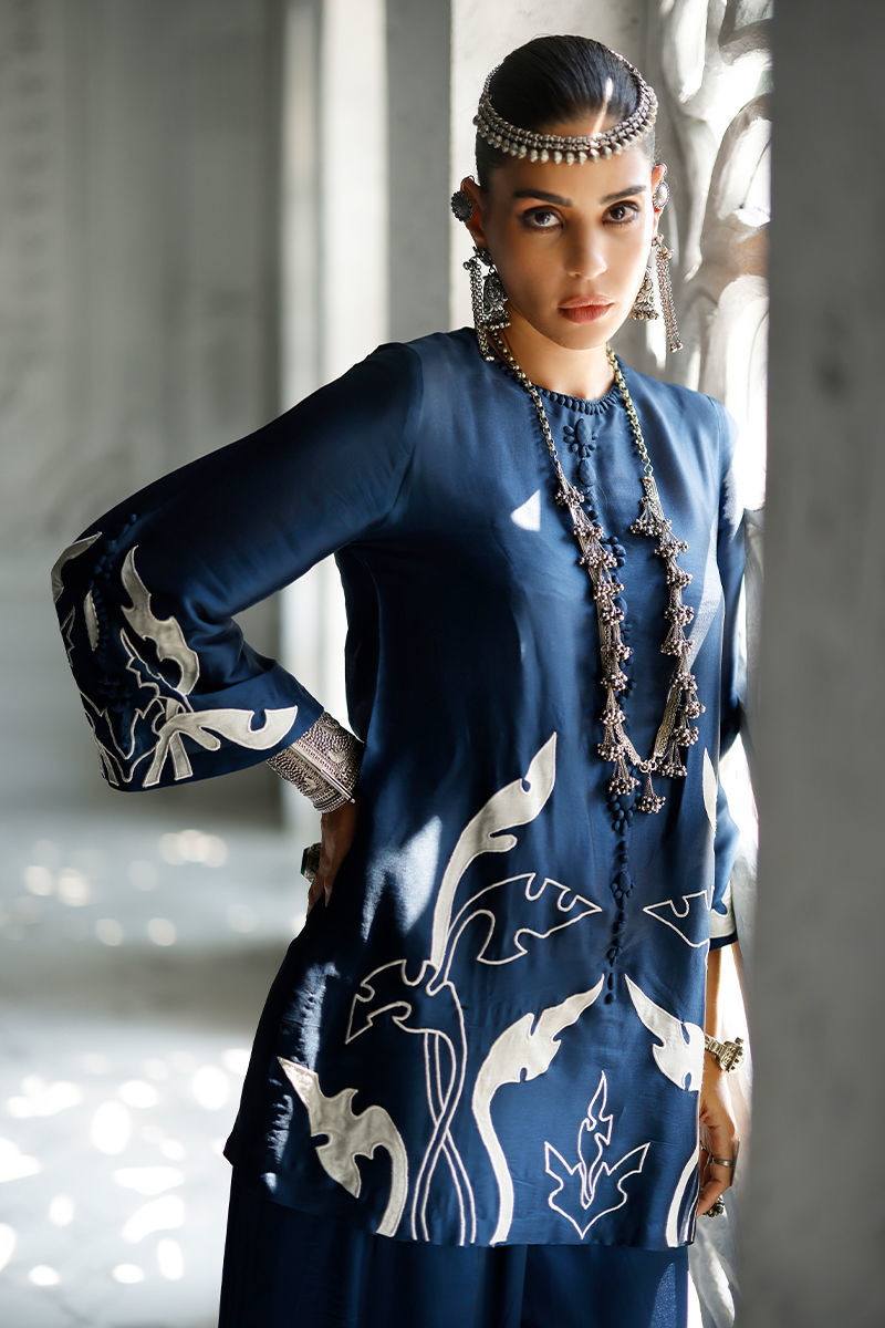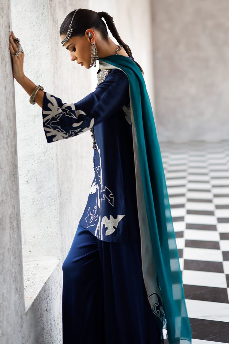 The deep blue short shirt, crafted from butter silk, features intricate self 3D detailing with appliqué work and resham embroidery across the front, back, and sleeves, creating a richly textured and refined look. It is paired with fluid cotton charmeuse balloon pants for effortless elegance, and completed with a sea green shisha organza dupatta adorned with appliqué work and resham embroidery, adding a graceful and elevated finish.