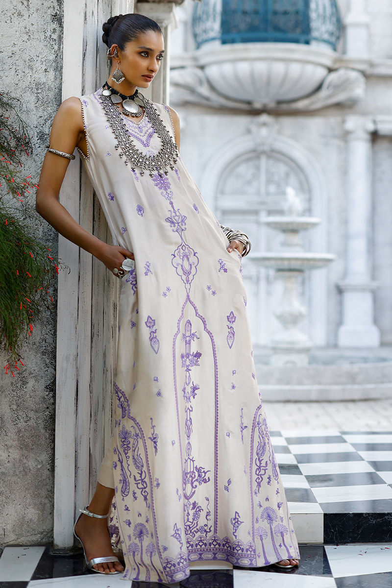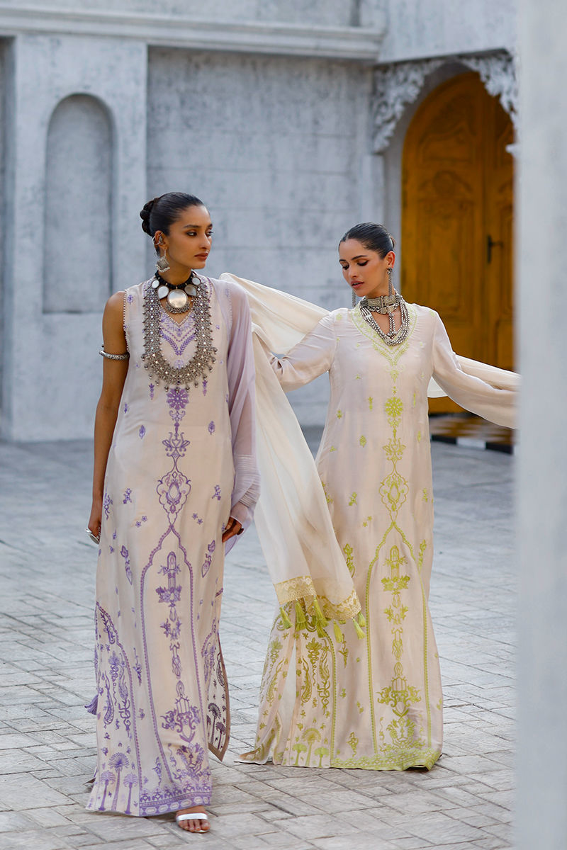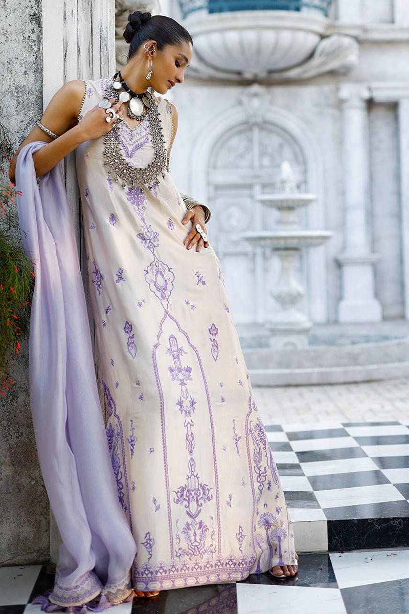 The butter cream kaftan with pockets, crafted from butter silk, features intricate aari embroidery and delicate handmade hangings on the front and sleeves (sleeves optional for styling flexibility). It is paired with cotton charmeuse pants for effortless elegance, and completed with lilac shisha organza dupatta featuring an aari-embroidered border and handmade tassels, adding a refined and artisanal touch.