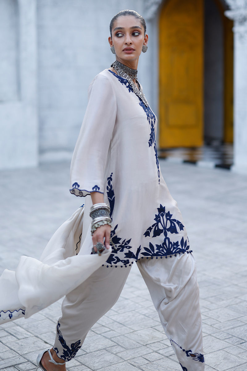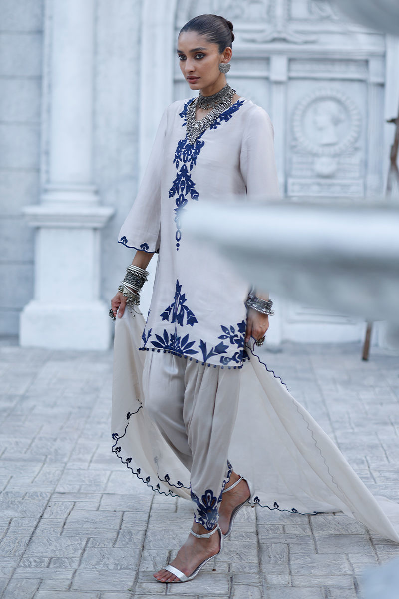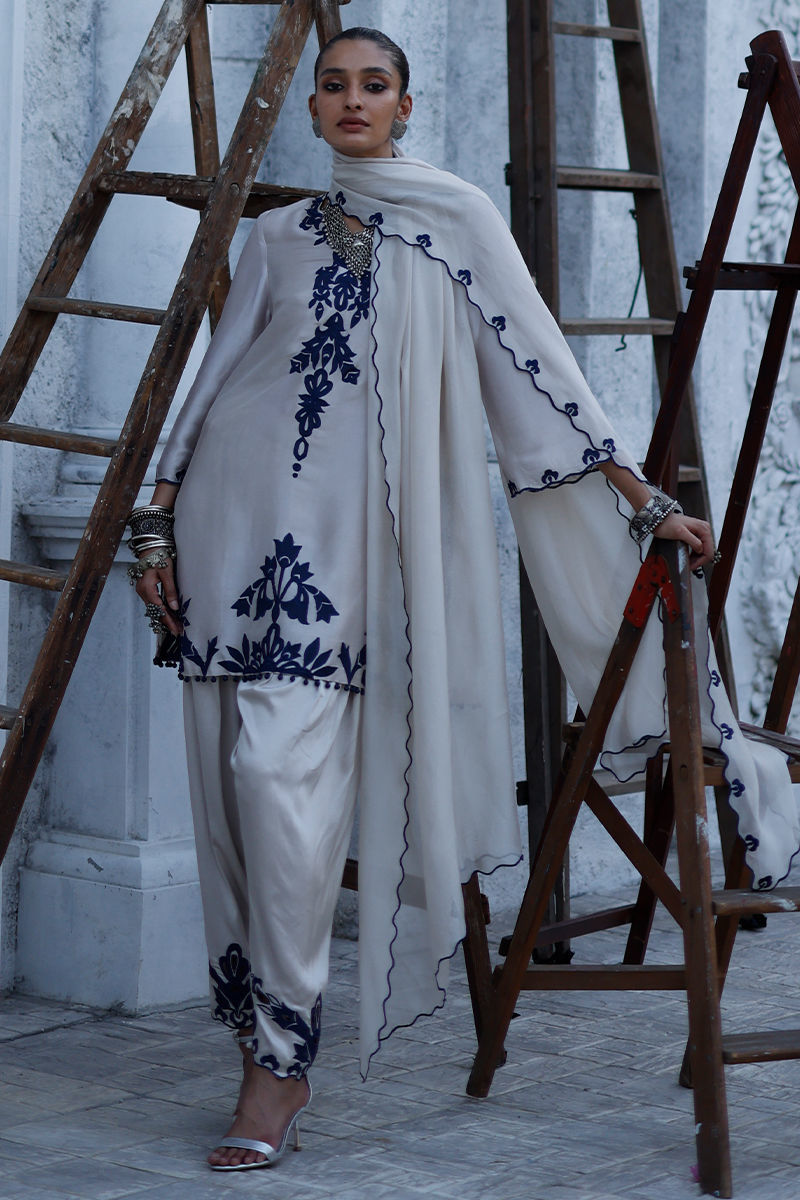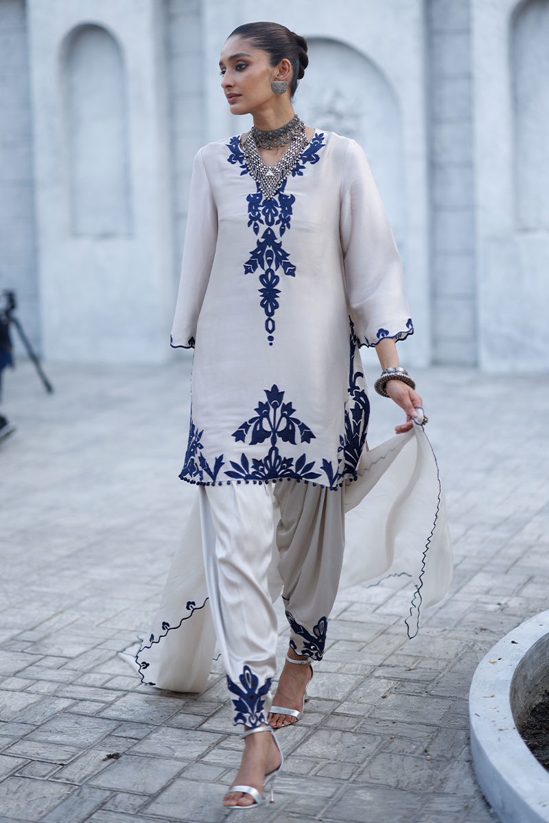 The cloud dancer short A-line shirt, crafted from butter silk, features intricate appliqué work, resham embroidery, and delicate handmade hangings on the front, back, and sleeves, creating a refined and artisanal finish. It is paired with khari shalwar in cotton charmeuse, detailed with appliqué work, resham embroidery, and subtle cutwork for an elegant silhouette. The ensemble is completed with a cloud dancer shisha organza dupatta, featuring resham embroidery along all four sides and scalloped edges, adding a graceful and elevated touch.