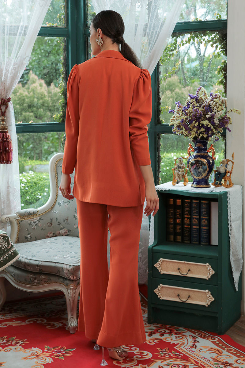 This stunning shade of Tangerine all you need to stand out this season. Cut from western crepe fabric. This will become yours go to for any basic look. Complete your set with same color matching pants and inner (as shown).