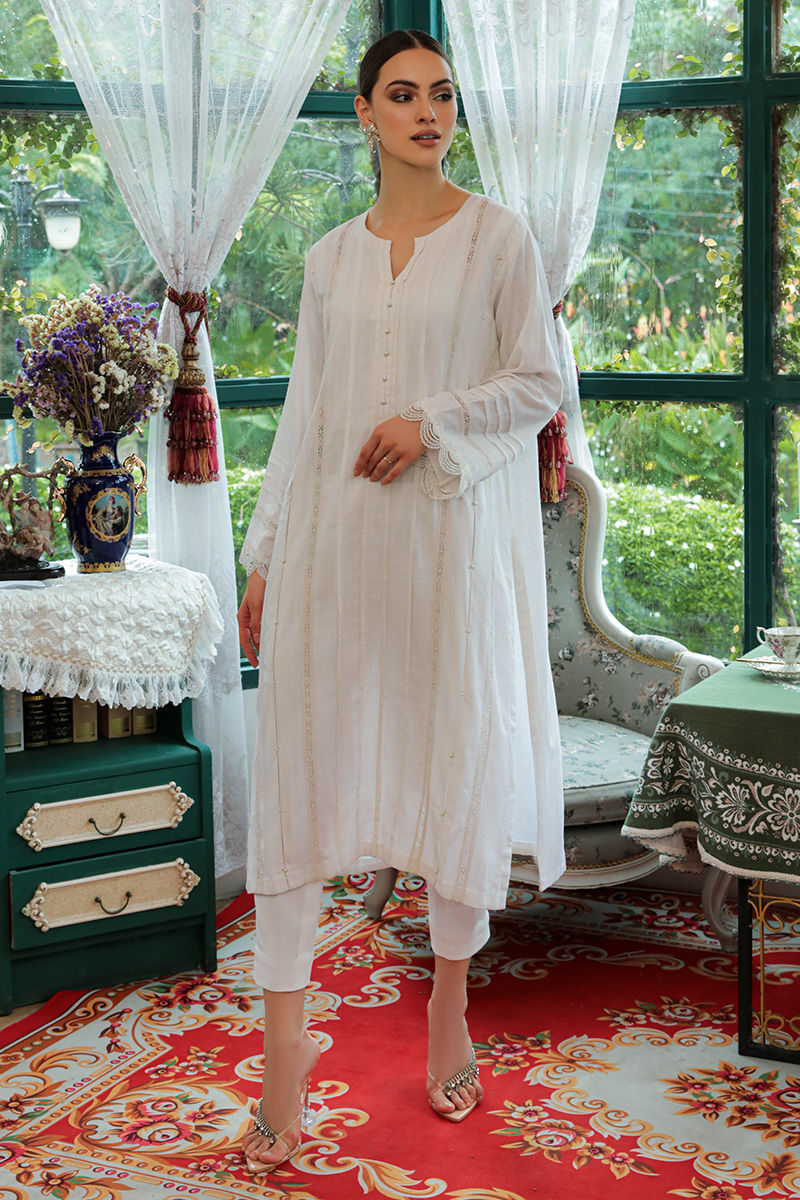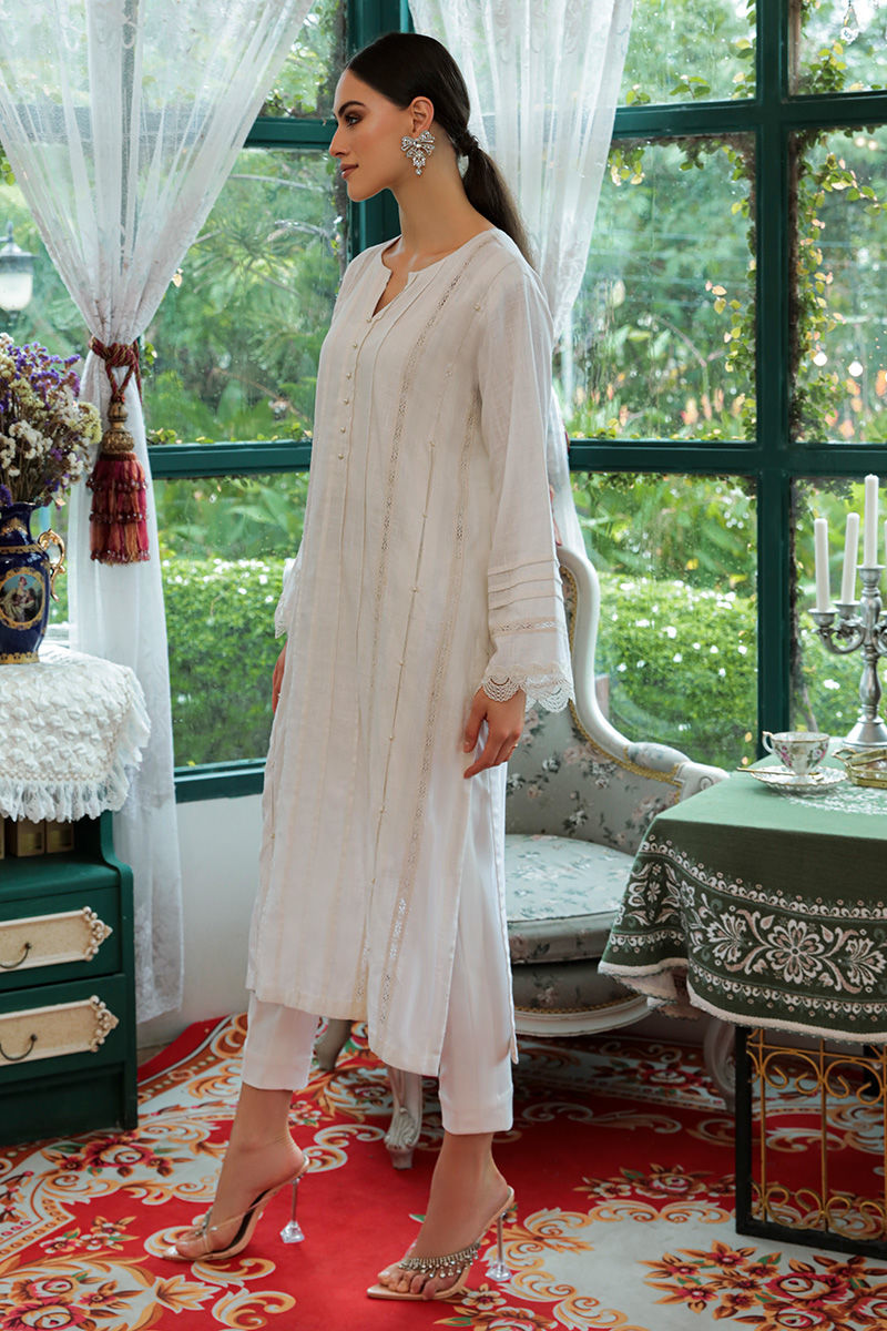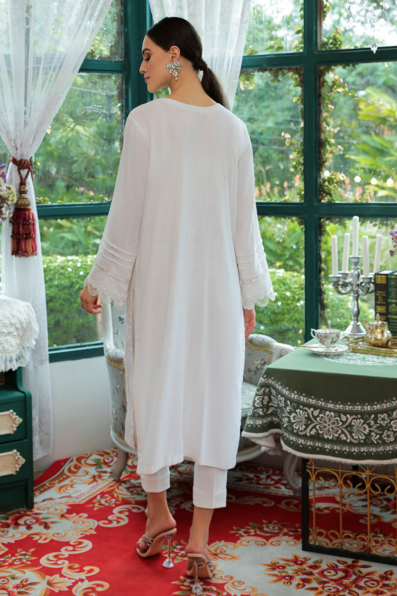 A white kurta in breathable cotton adorned with delicately laces, pleats and embroidery on front and sleeves and pockets on sides. Completed with stretchy western crepe pants.