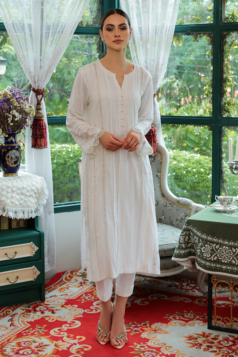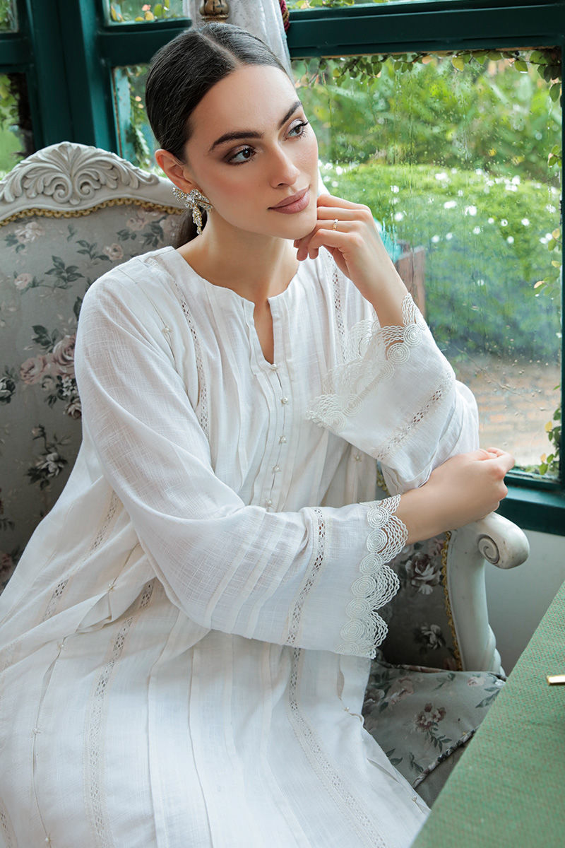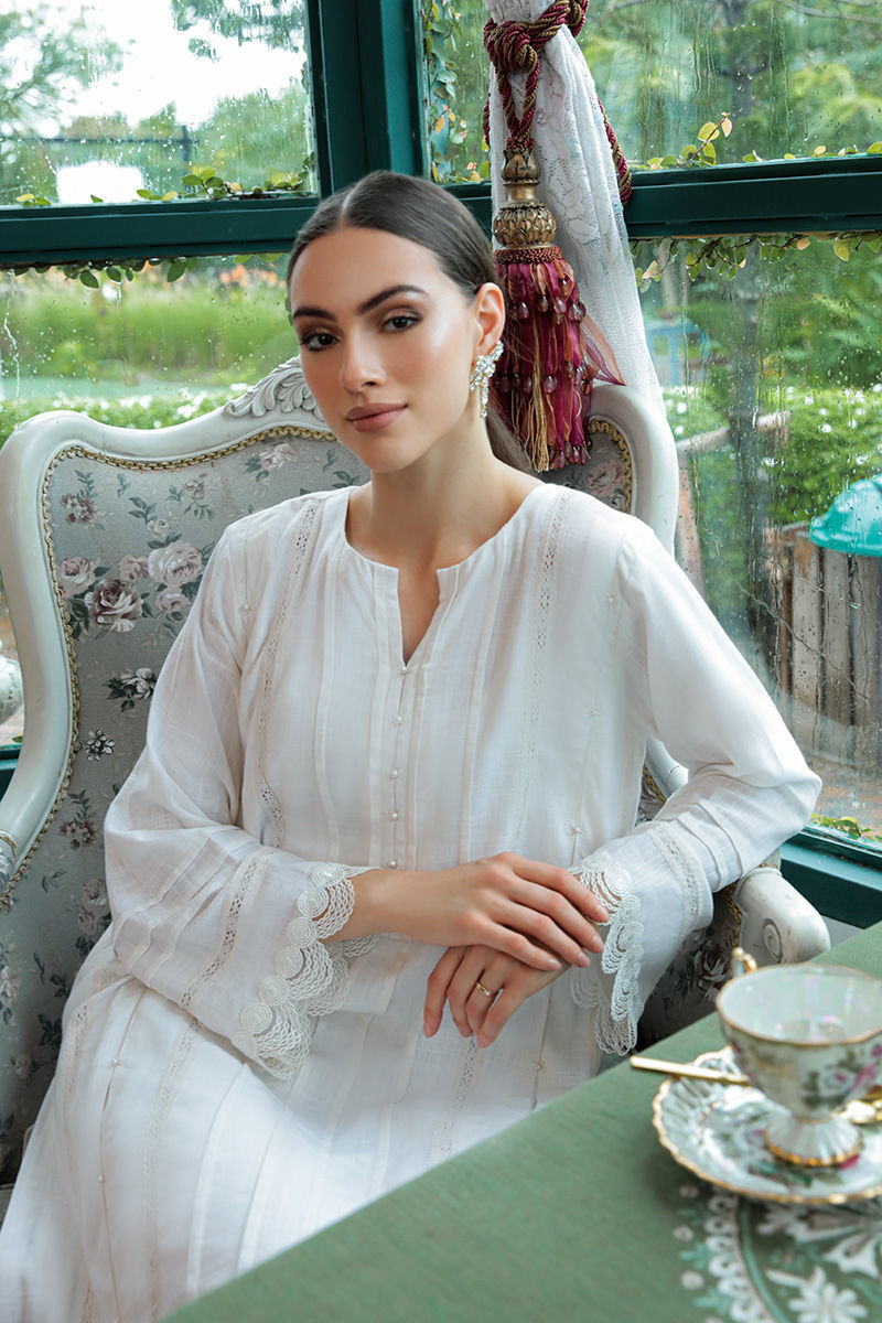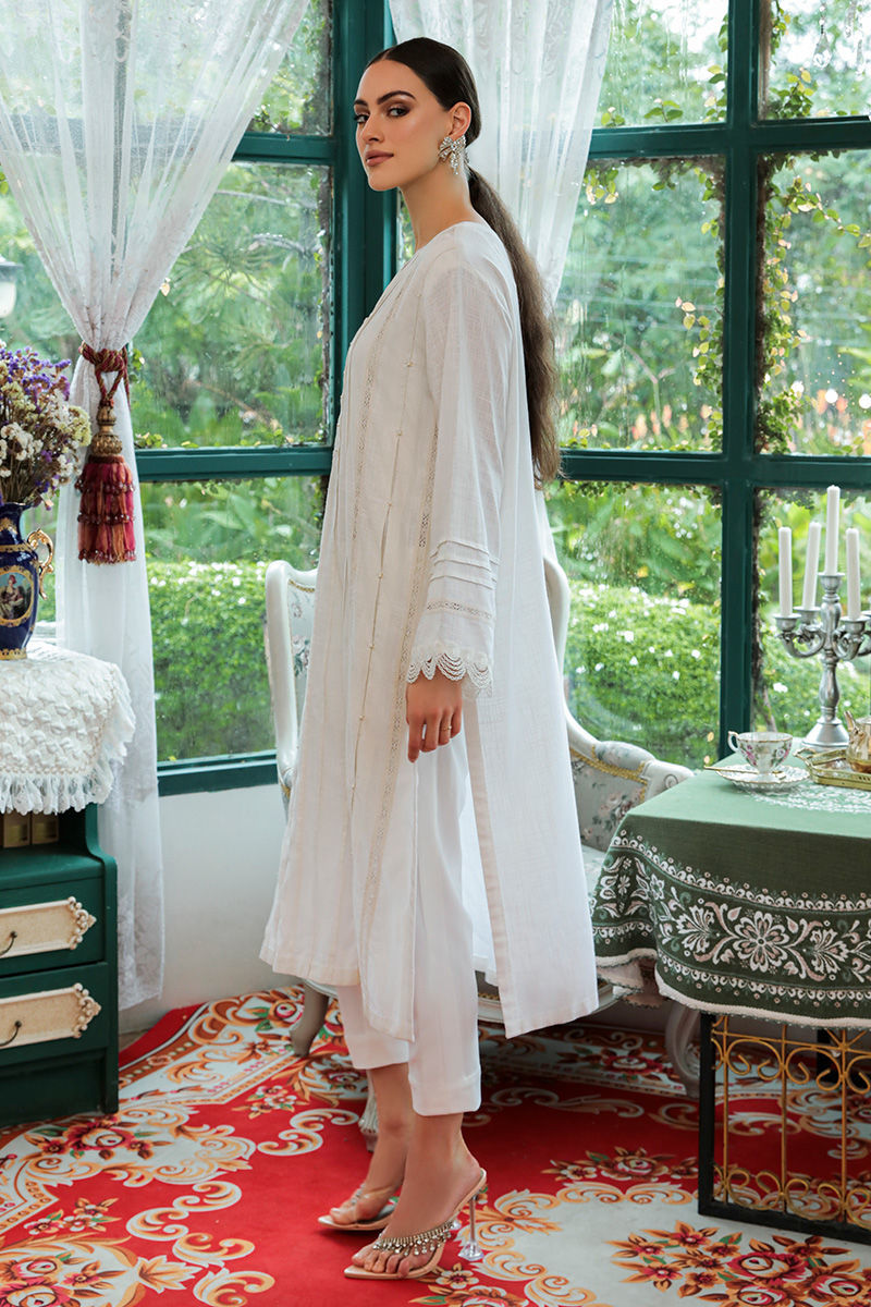 A white kurta in breathable cotton adorned with delicately laces, pleats and embroidery on front and sleeves and pockets on sides. Completed with stretchy western crepe pants.
