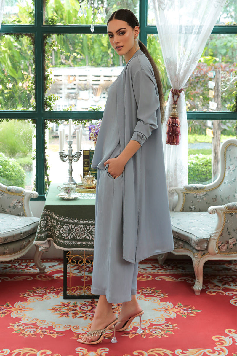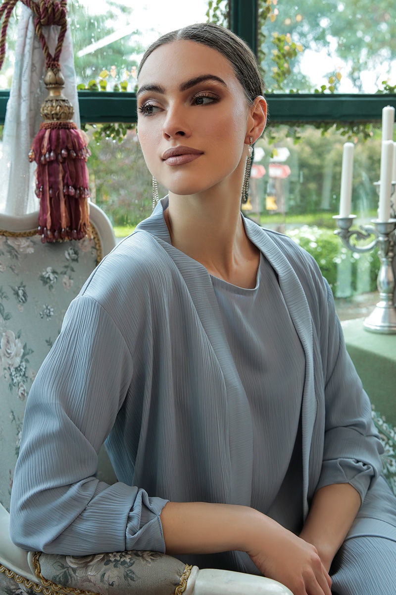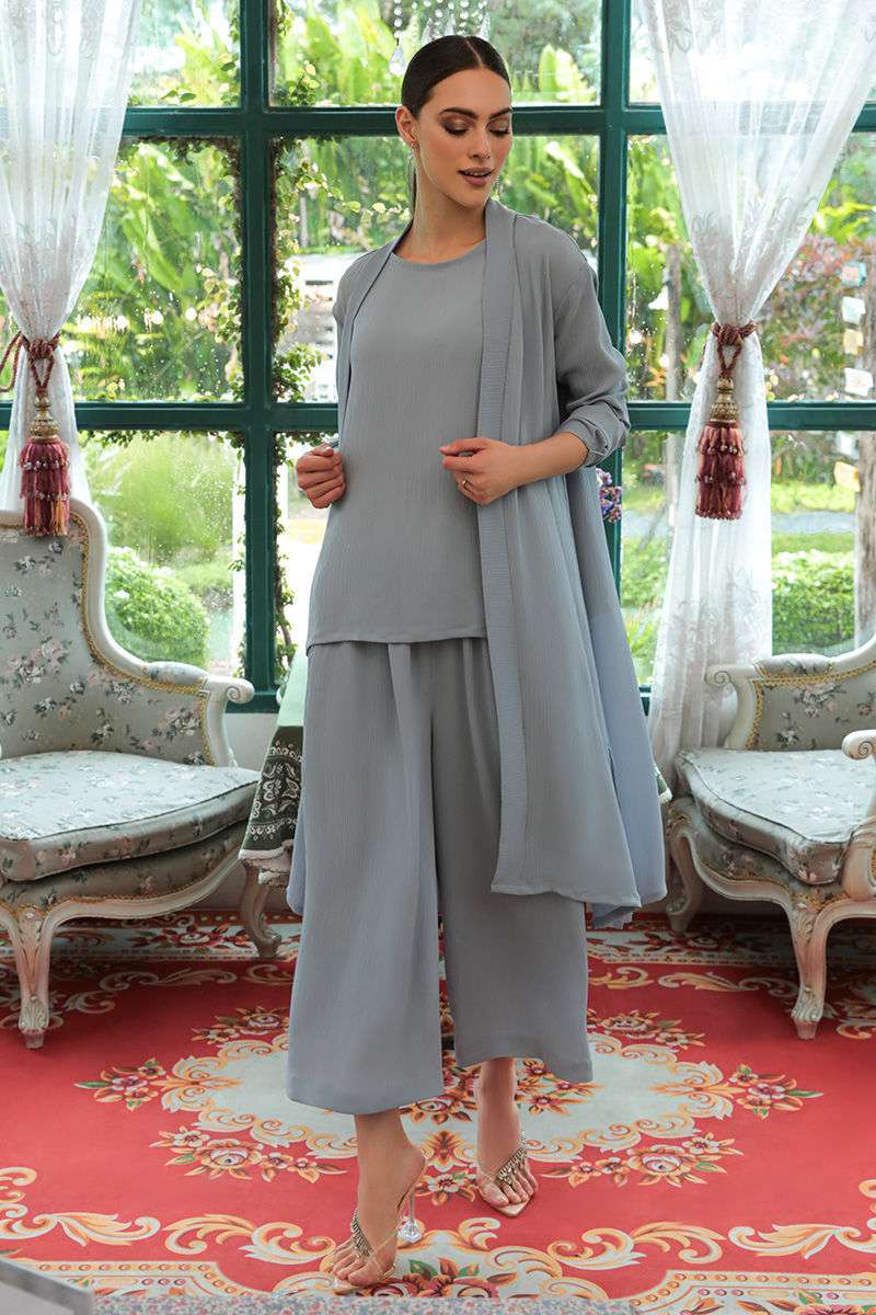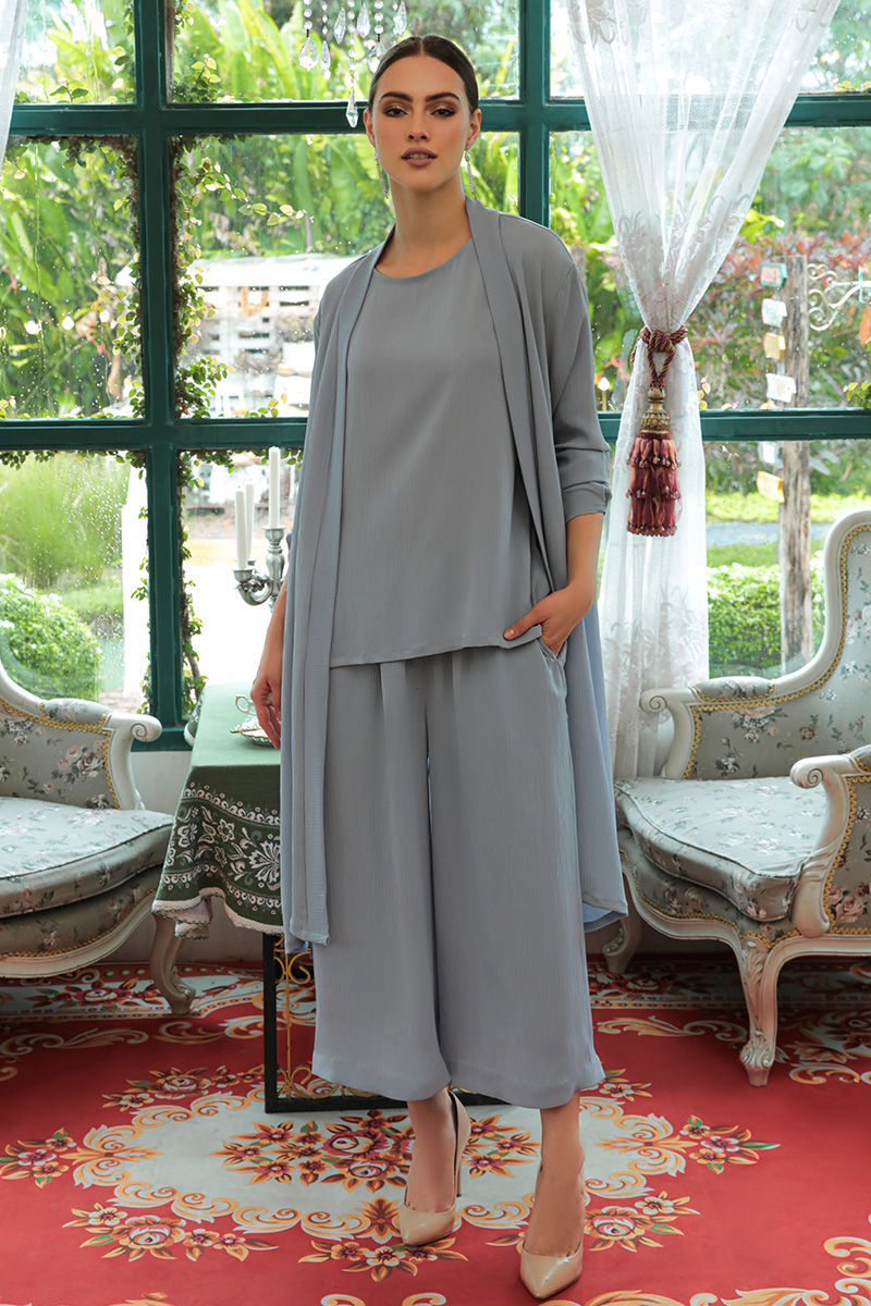 A sky blue ensemble with a delicate long free fall jacket with inner and culottes. Cut from crinkle crepe fabric, this universally flattering silhouette makes this outfit your ultimate solution to all occasions, big or small.
