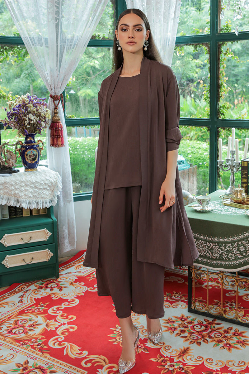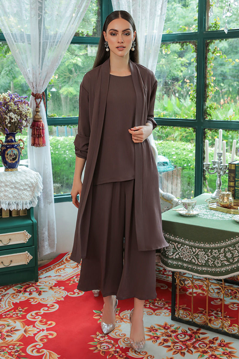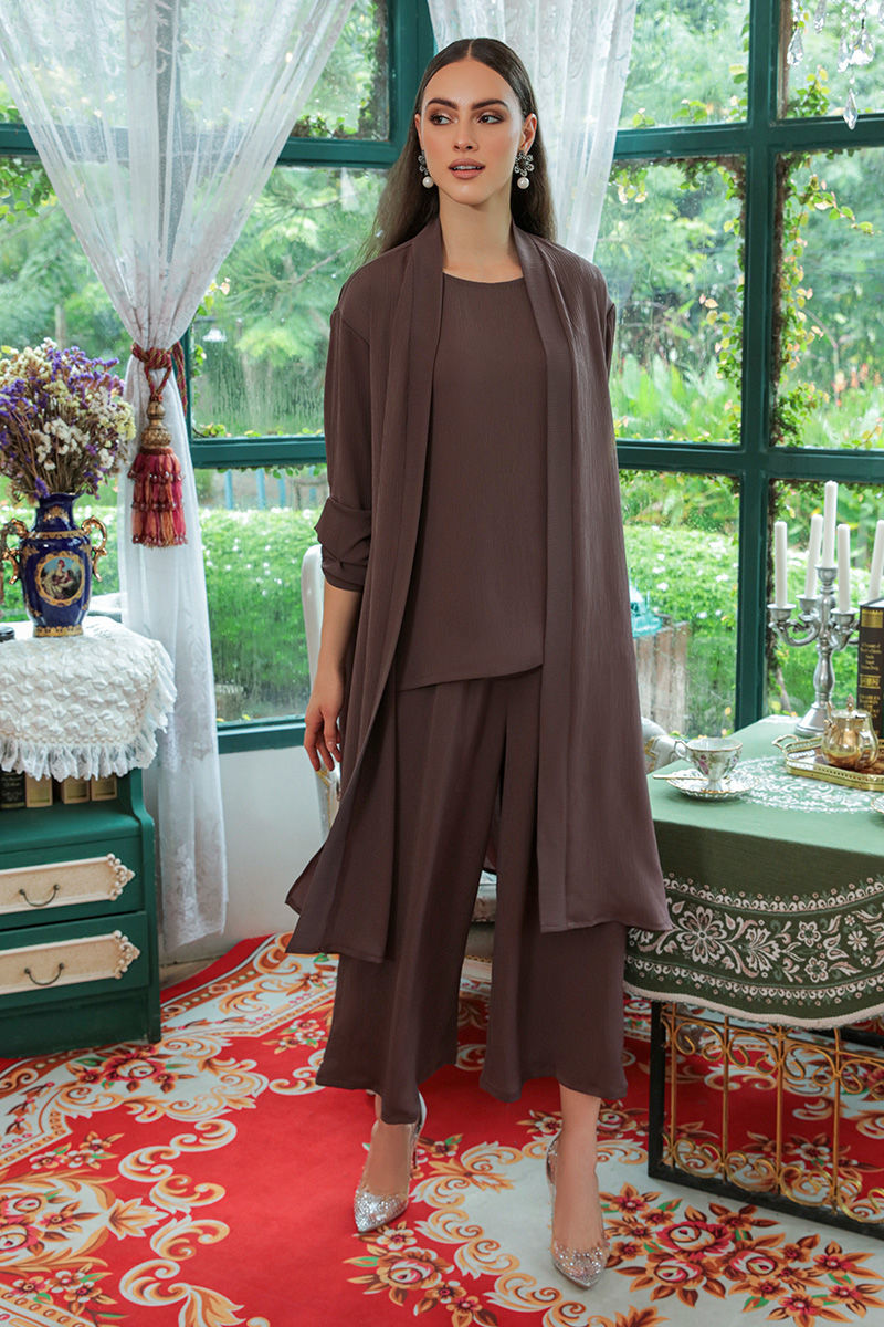 A rock ridge ensemble with a delicate long free fall jacket with inner and culottes. Cut from crinkle crepe fabric, this universally flattering silhouette makes this outfit your ultimate solution to all occasions, big or small