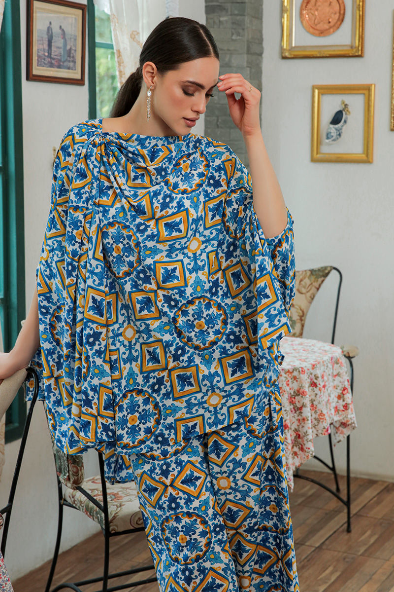 Cut from soft light weight crepe pure raw silk, this set is a refreshing blue, printed with blissfully delicate florals. A universally flattering relaxed fit is made even more appealing with playful, sleeve cuffs. The collar neck makes this floaty, feminine set even more charming.
