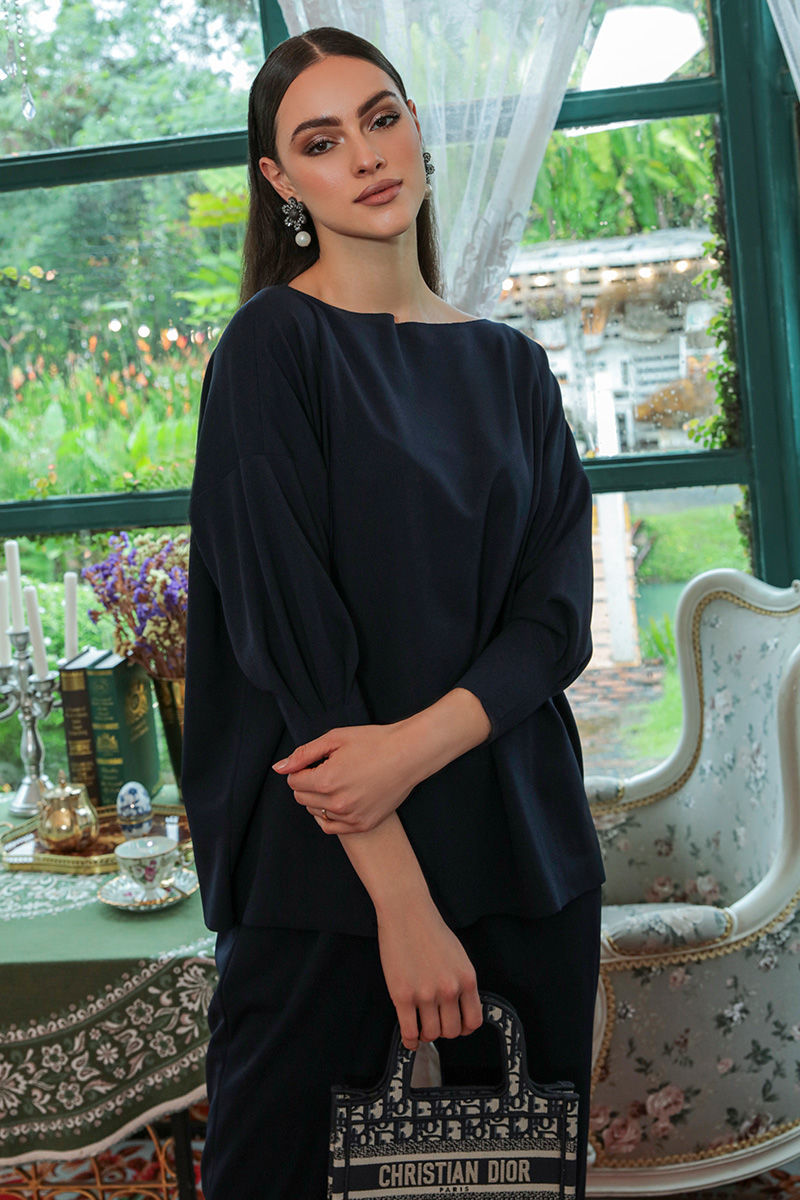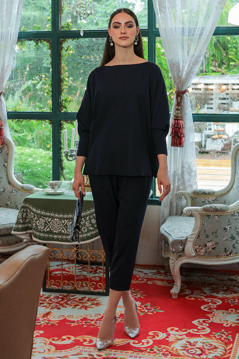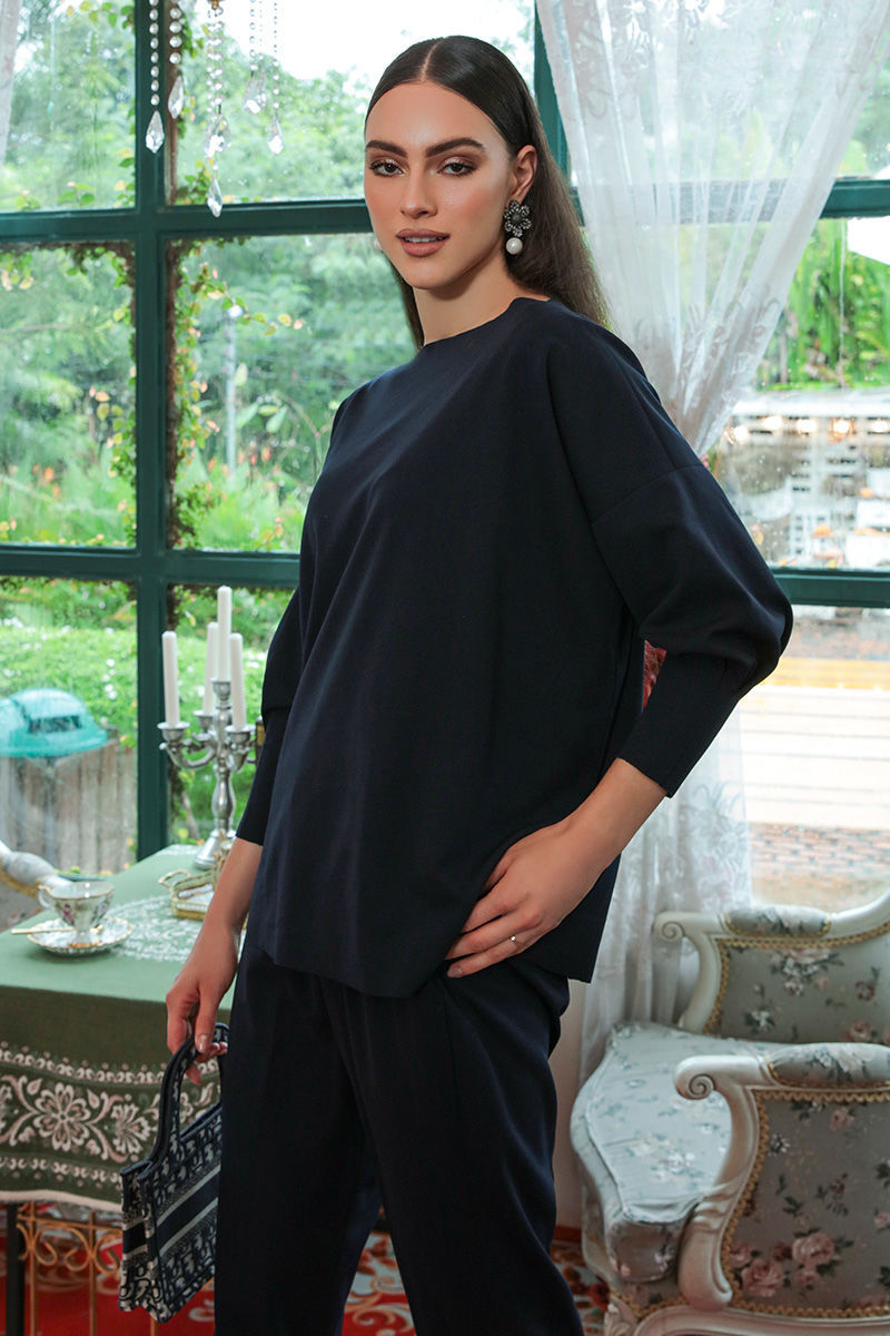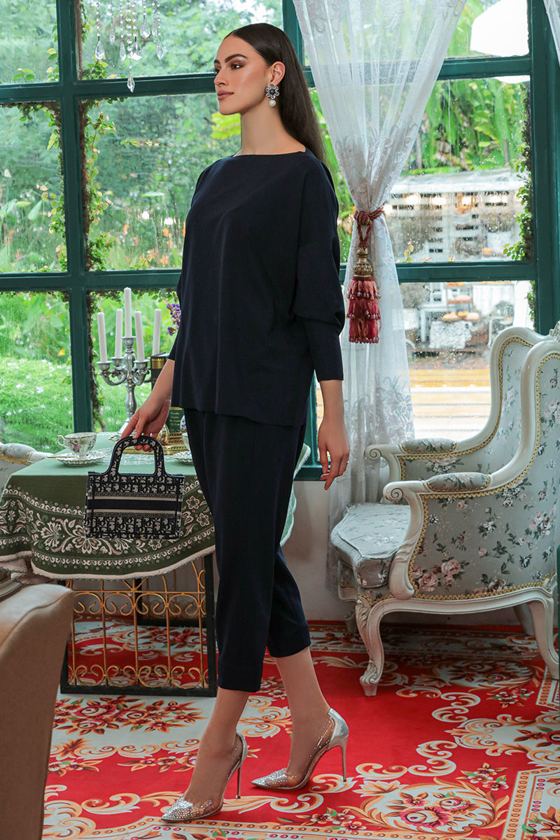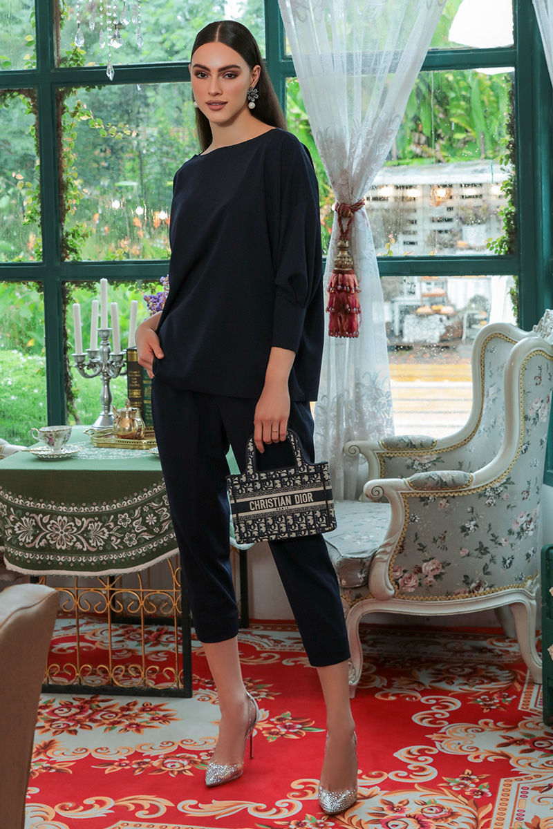 A navy blue separates in stretchable western crepe fabric with full sleeves and boat neck. Complete your look with high heels and heavy earing.