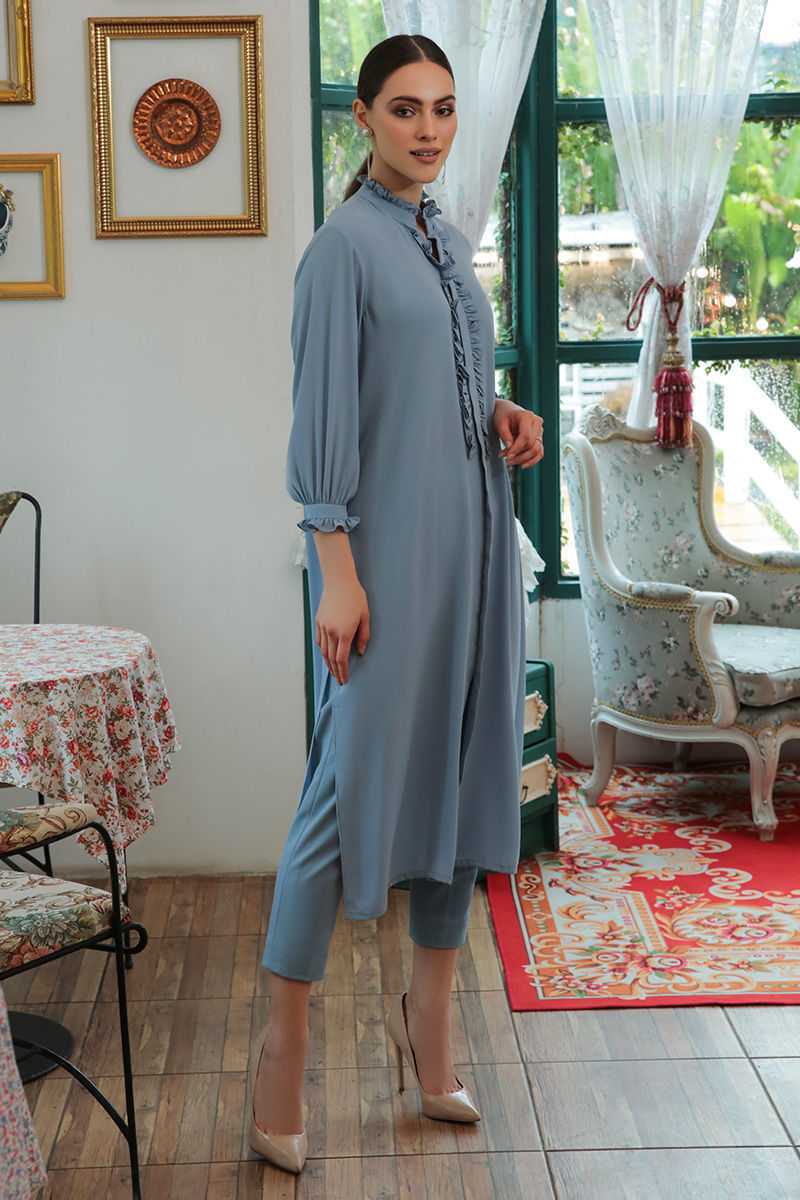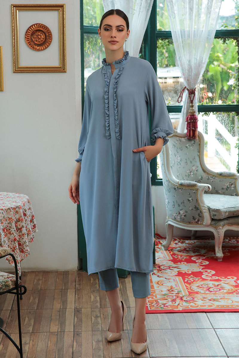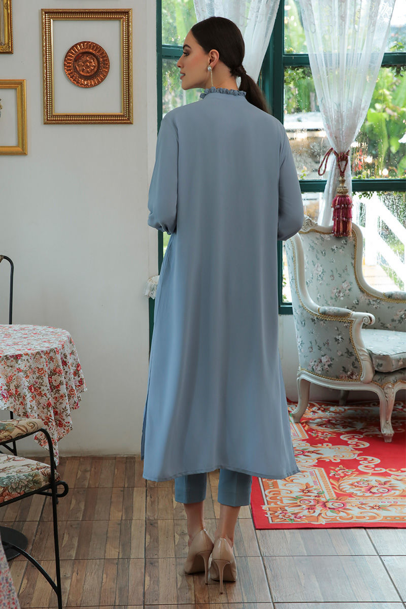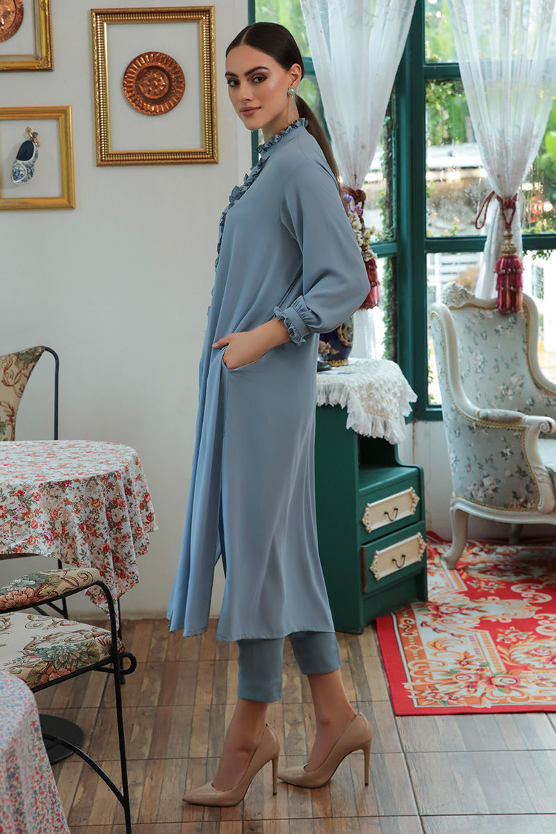 An eye-catching mineral blue kurta in fall summer georgette adorned with delicately pleats and fabric manipulation on neckline, pockets on sides and stretchable western crepe pants to finish the look.