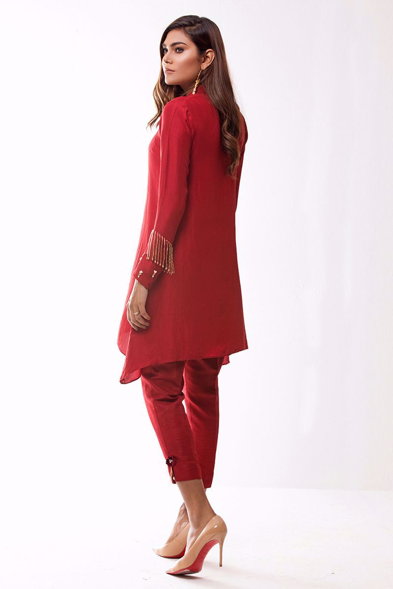 Maroonish Red pure raw silk Kurta beautifully embellished with Indian jeweled motifs on front and trendy handwork on sleeves