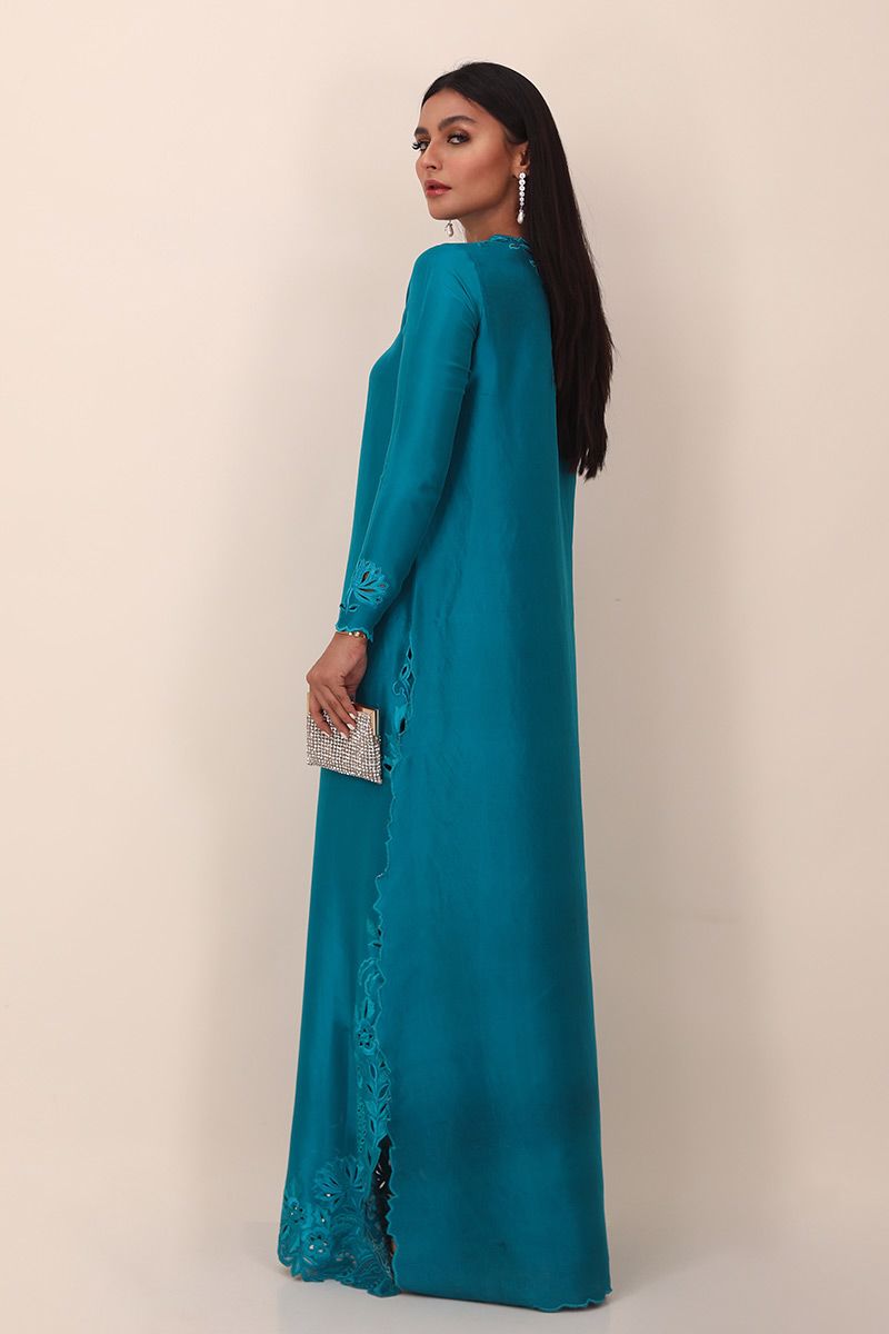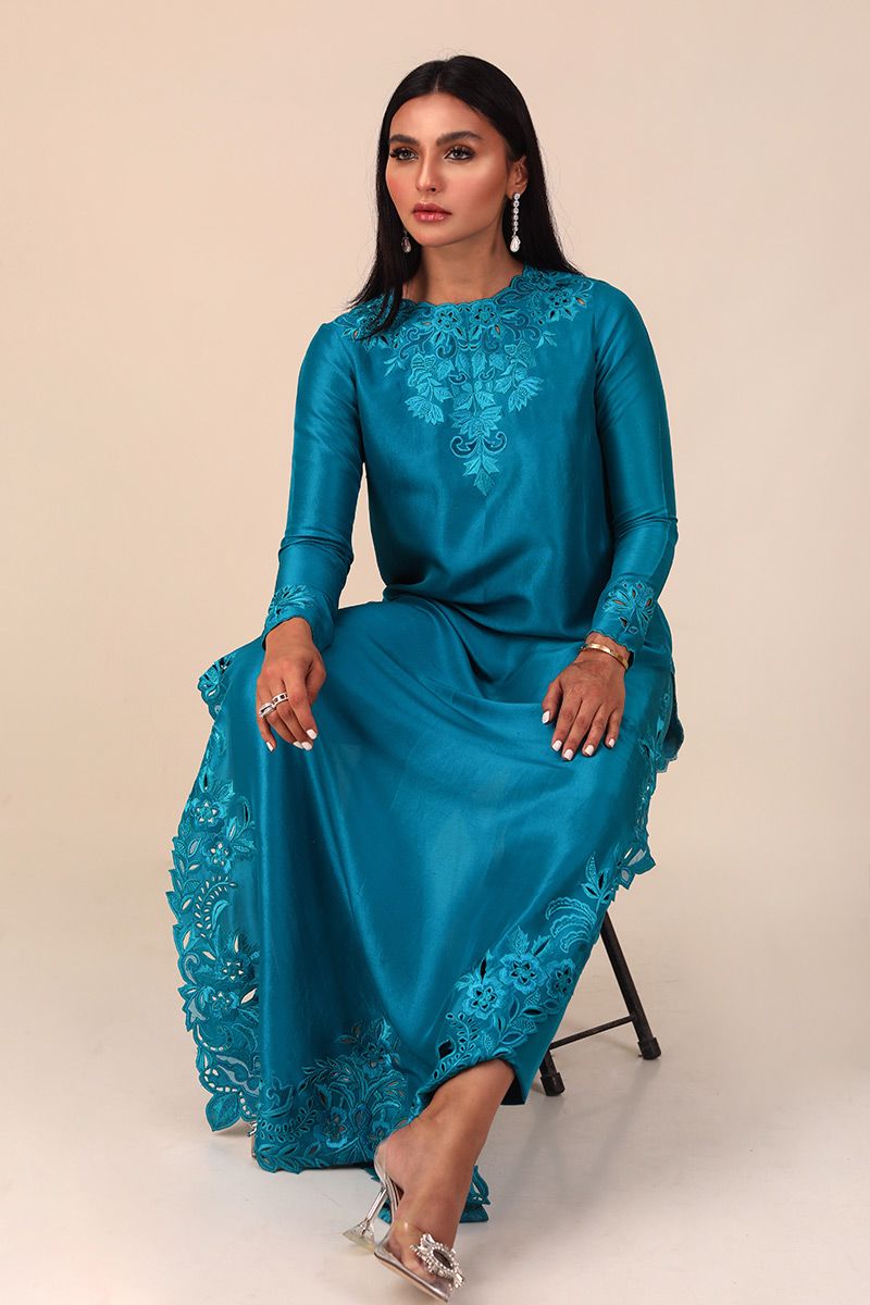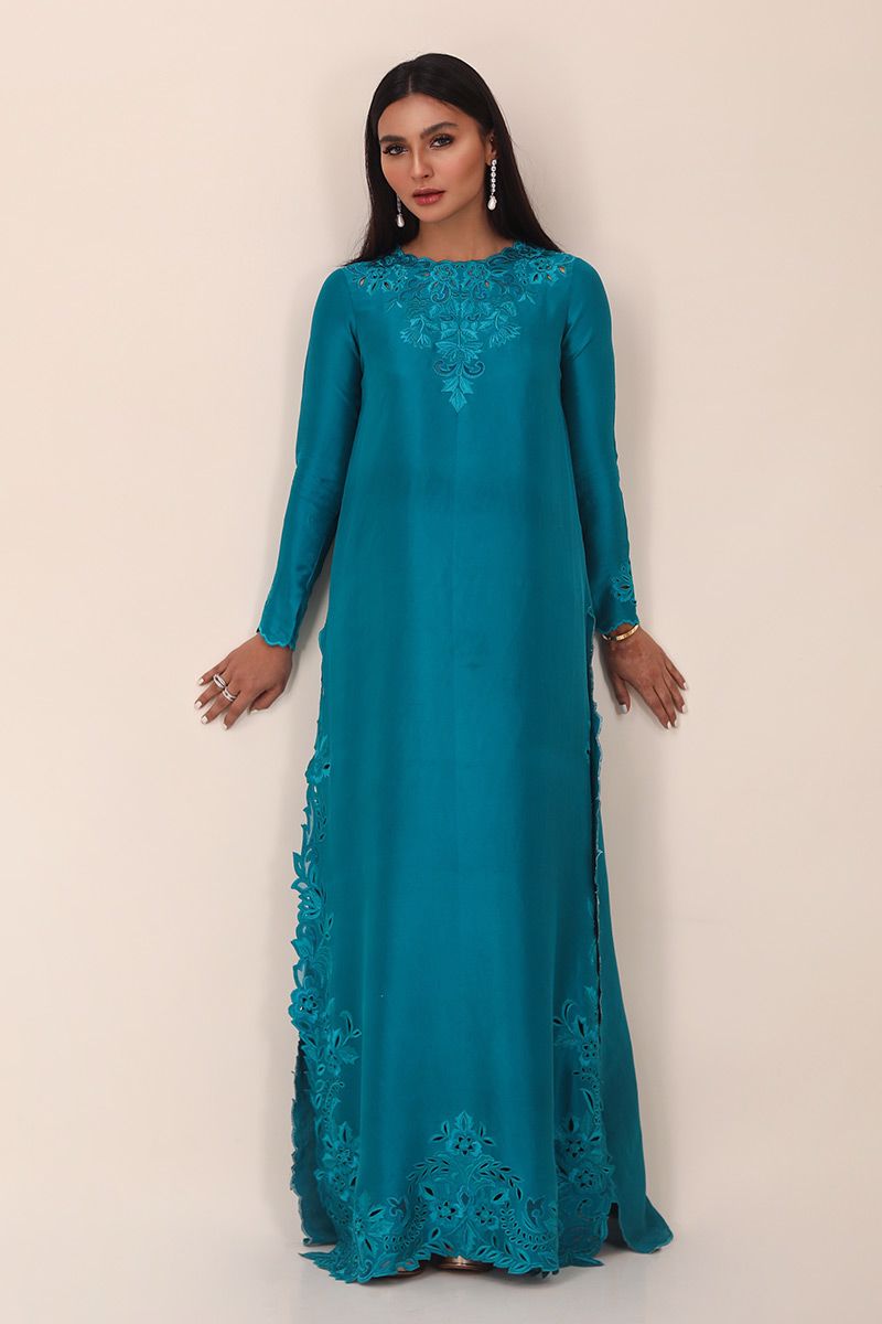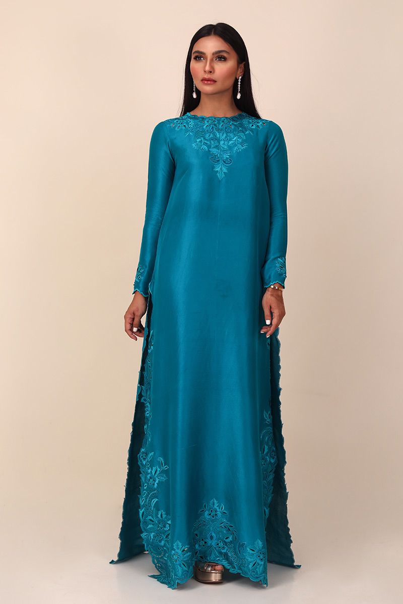 A deep peacock long pure raw silkĀ  floor length shirt designed with intricate thread work of resham and organza comprising of various stitches making a floral pattern with cutwork on all over the shirt maintaining the classic look. To complete of the look same color pure raw silk pants is paired and can be purchased separately.