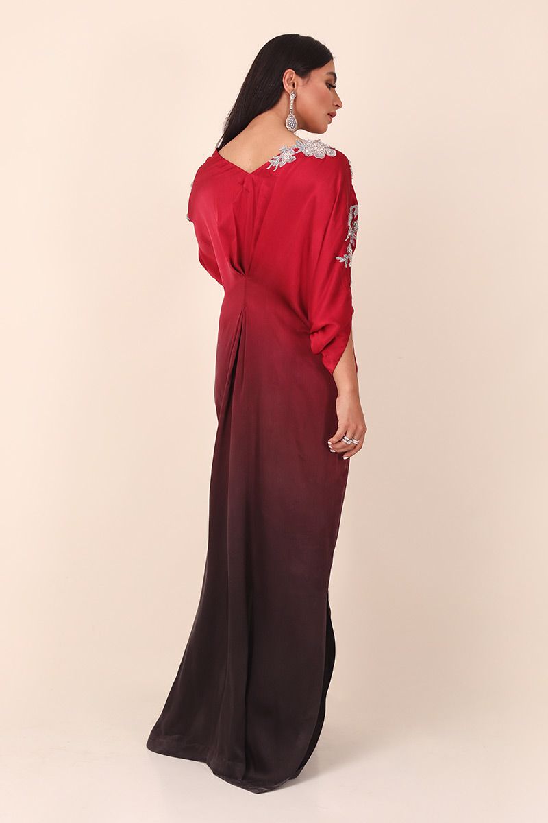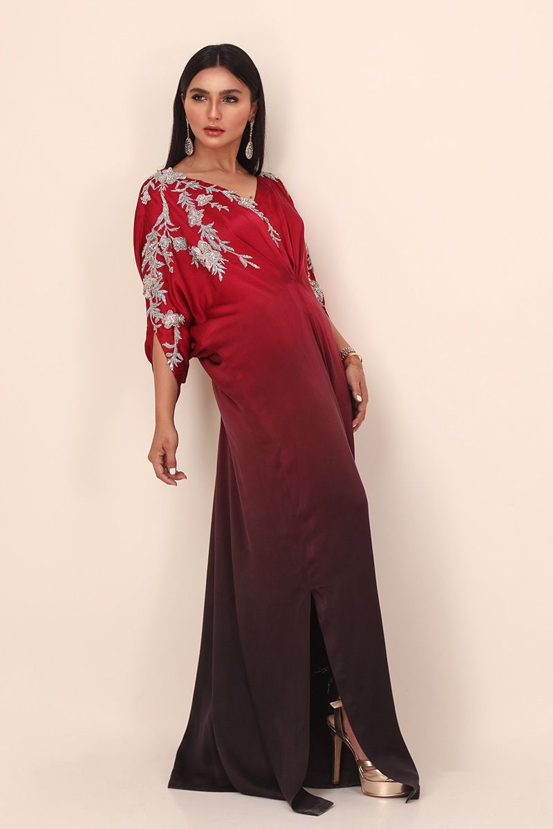 A beauteous pure charmeuse kaftan in ombre style crimson shines in the crowd. The exquisite embellishments around the neckline comprises of resham floral with 3D ornaments of pearls, cutdana, sequence and stones scattered along the torso.