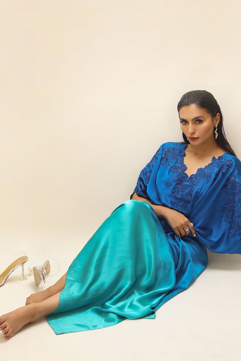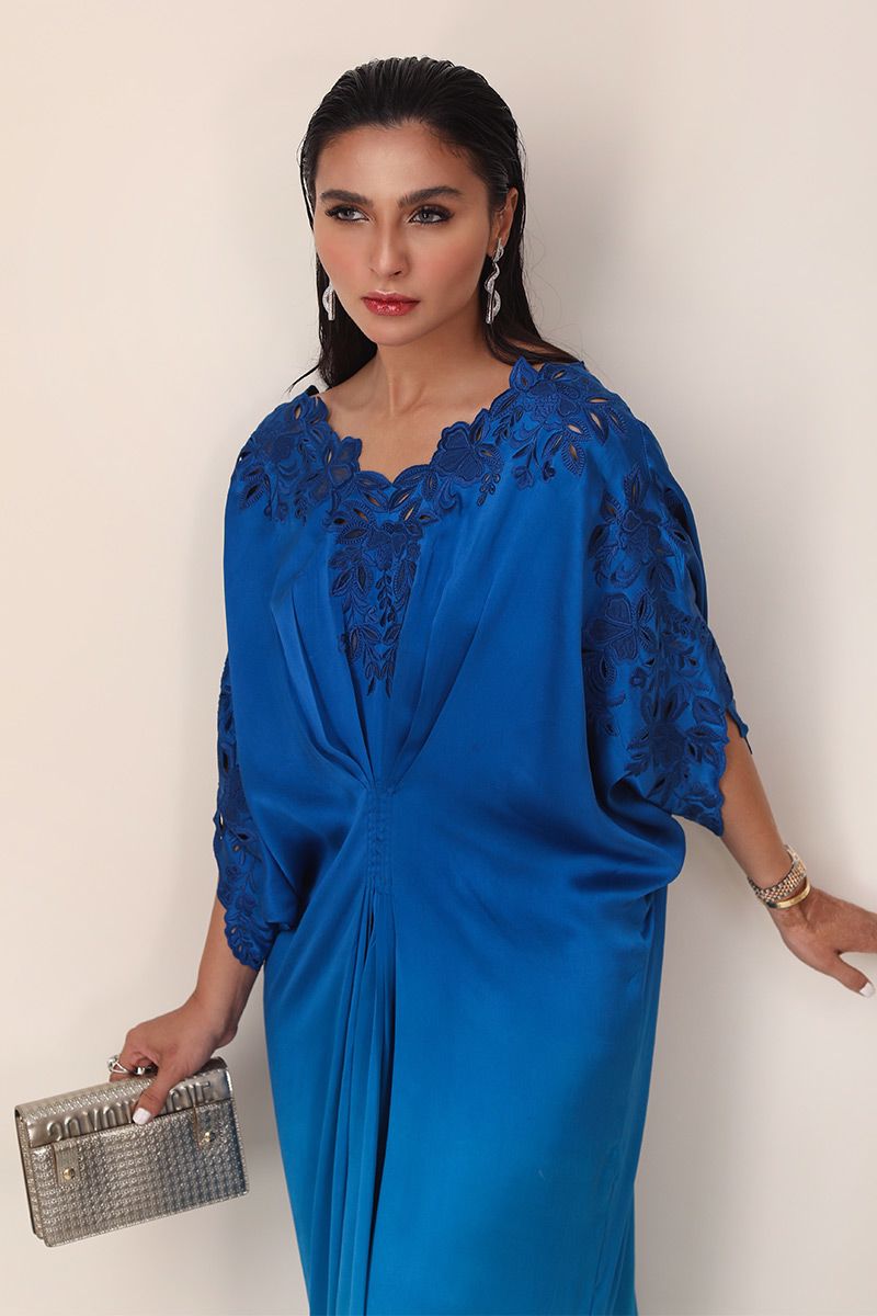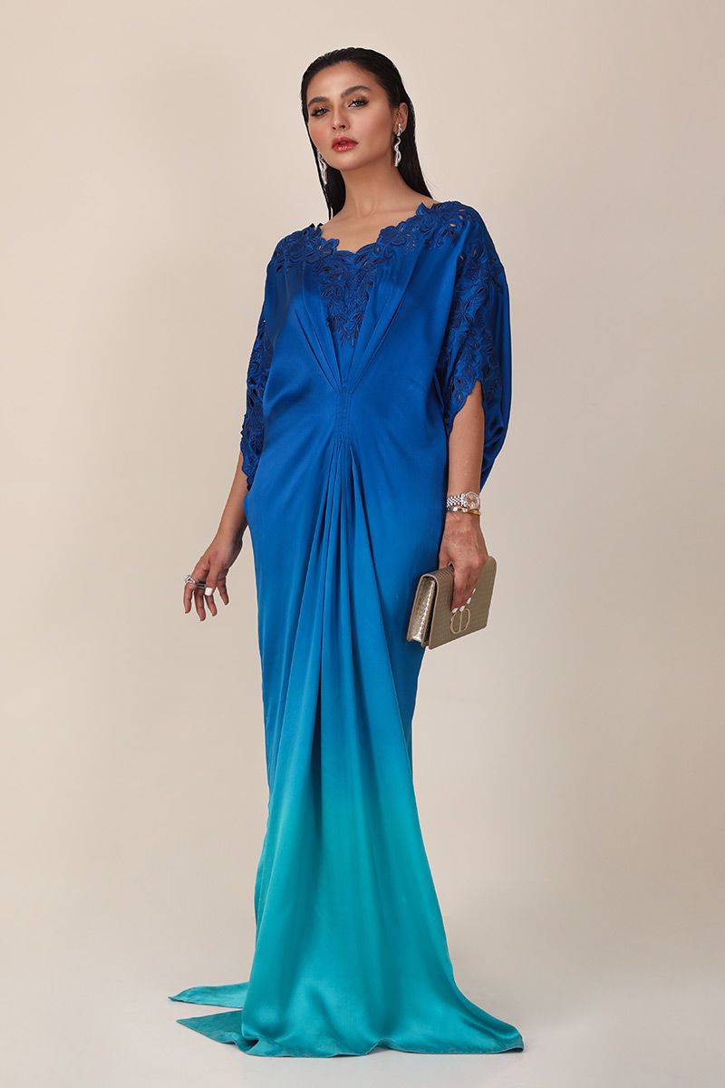 The new age blue ombre style charmeuse kaftan with contemporary V-neckline. handcrafted with floral embroidery of resham and organza creating the elegant cutwork. Pleats on the waist gives the body a perfect hour glass shape. The outfit is uplifted with 3D  embroided bird on the back.