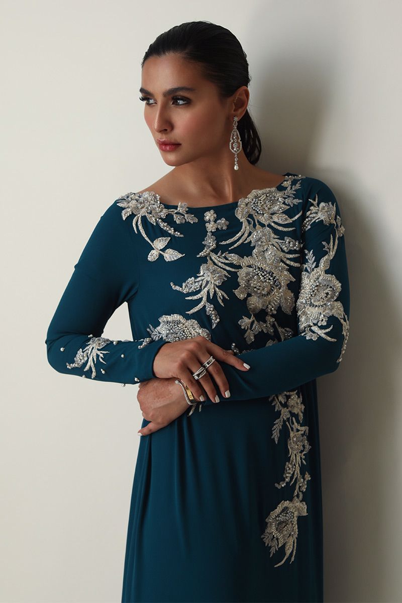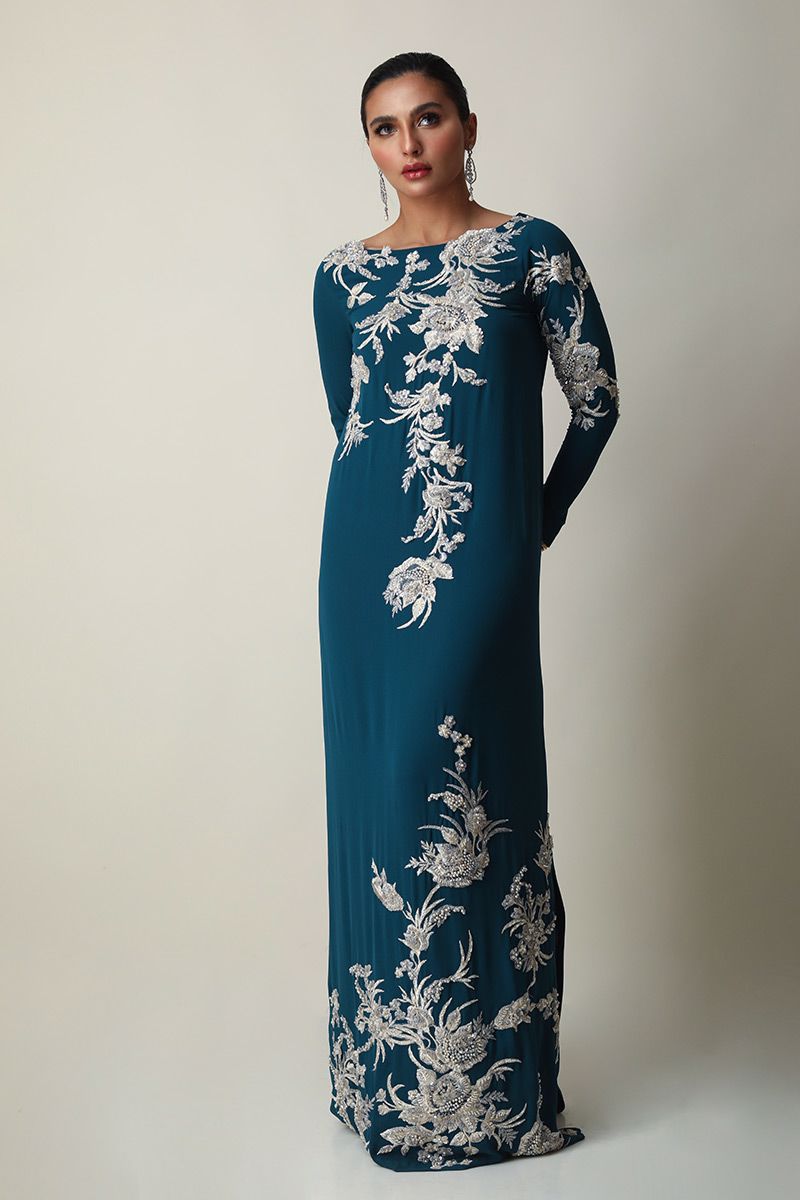 Teal always being a classic once again stands out in the crowd. This georgette kaftan is stare worthy. The hues of ivory resham, cutdana, sequin and bead work is placed carefully forming a soothing eye movement on side front and sleeves
