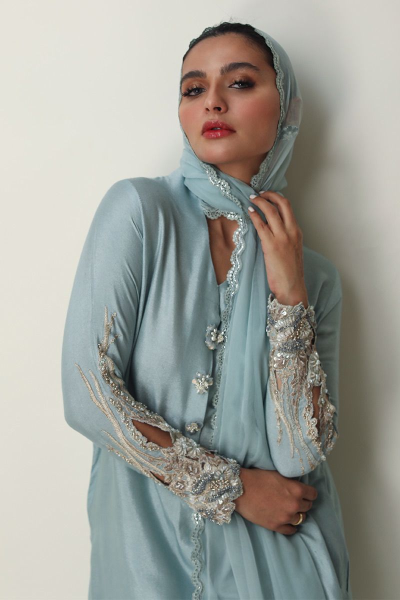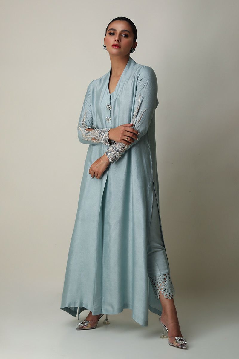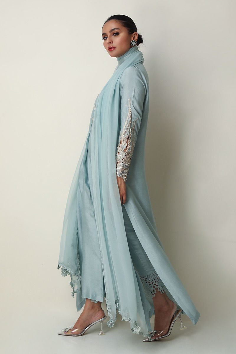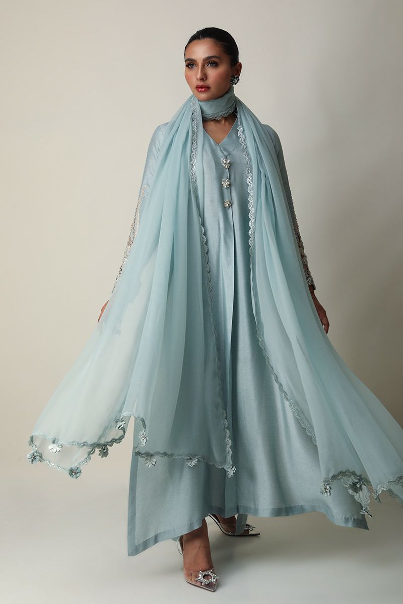A statement of sophistication is shown in the powder blue pure raw silk long shirt. Portrayal of undoubted craftsmanship is witnessed through handmade fabric manipulated motif compromising of crystals and beads towards the front box pleat. The monochromatic rhythm breaks, moving towards the edge of the sleeves with studded ivory crystals, resham, cutdana and pearls embellishments forming a alluring cutwork. The shirt is paired with same color semi pure embellished pants and fancy chiffon dupatta with velvet hanging which can be purchased at additional cost