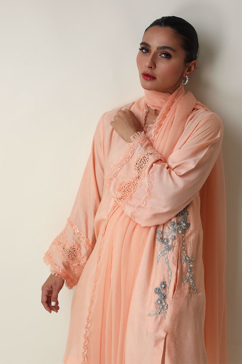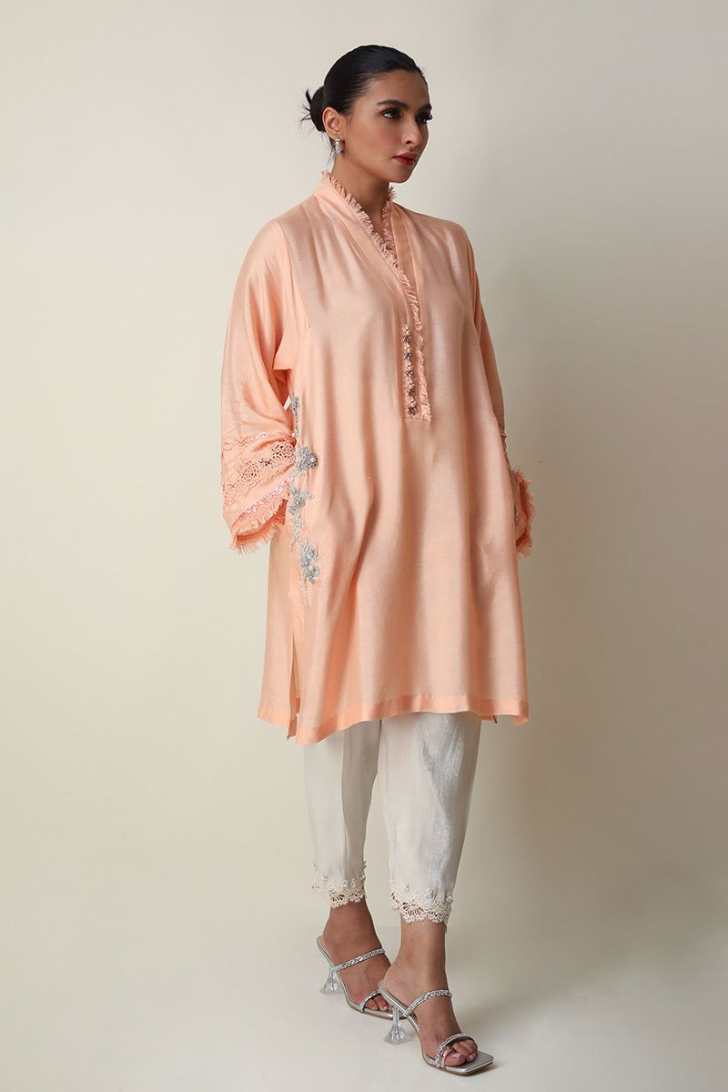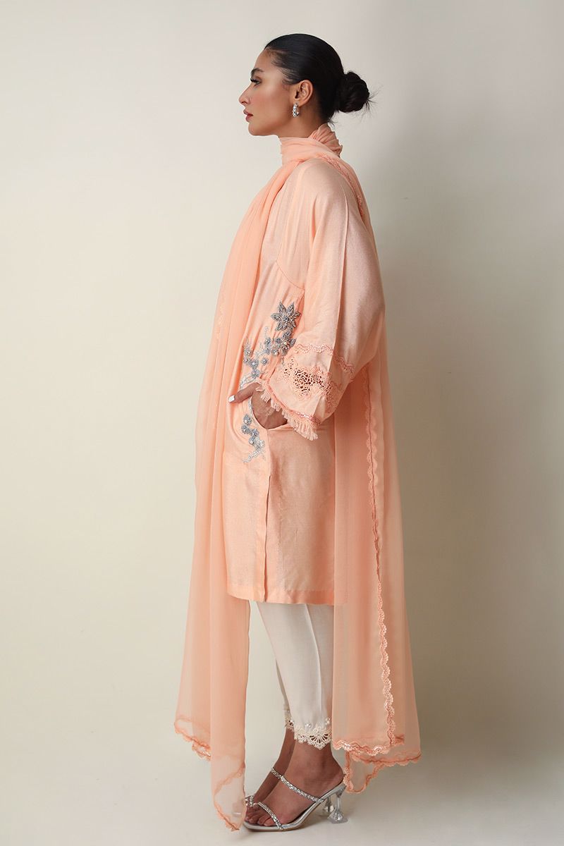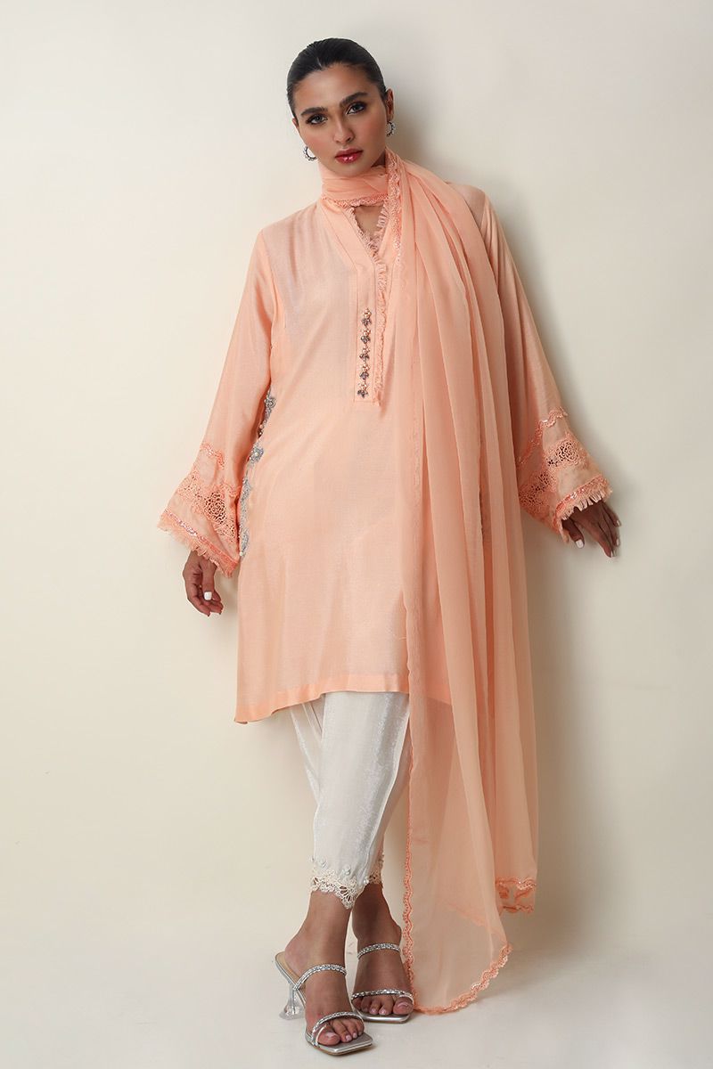 The effortlessly elegant Pure Raw Silk peach nectar short shirt comprises of resham and zari embroidery consisting of pearl, cutdana, sequins and beads highlighting the pocket and back of the shirt. Ivory semi pure skinny shimmer shalwar with edging and chiffon dupatta with bead and fancy edging is paired, to be purchased separately.