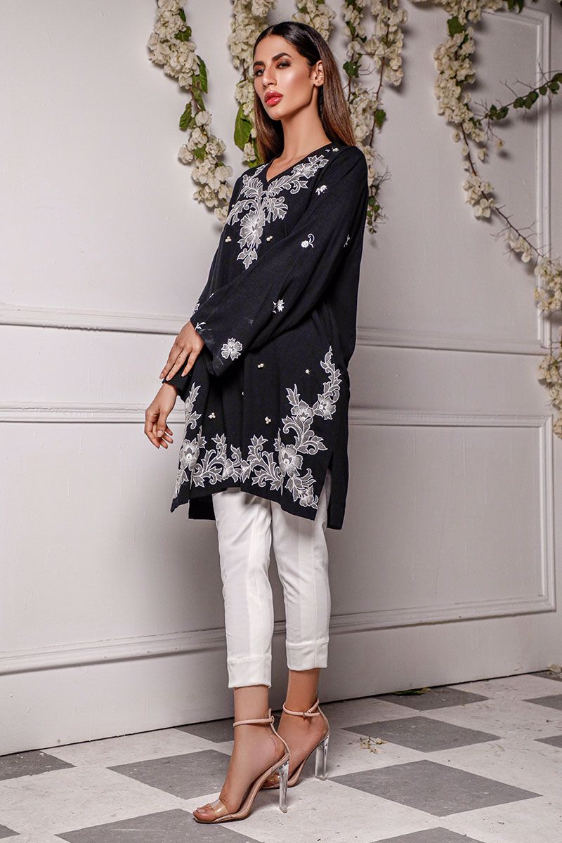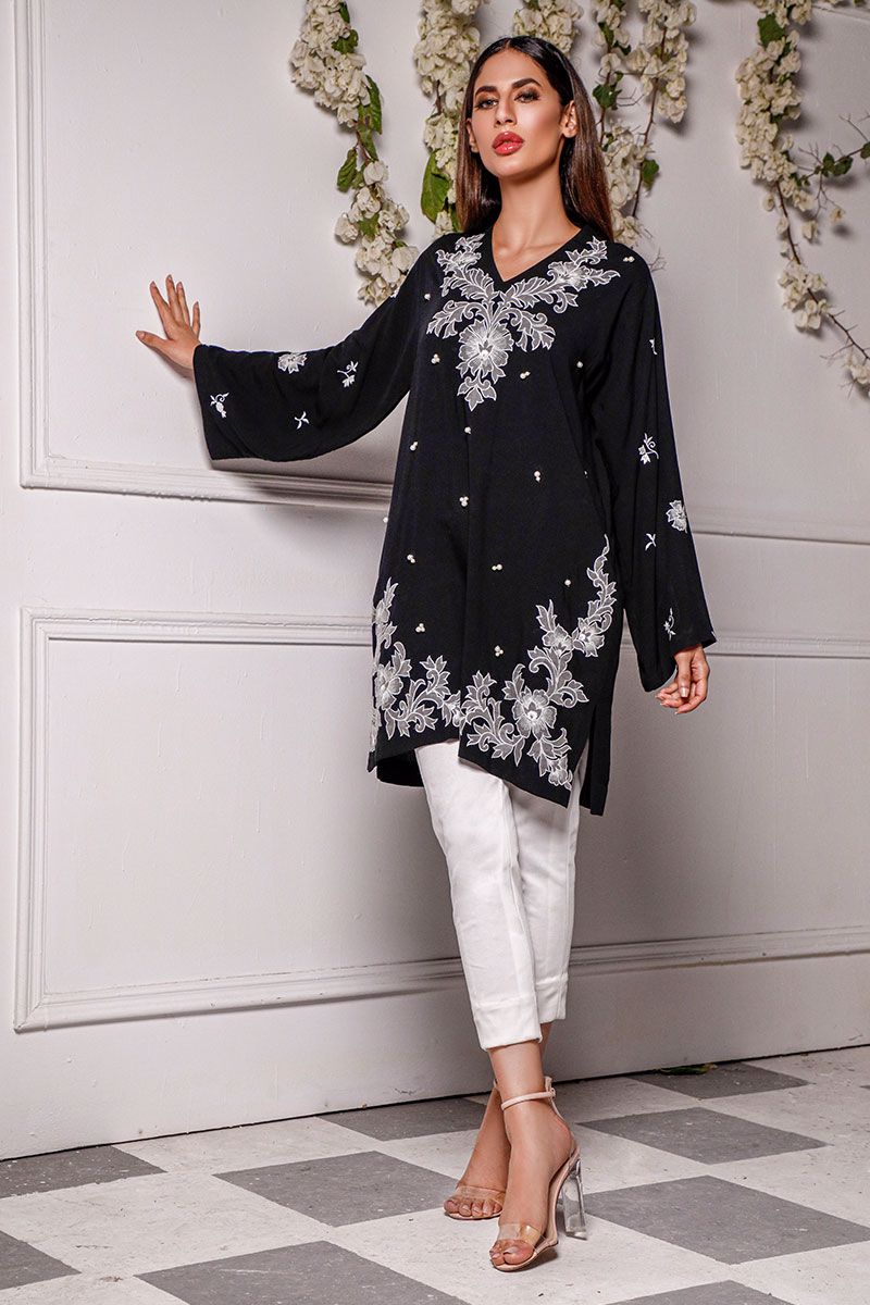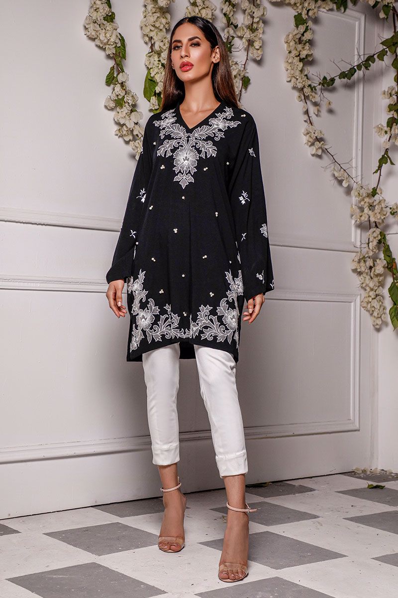 A breezy addition to the summer wardrobe, this black soft linen shirt comprises of floral embroidery along with pearl adornment on the front.