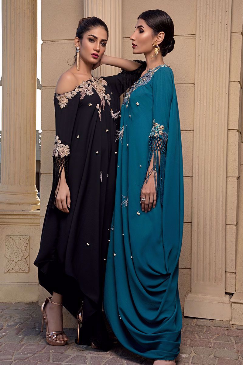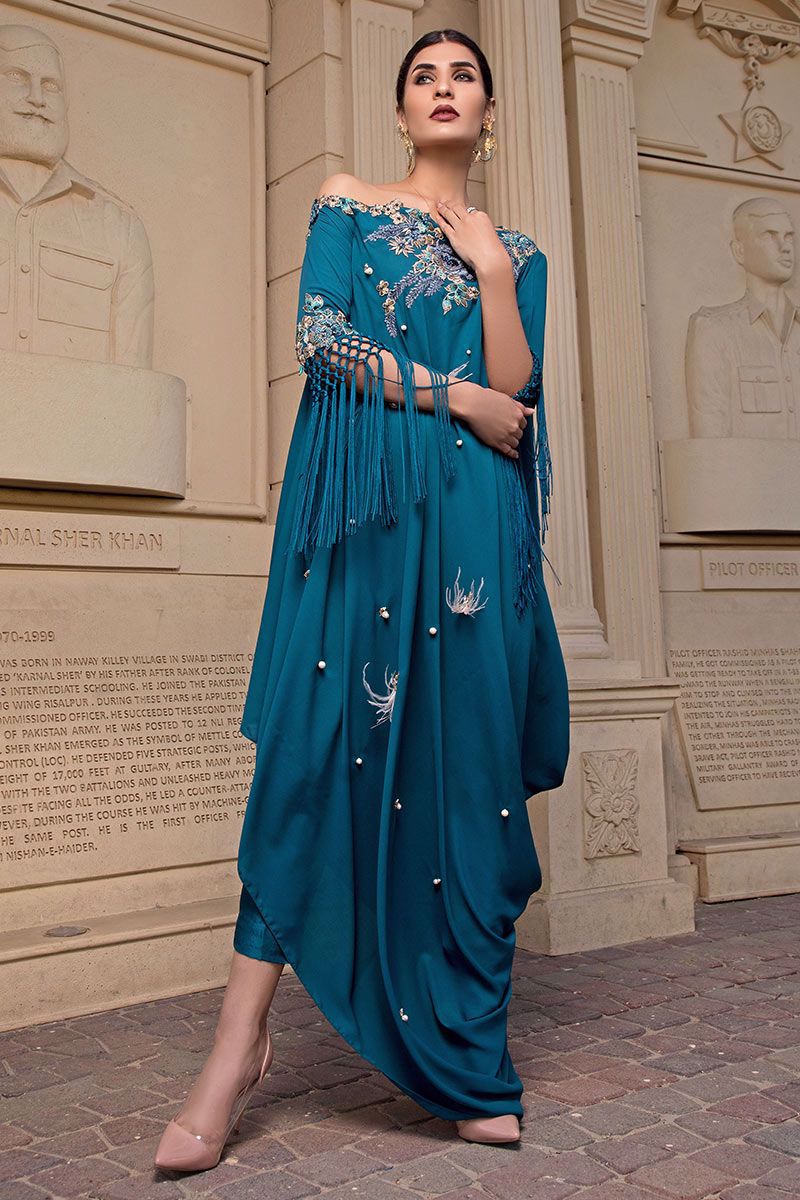 Strikingly chic tailored one side drop cowl Top in Teal Green colored on double georgette crafted with embellished beige and rose gold zari and handwork with pearls and cut dana along with fringe details on sleeves. Same color Pants can be bought to complete the look.