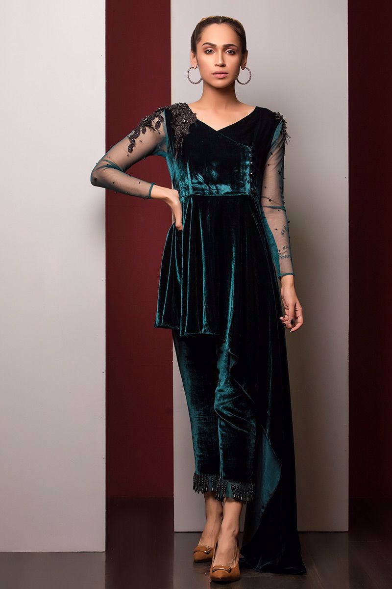 Teal pure velvet low and high peplum embellished with feathers, stones, glitter, resham and crystals.
