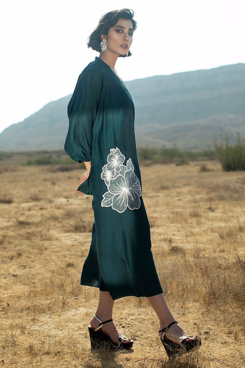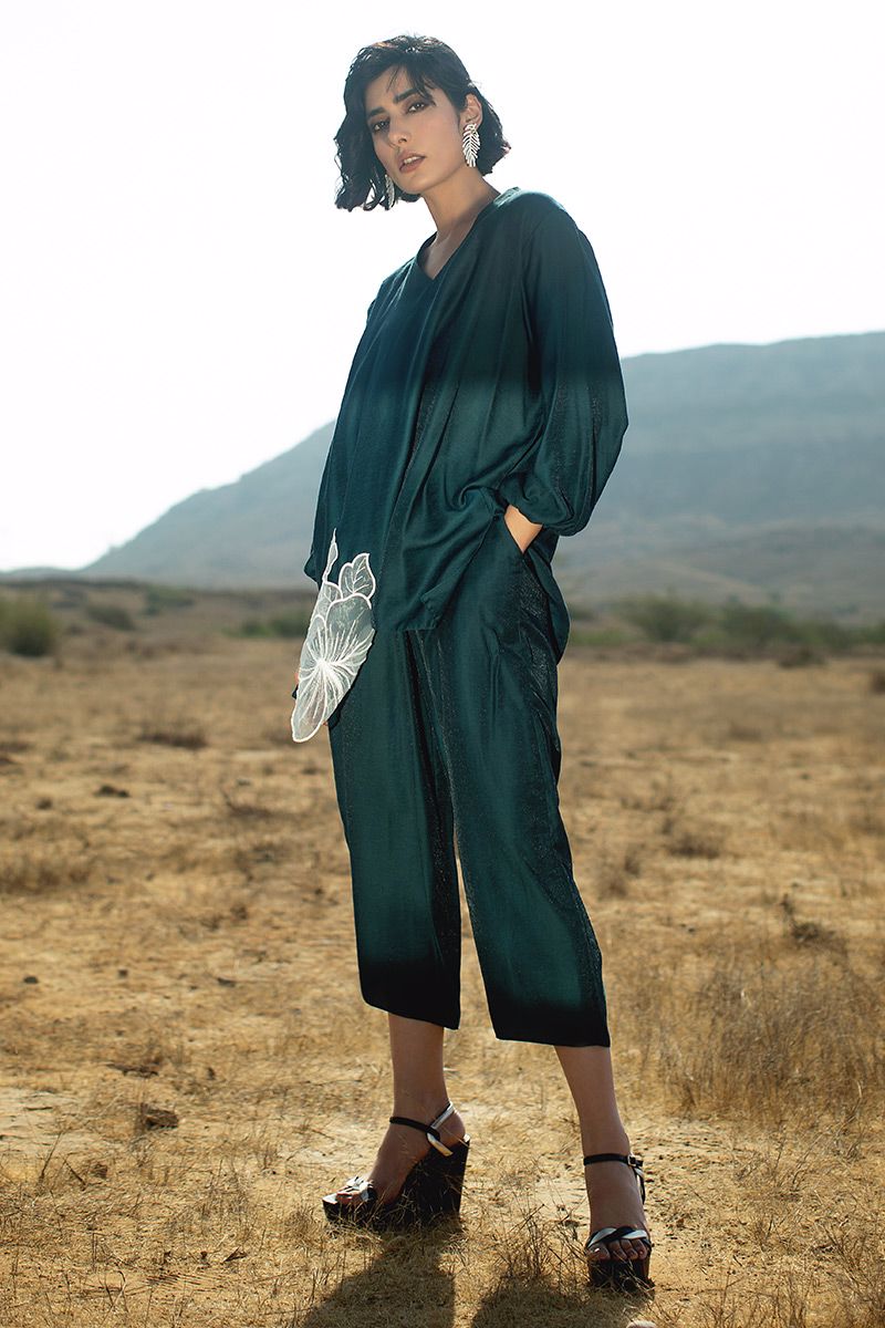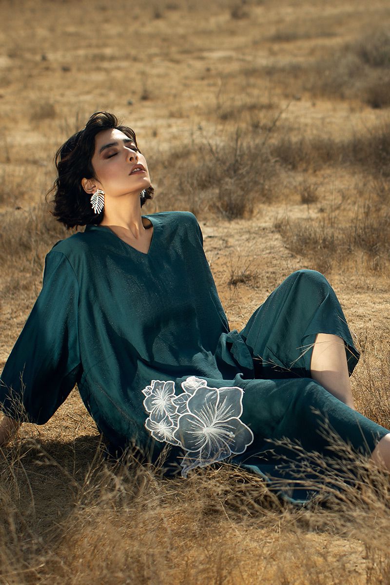 Shimmer textured short linen foil tunic in color teal. Not to miss the flower embellishment towards the hem. Same color culottes completes the look.