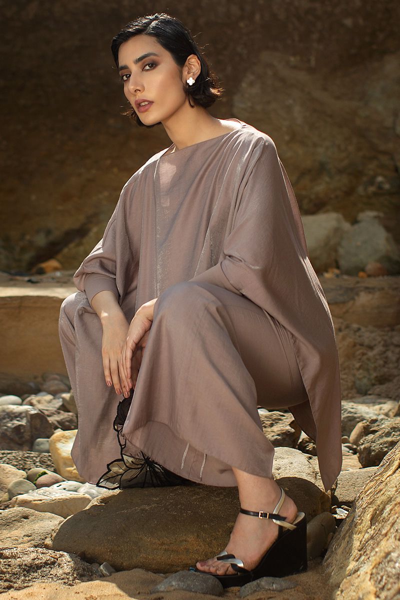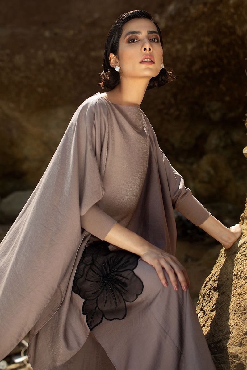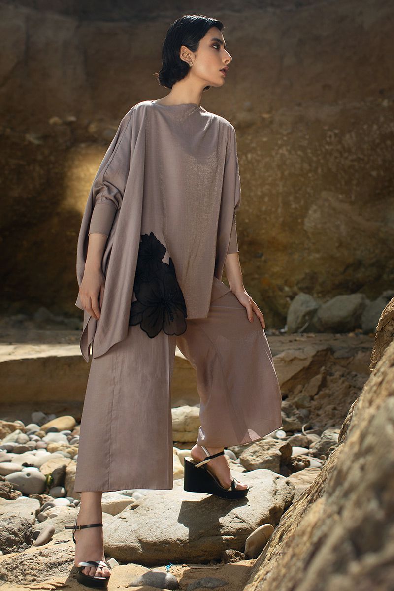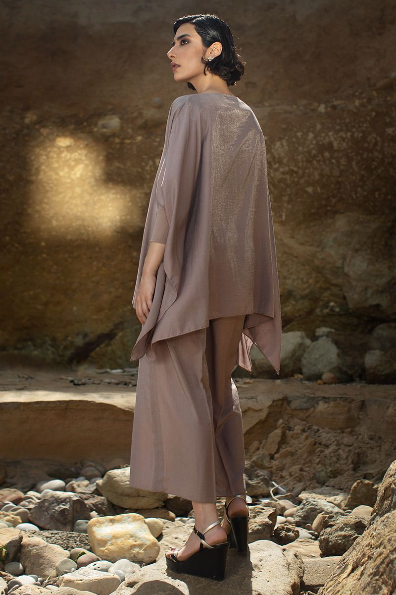Shimmer textured short linen foil poncho with cuff in color nutmeg. Not to miss the flower embellishment towards the hem. Same color culottes completes look.