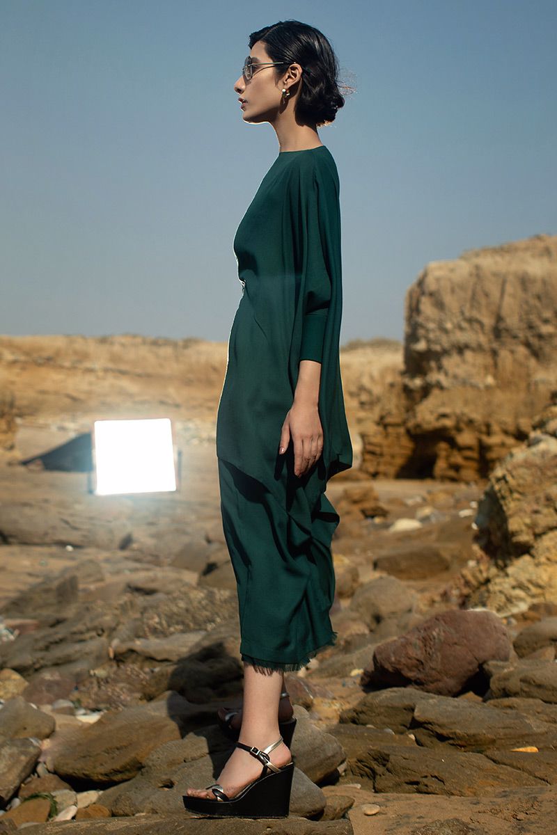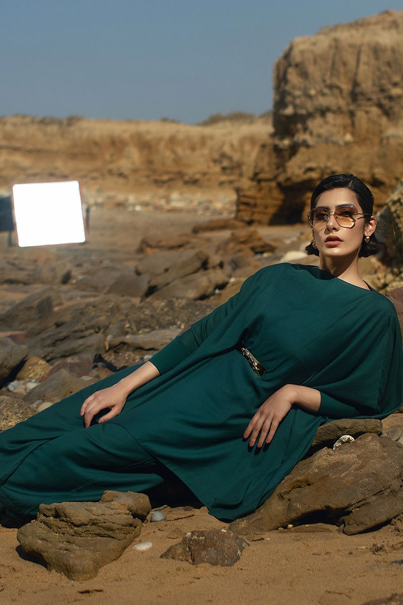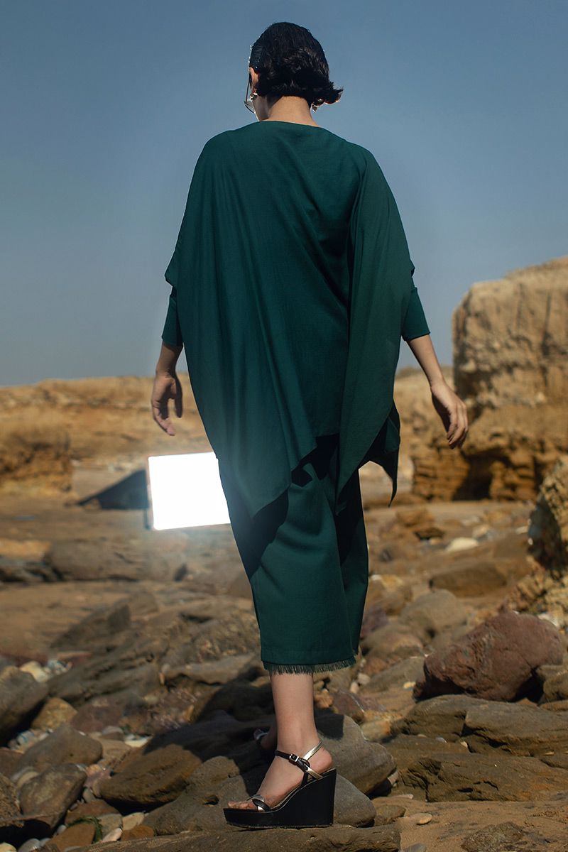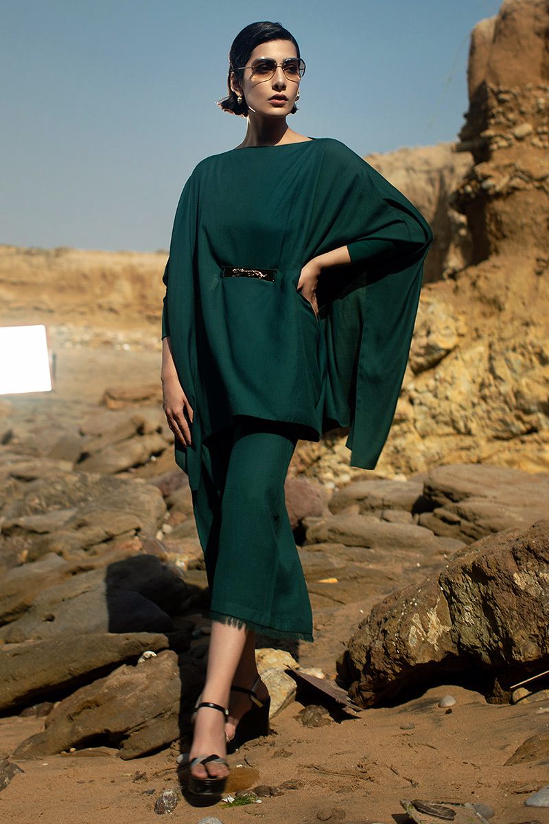 Aesthetically modern style short poncho, comprises of shimmer linen in color Eden green. Fastened with leopard metal belt around the waist. Same color culottes is paired to complete the look
