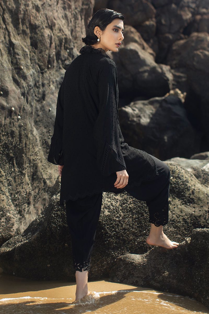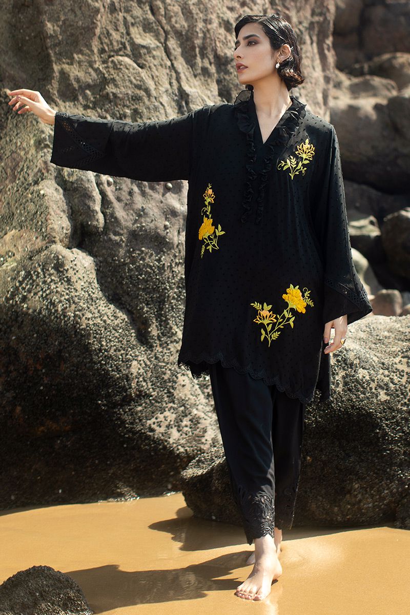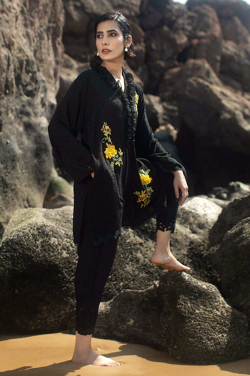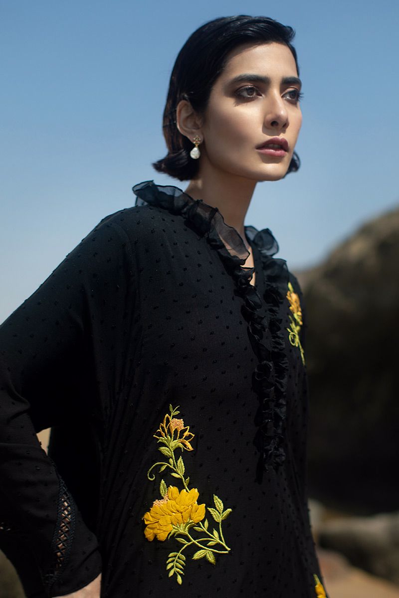 This Classic black shirt comprises of ruffled collar. The elegance is uplifted with 3D floral motives motif along with intricate edging edging on the hem. Paired with same color semi pure cutwork shalwar.
