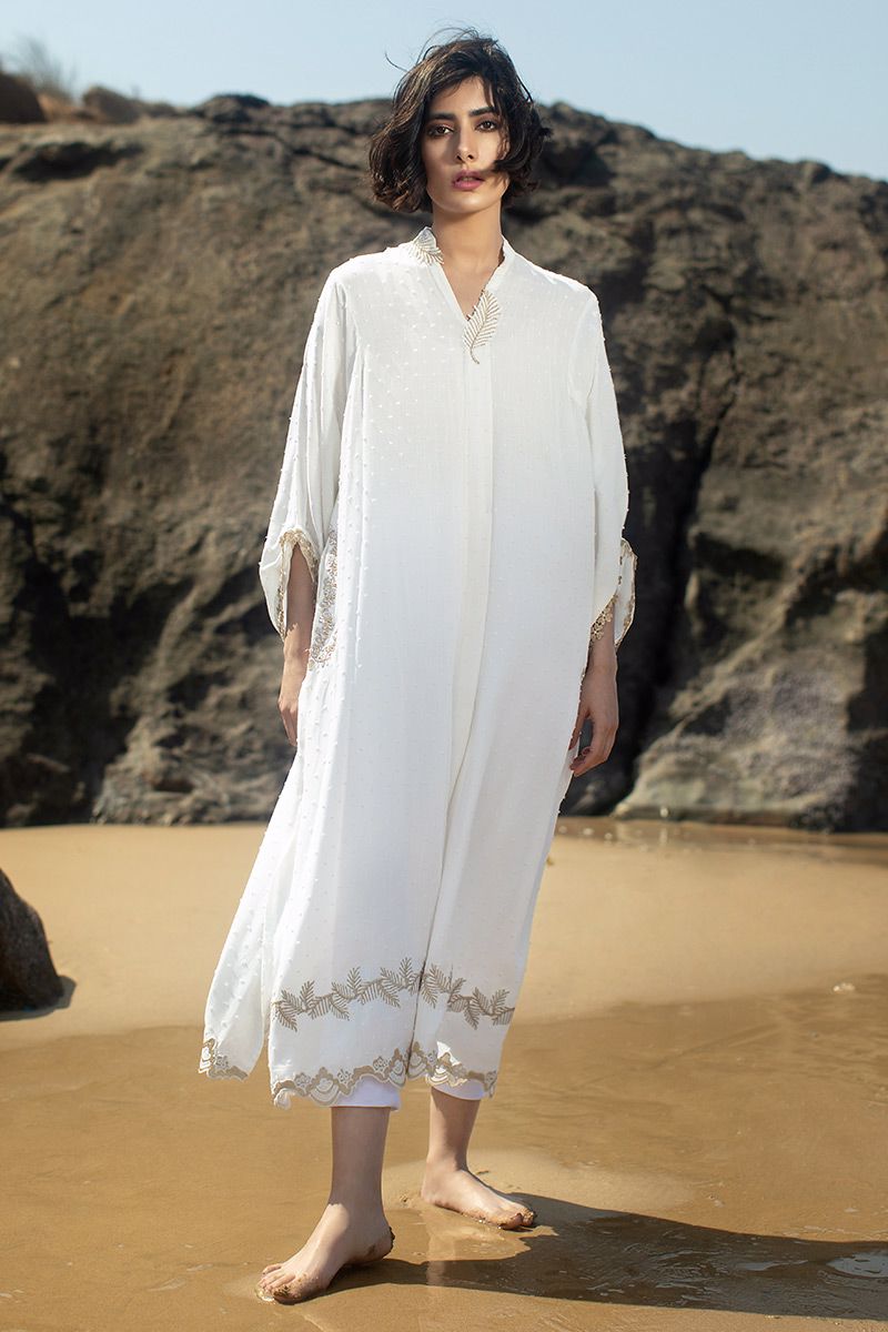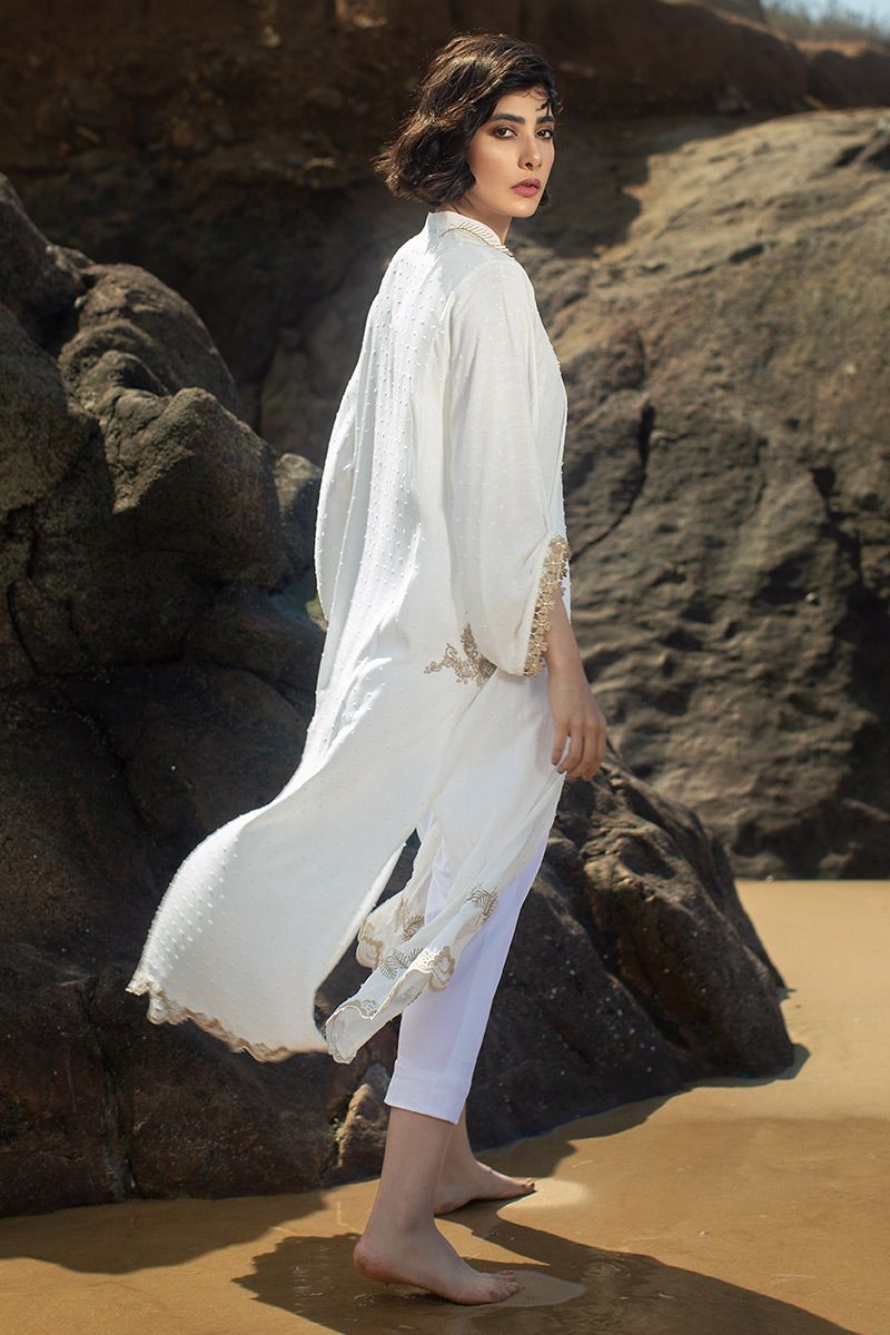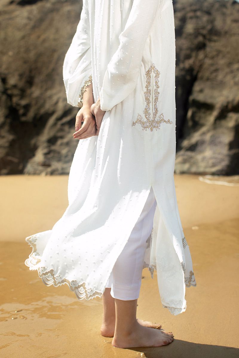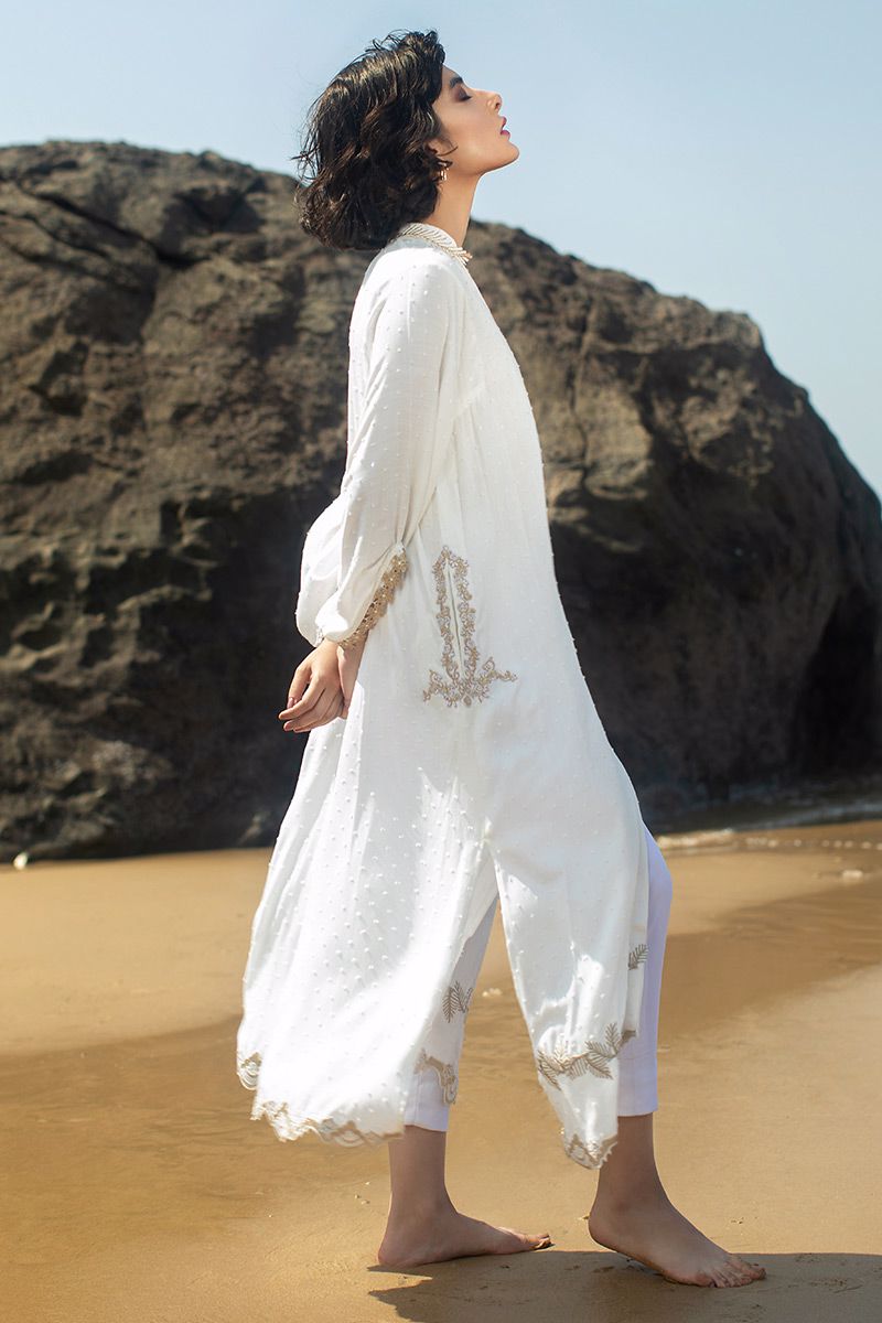 A perfect blend of ivory shimmer doria witness in this shirt. The pocket are highlighted with intricate zari embroidery inspired by French revolution architecture. To finish off the look same color straight pants is paired, to be purchased at additional cost.