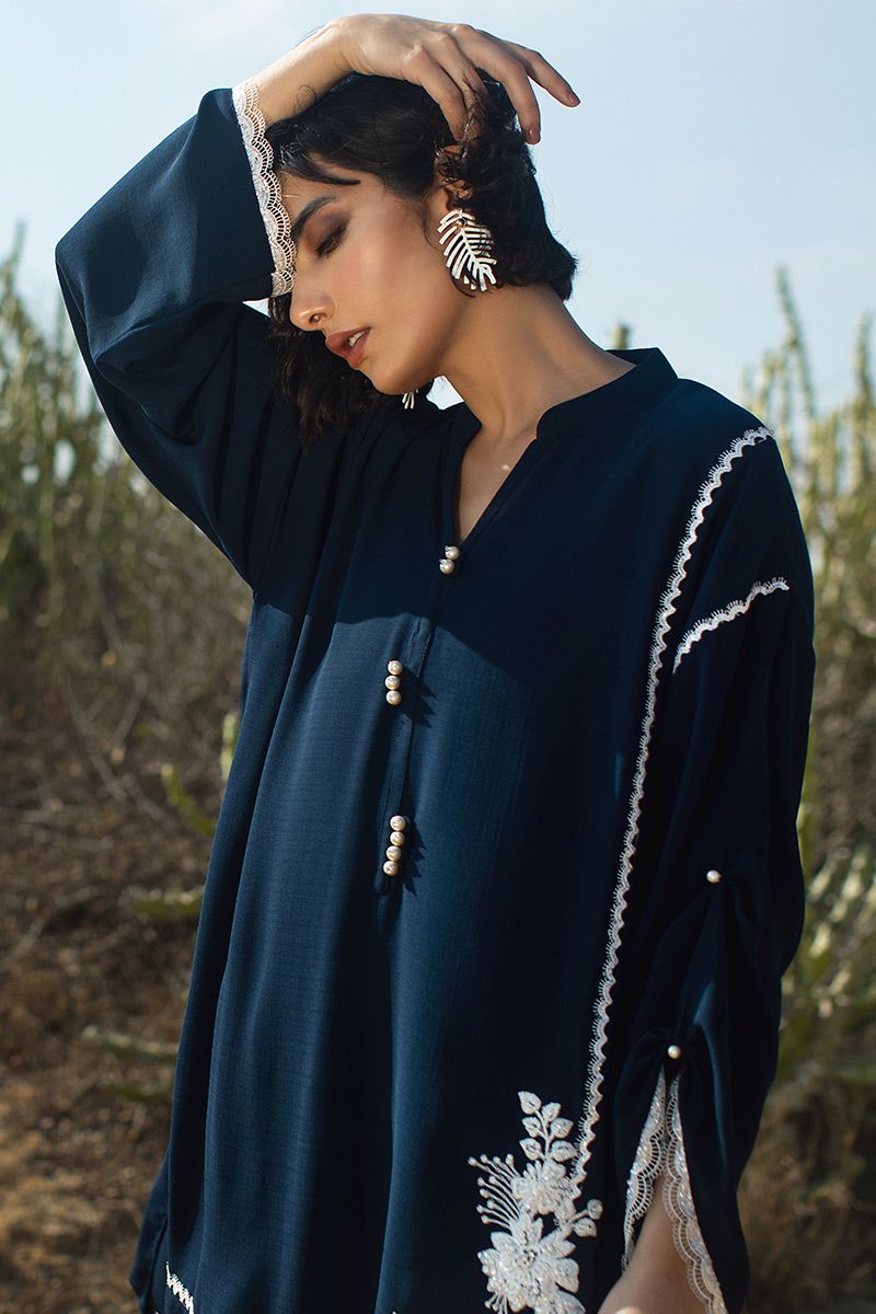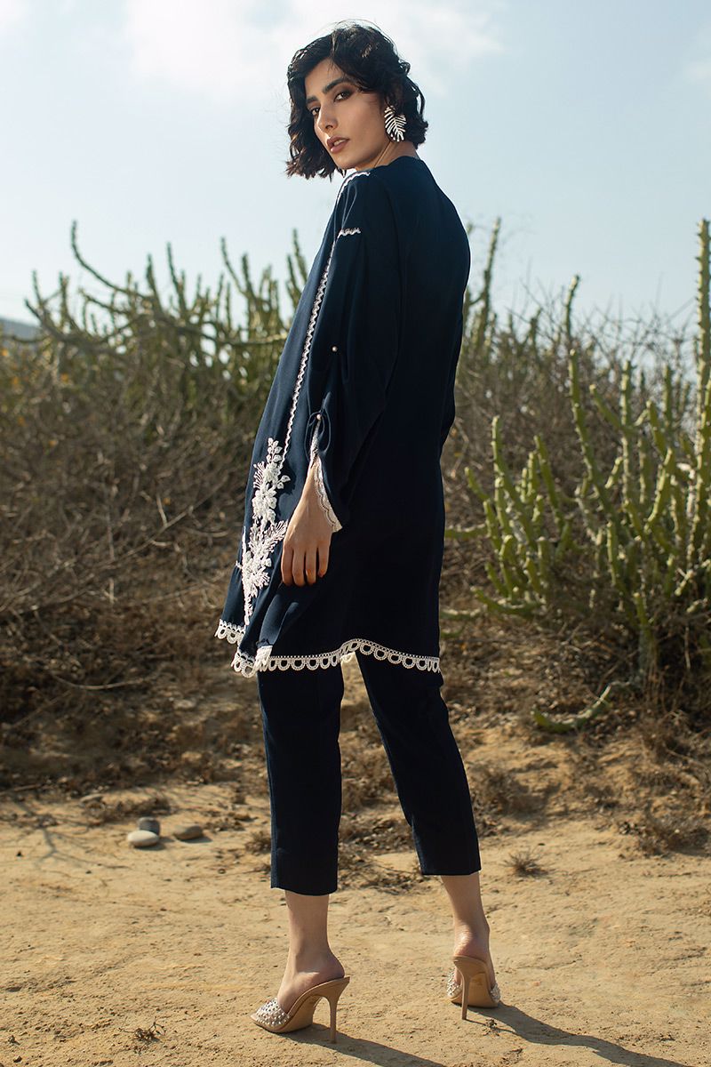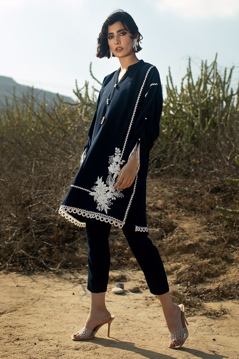 This evening blue double georgette kurta is perfect for teas. The embellishments consists of ivory, resham, pearls, beads ad zari. Same color straight pants completes the look and can be purchased separately.
