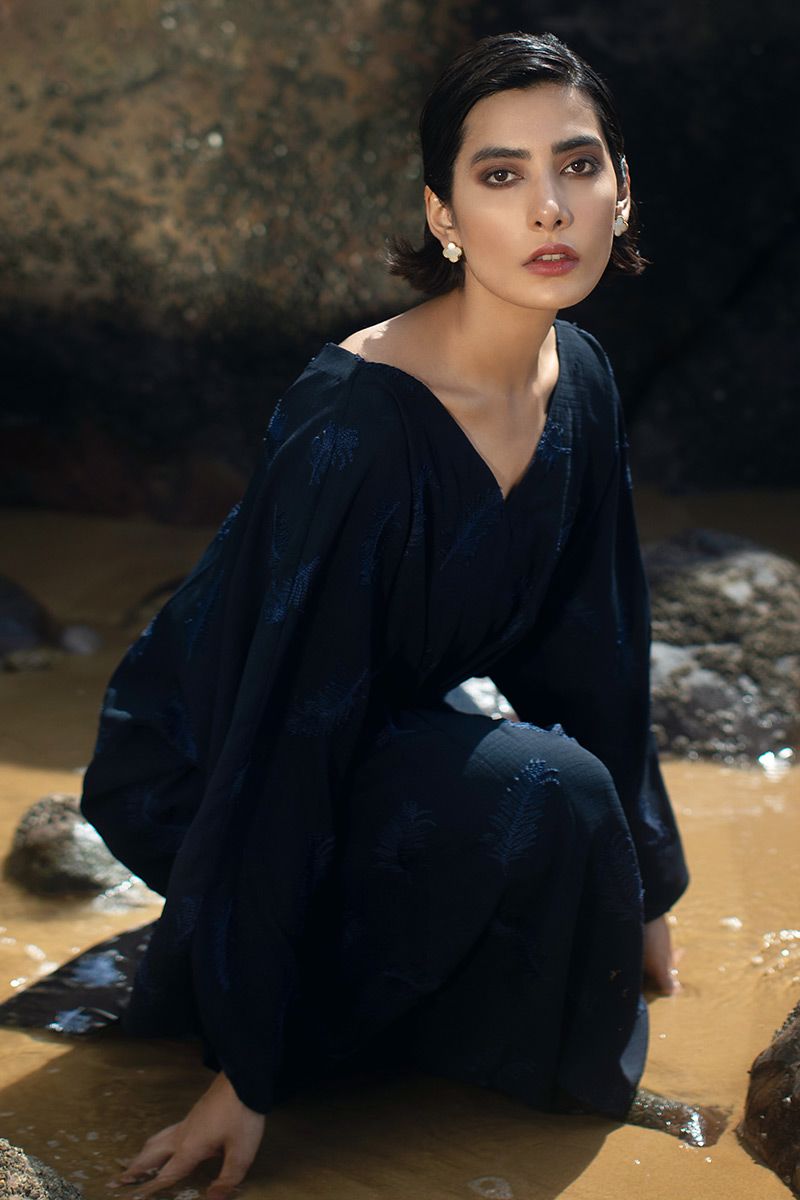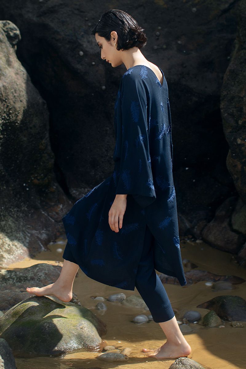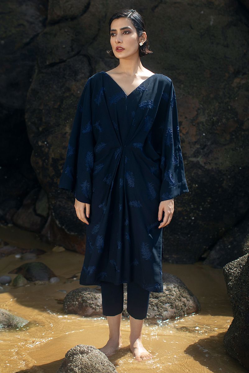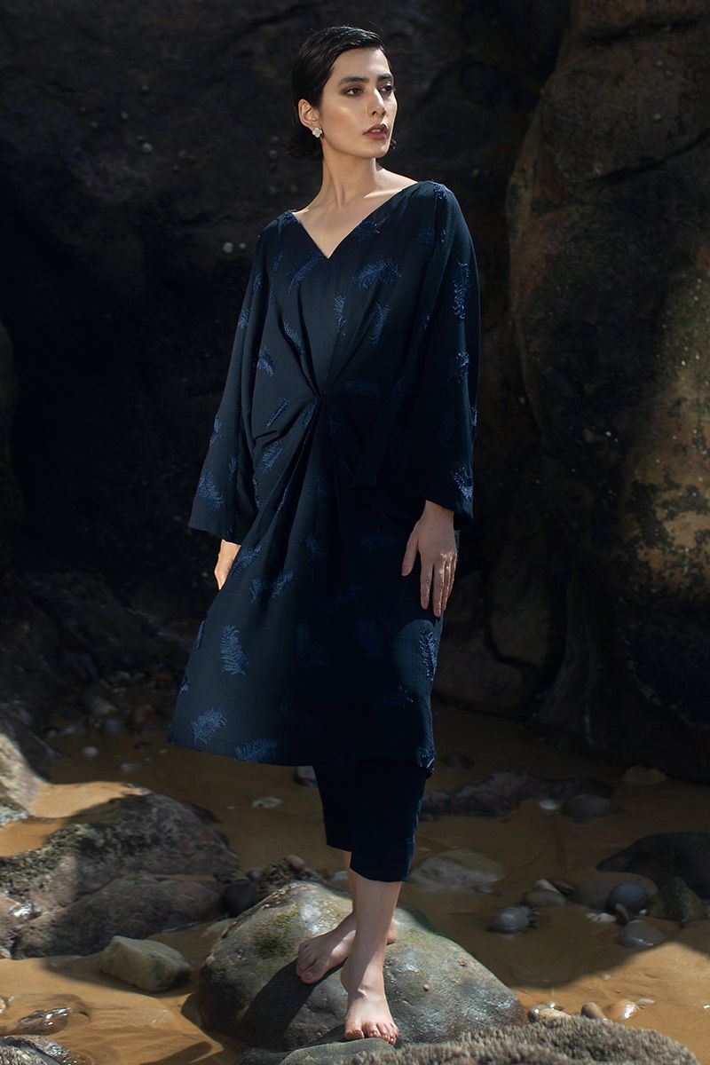 A trend setter, double georgette evening blue tunic features pleats on the waist giving an hour glass shape to the body along with baggy sleeves. Completing the look with same color pants, can be purchased at additional cost.