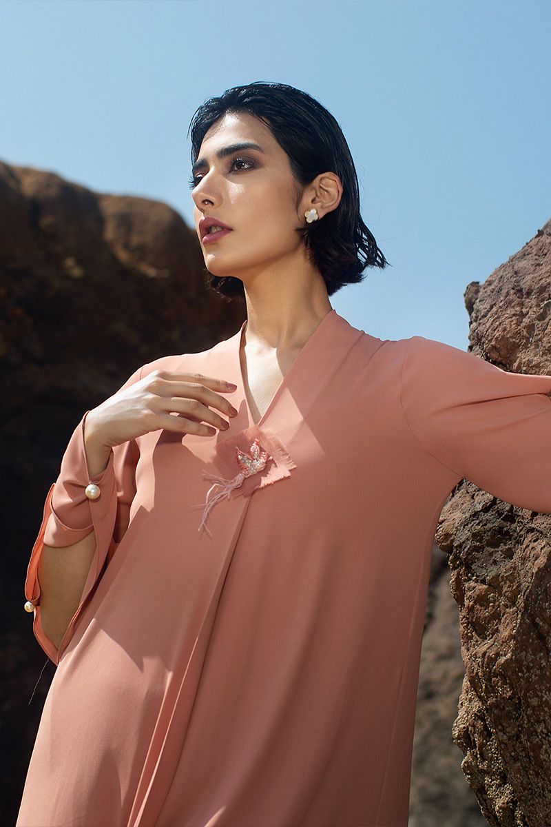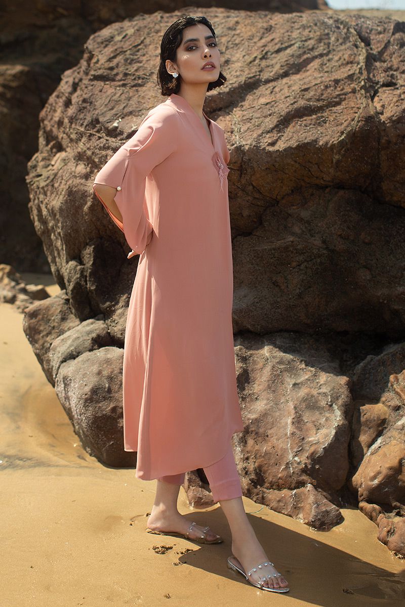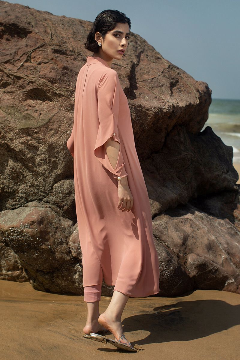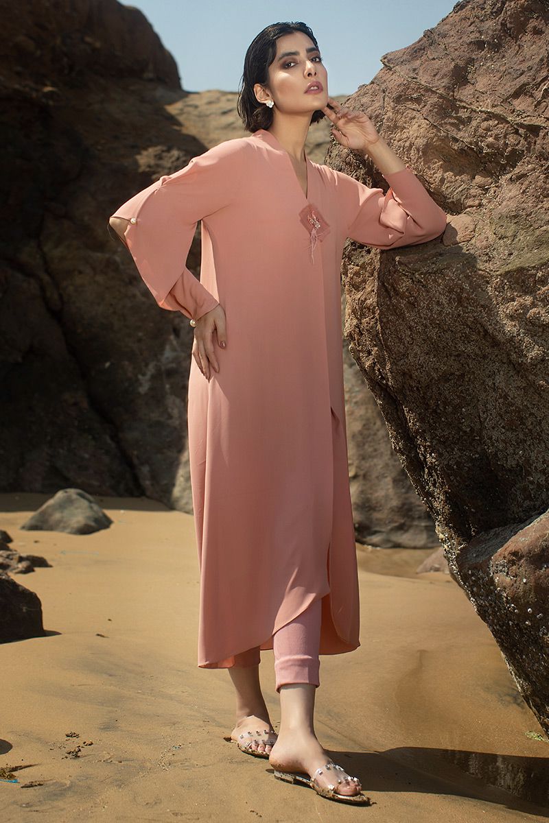 Presenting the modern fusion to life, this coral reef georgette asymmetrical shirt comprises of box pleat secured with hand crafted button brotch. Along with statement sleeves. To finish off the look same color stretchable pants, to be purchased separately.