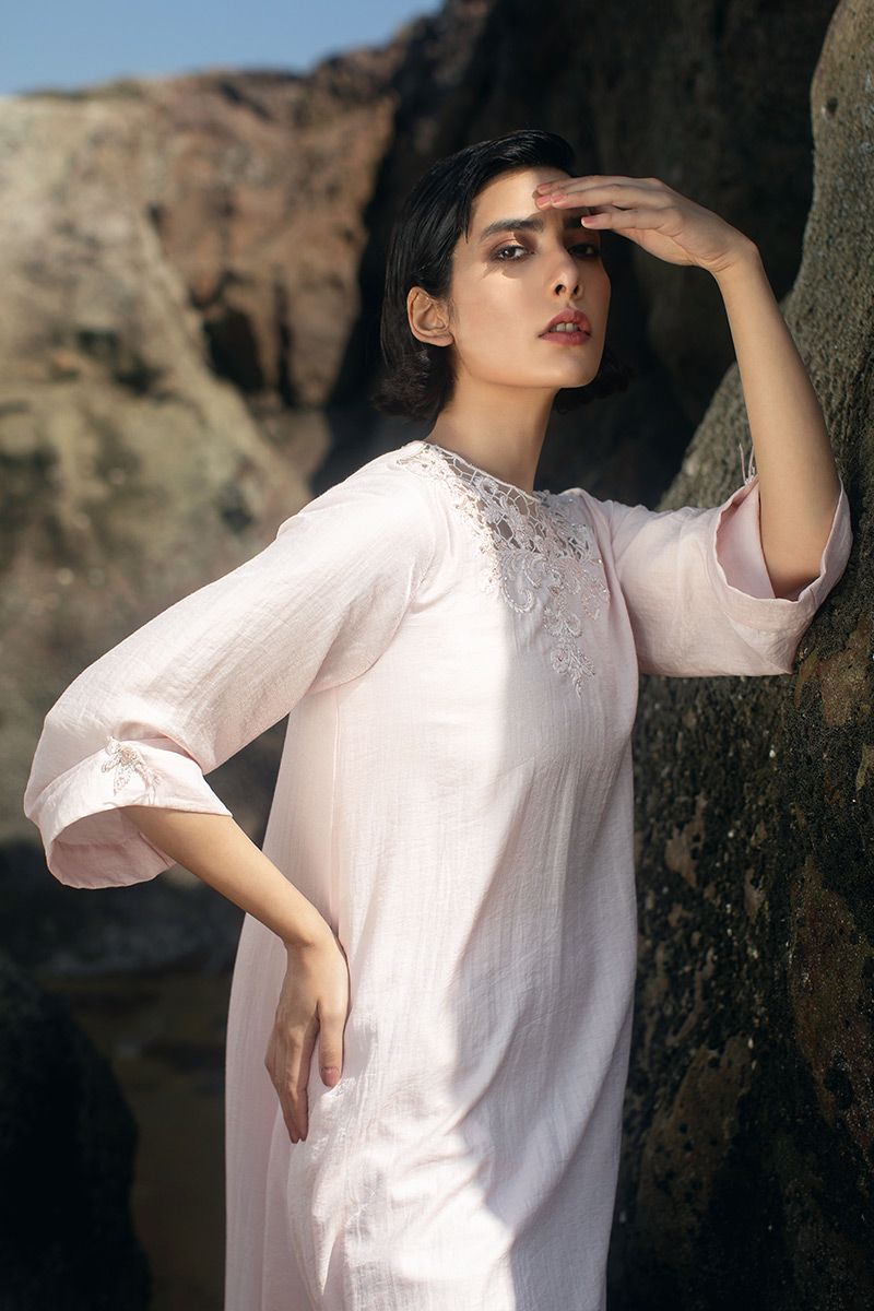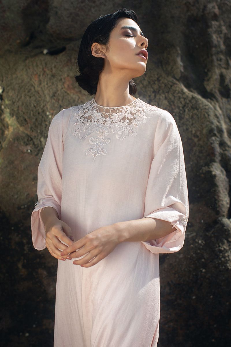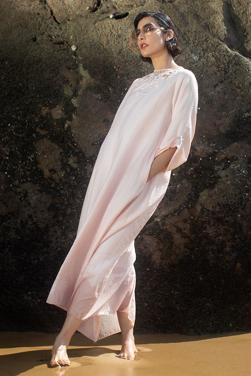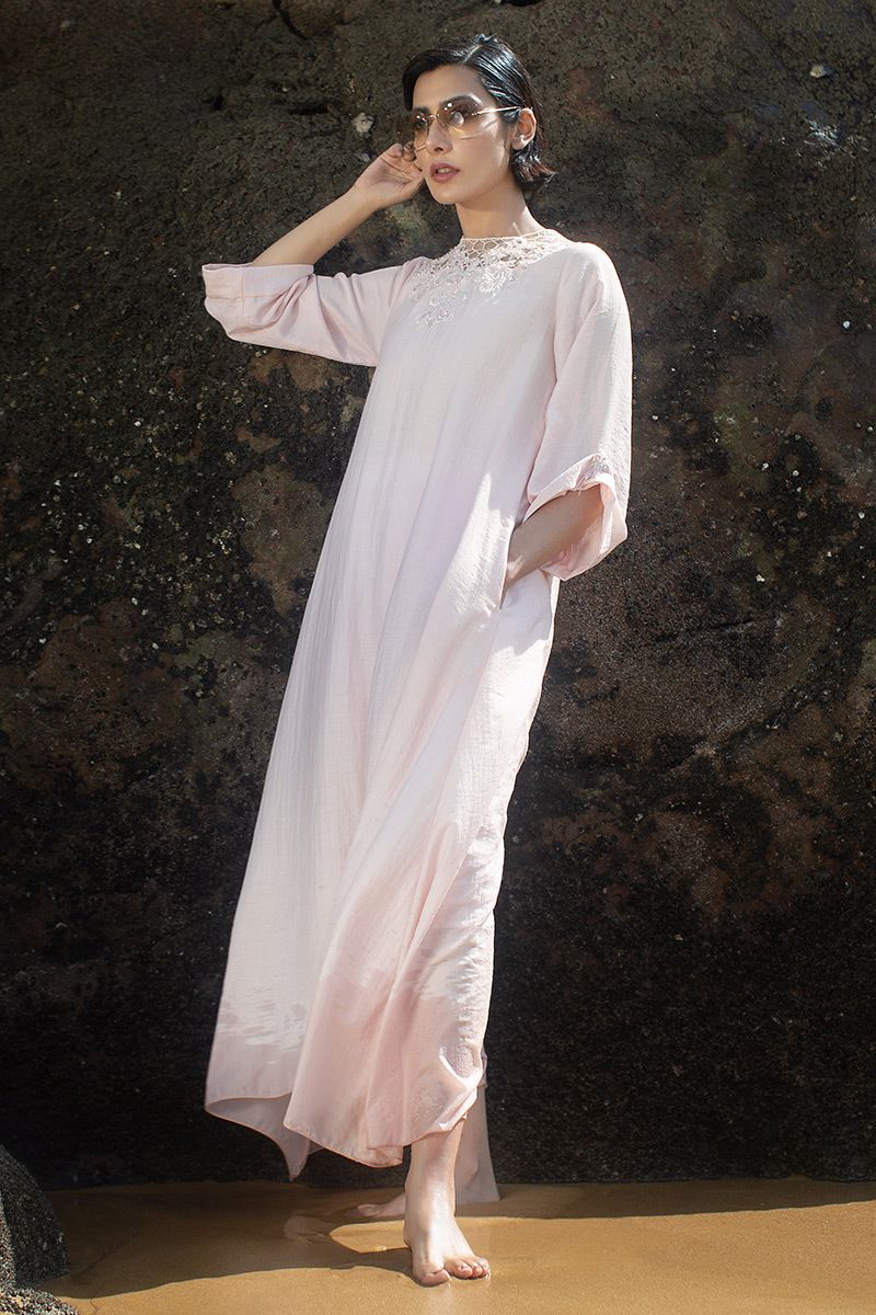 Elegance at it's best, this Cotton candy long dress features dainty blend of floral and geometric embellishment of resham, crystals and beads. The turn-up sleeves is highlighted with handmade crystal ornaments.