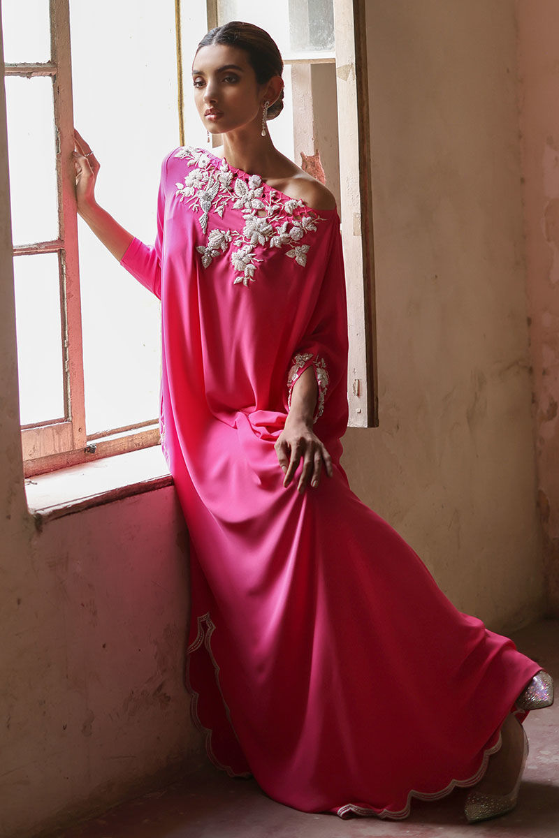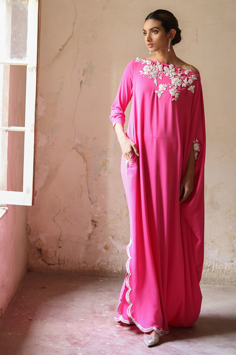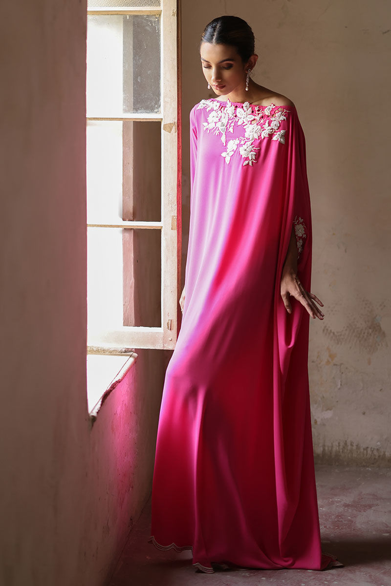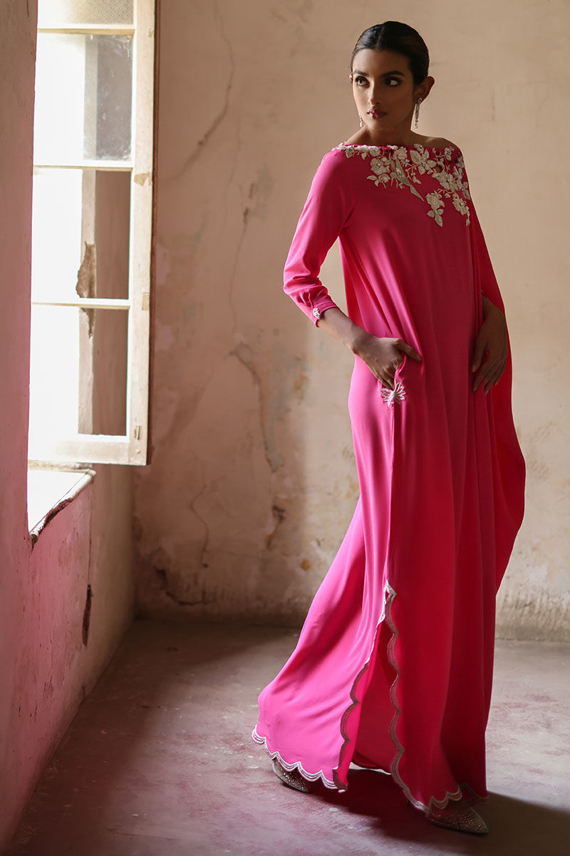 This Phlox pink free fall georgette kaftan is stare worthy. The hues of ivory resham, sequin and bead work are placed carefully forming a soothing eye movement on side pocket, front, back and sleeves.