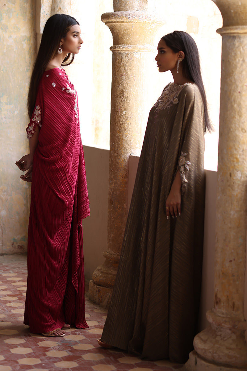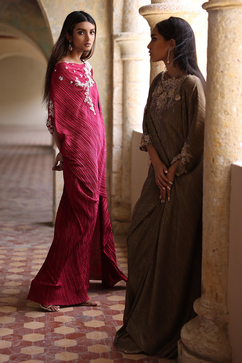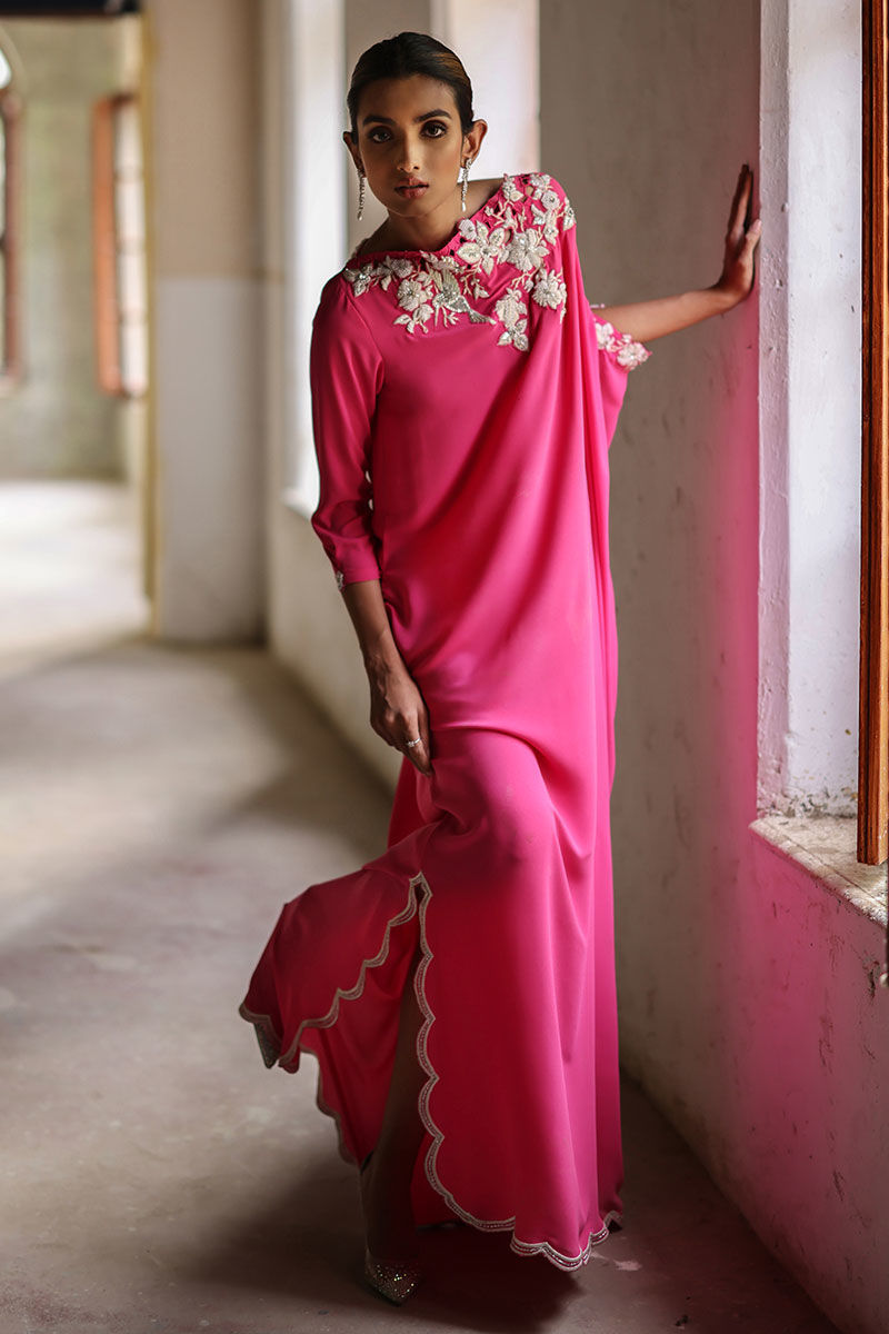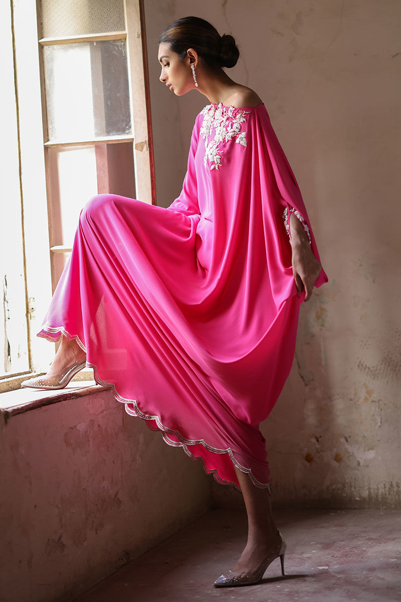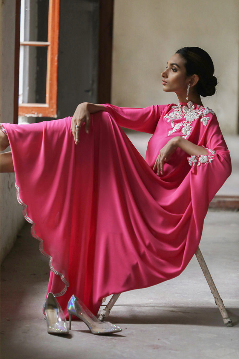 This Phlox pink free fall georgette kaftan is stare worthy. The hues of ivory resham, sequin and bead work are placed carefully forming a soothing eye movement on side pocket, front, back and sleeves.