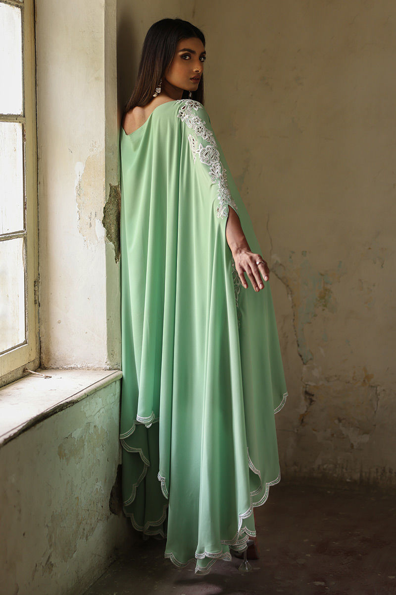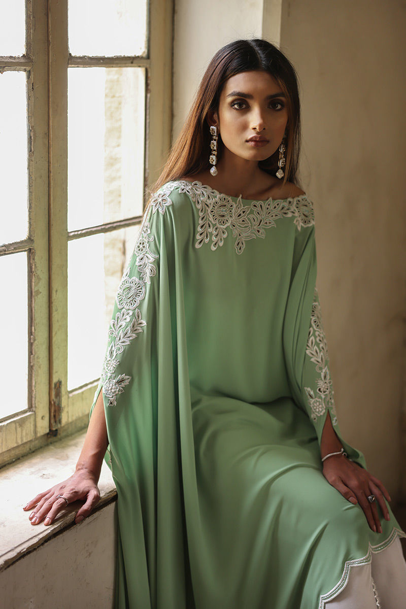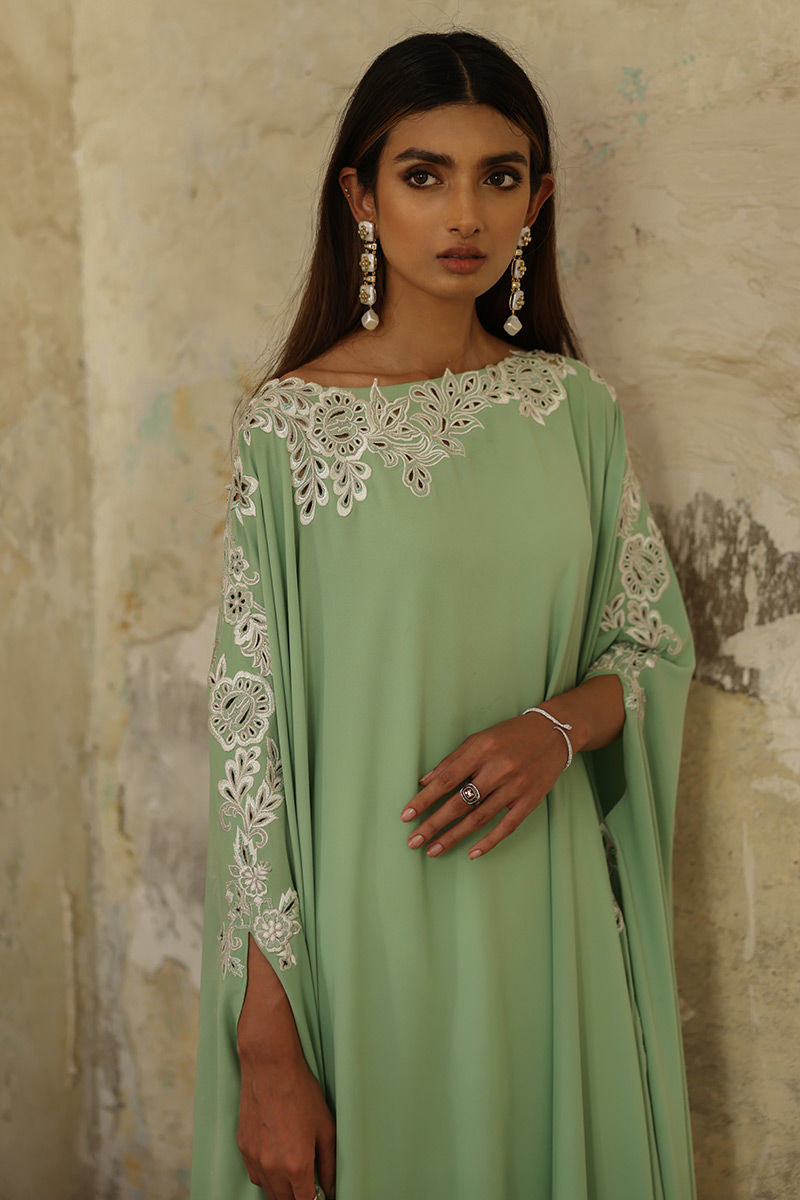 This free fall georgette tunic is designed with floral pattern of thread work comprising of various stitches patterns and cut work all over the sides maintaining the classic look.