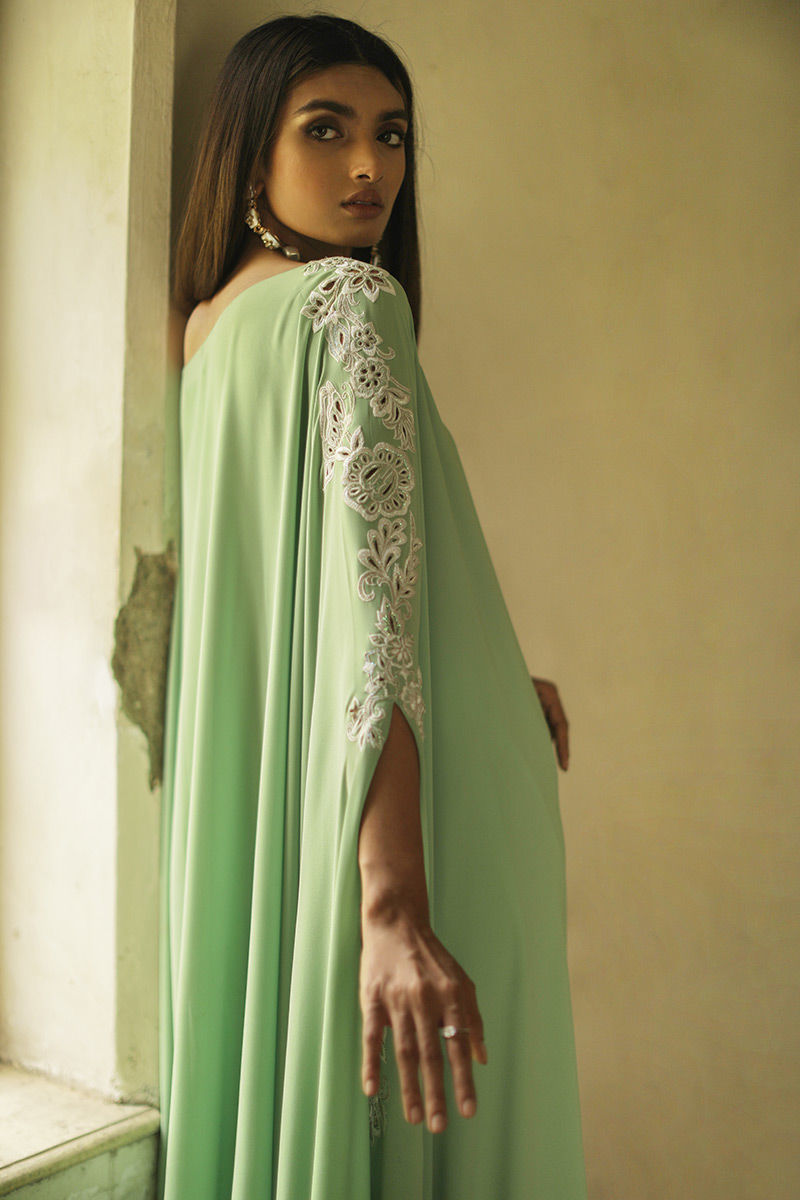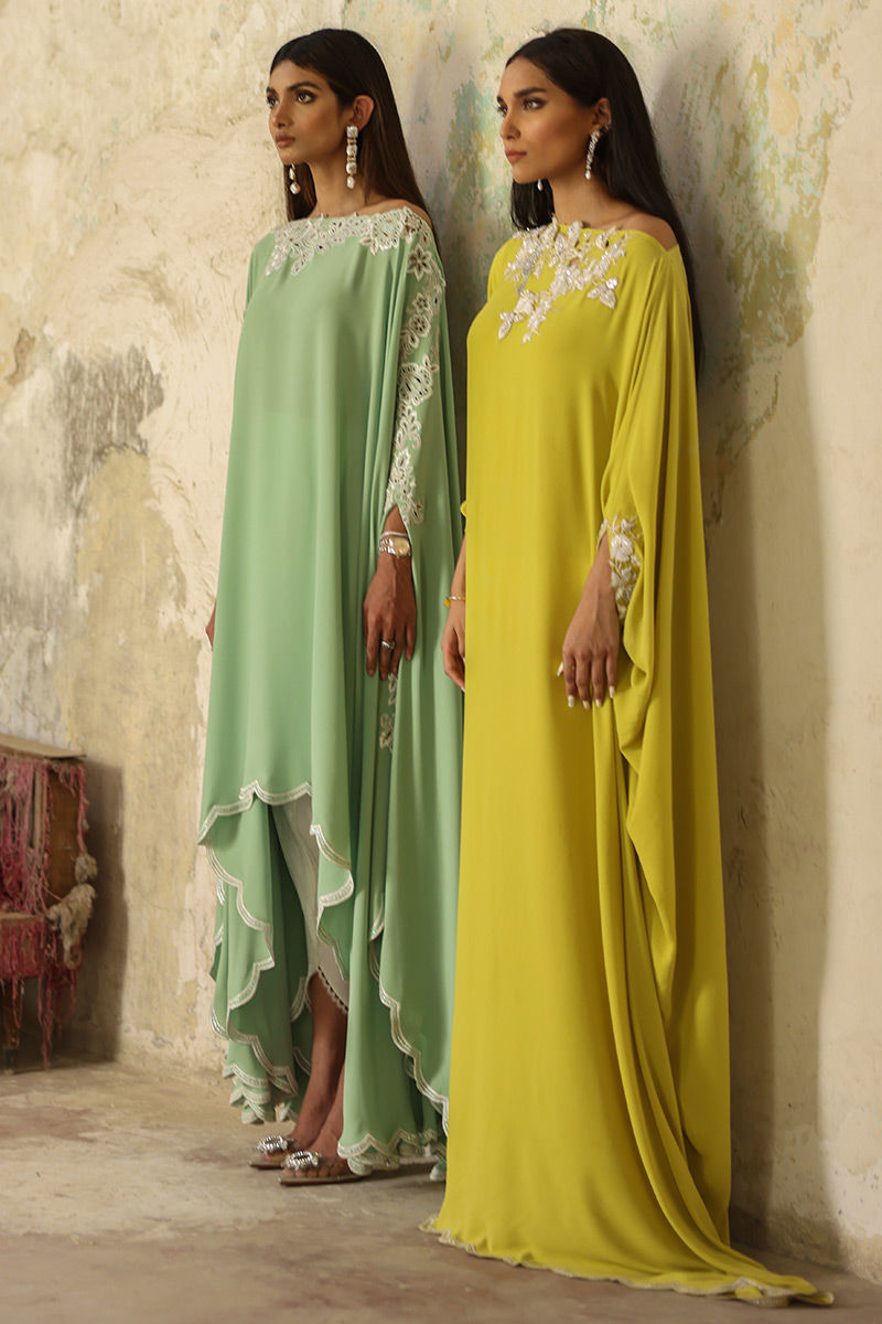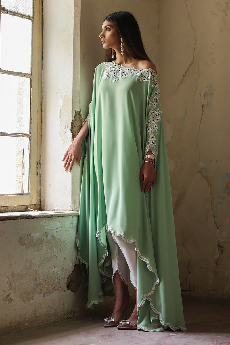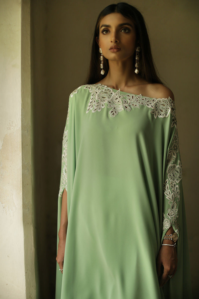 This free fall georgette tunic is designed with floral pattern of thread work comprising of various stitches patterns and cut work all over the sides maintaining the classic look.