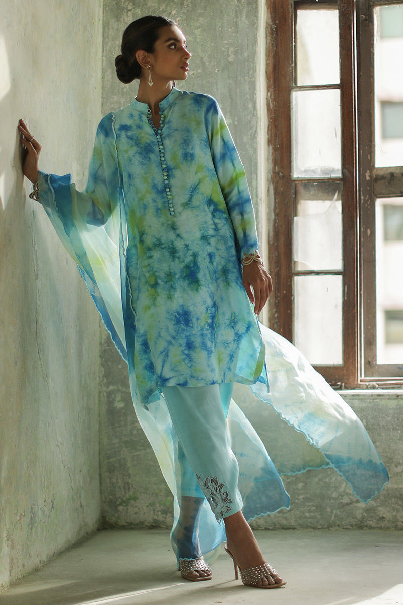 Pure raw silk hand made tied and dyed in shades of blues and greens is uplifted with gold and antique zari embroidery on pockets and sleeves. The theme of tie and die has been used in dupatta to make it super classy which can be purchased at additional cost. Skinny shalwar with same colored bunch at bottom can be added as well like shown in picture.This outfit includes shirt, pants and dupatta.