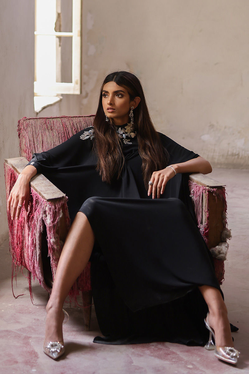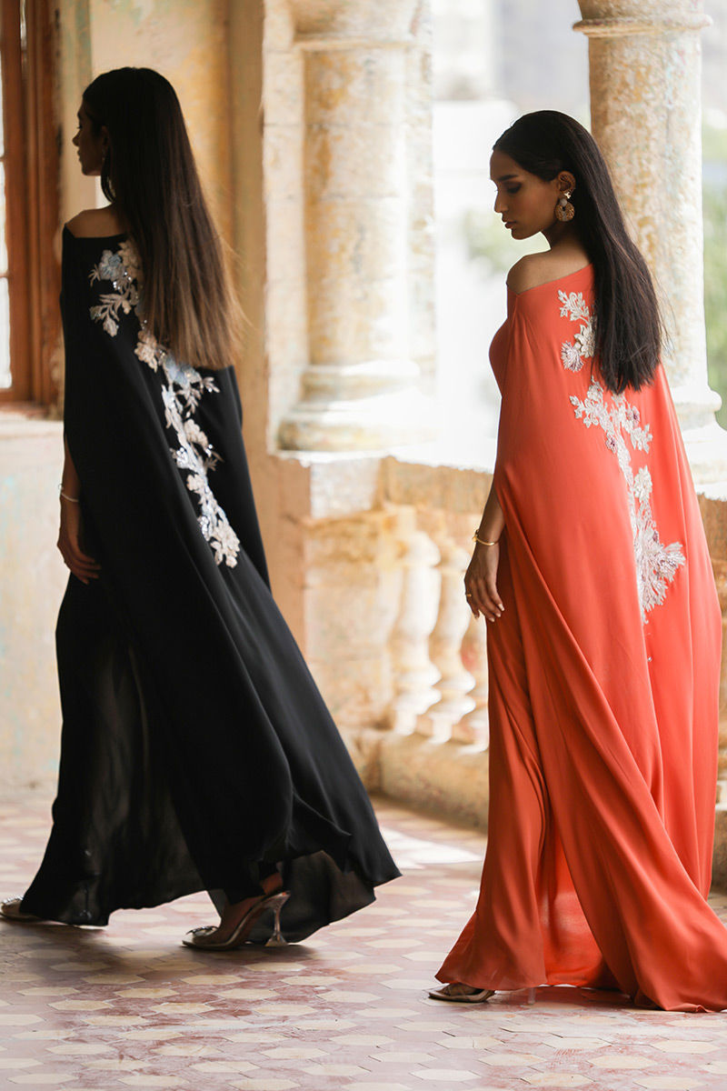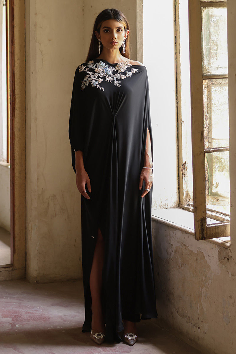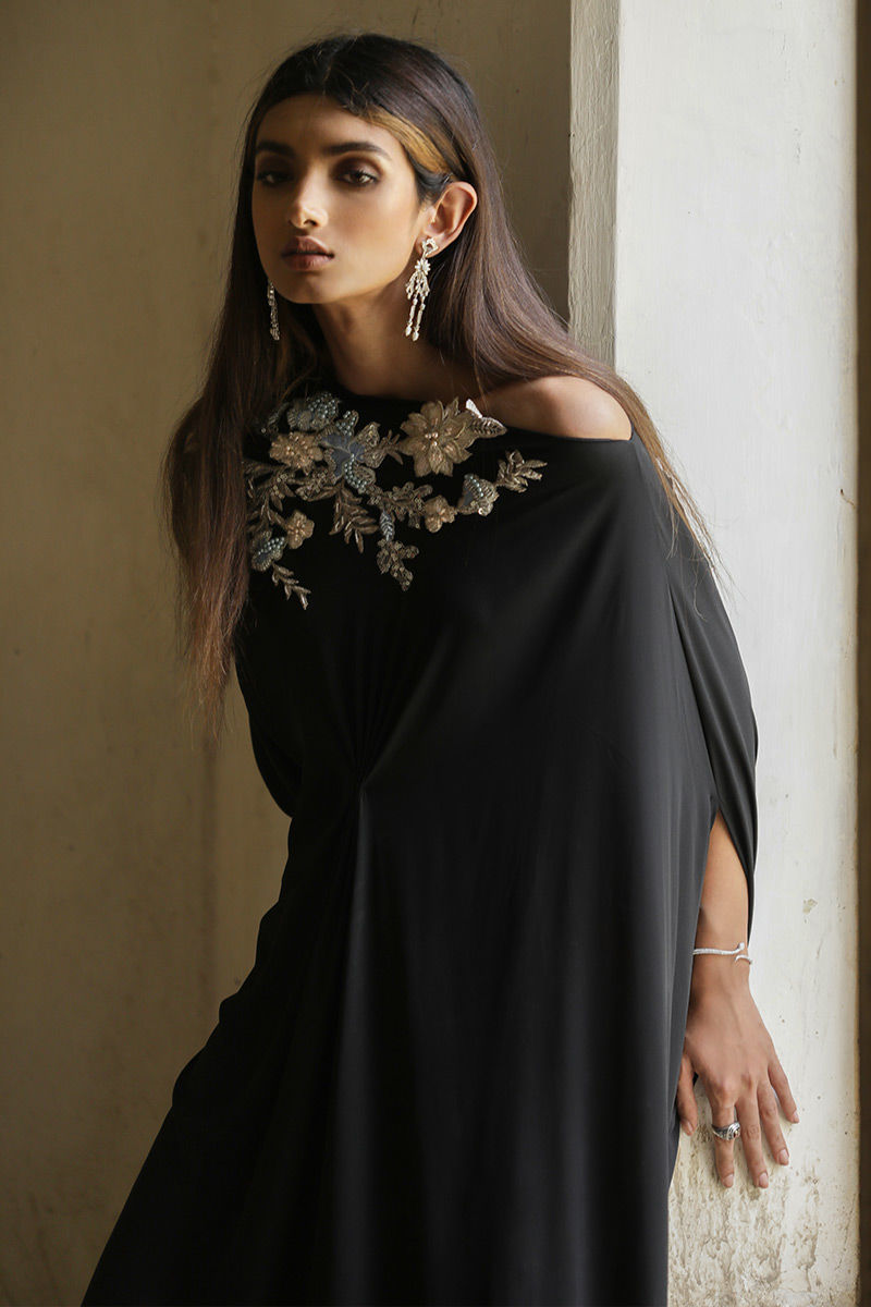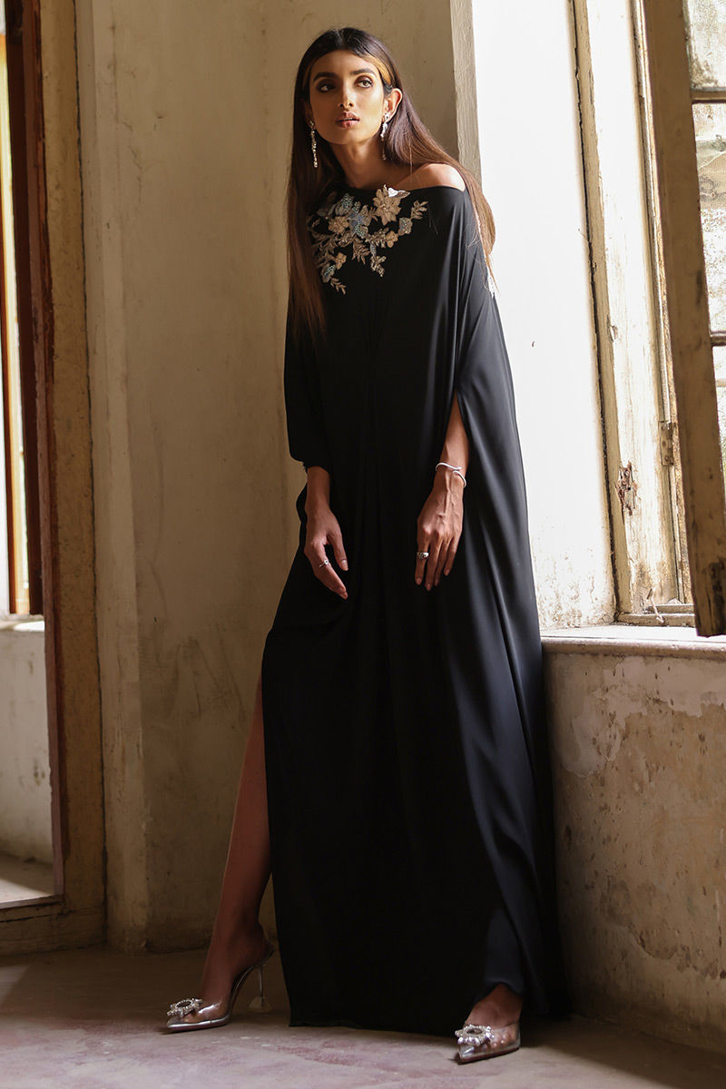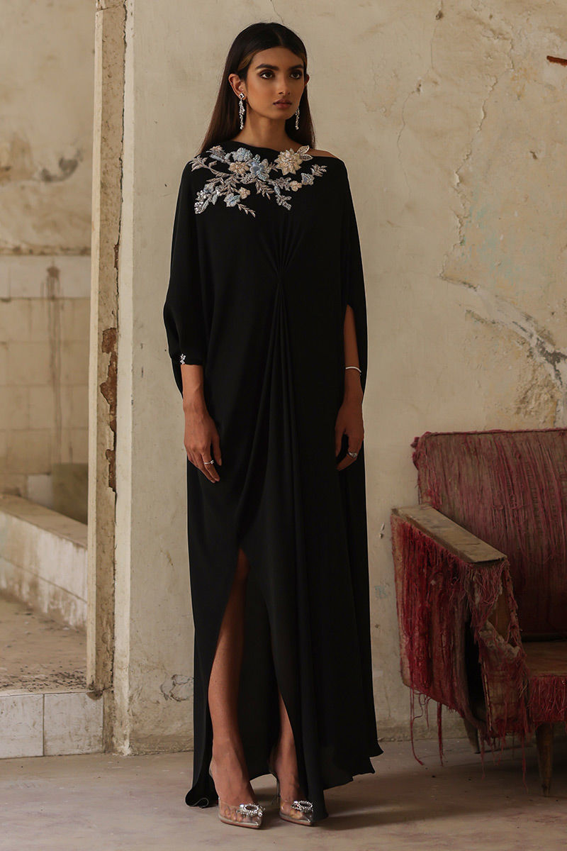 A beauteous free fall georgette off shoulder black kaftan in pleated style stands out in the crowd. The exquisite embellishments around the front neckline and all over the back comprises of 3d resham florals embroidery, pearls, cutdana and chunky crystals is worth buying.
