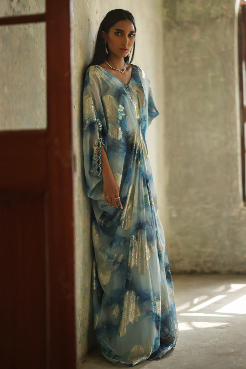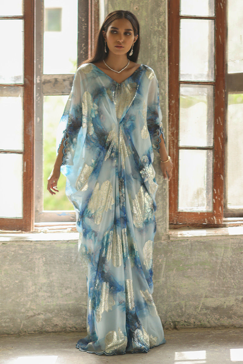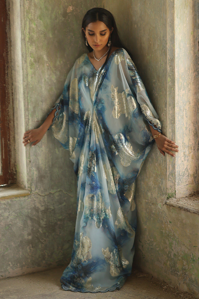 A dignified blue water color shiny georgette kaftan is a true example of artisan technique, The pleats on center front and back gives body and hour glass shape. The look is enhanced with resham cutwork embroidered scallups around the sleeves and daman with a bird motif at the back.