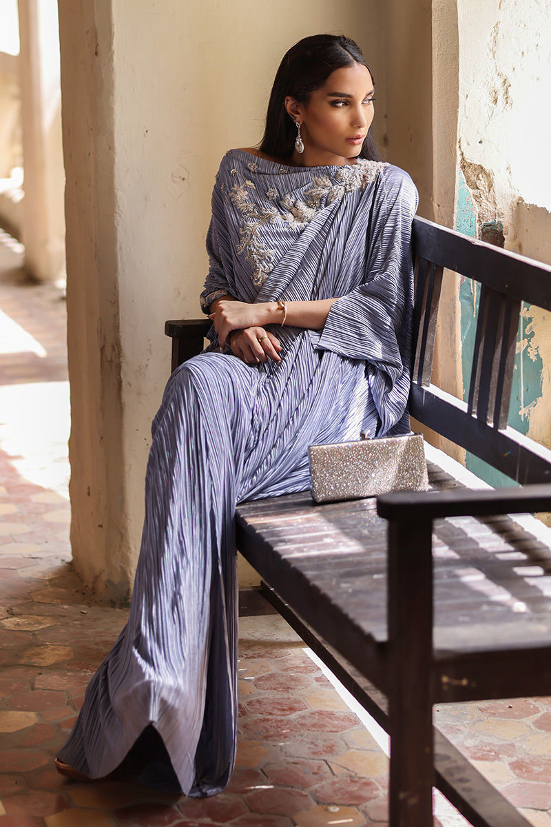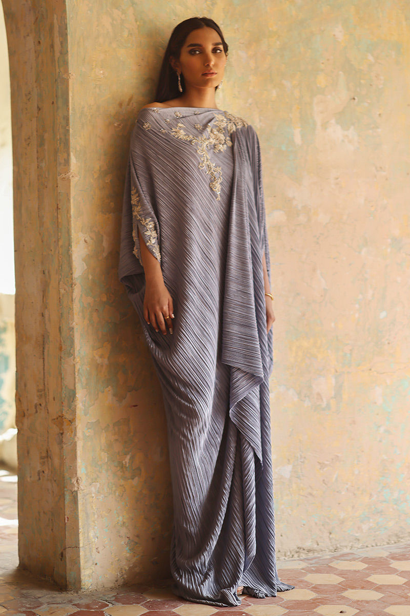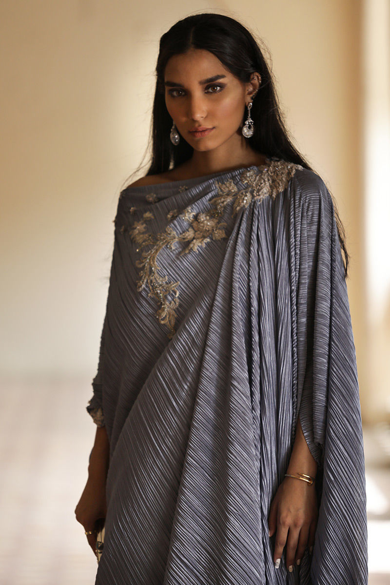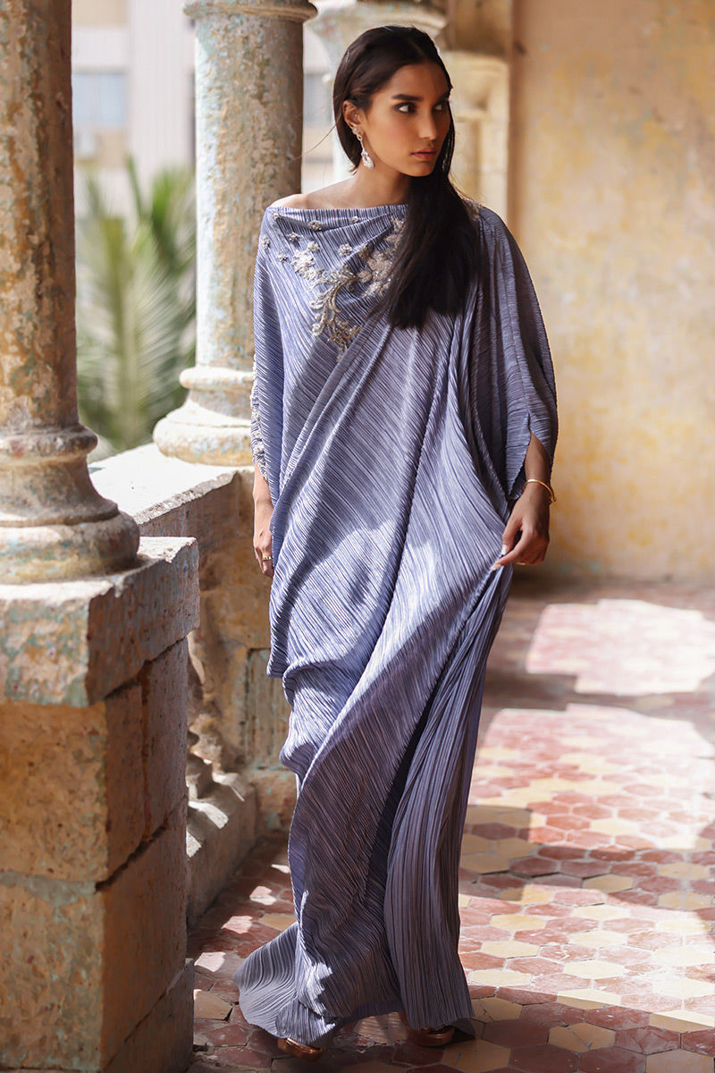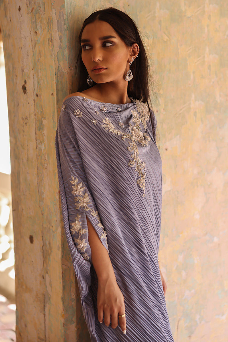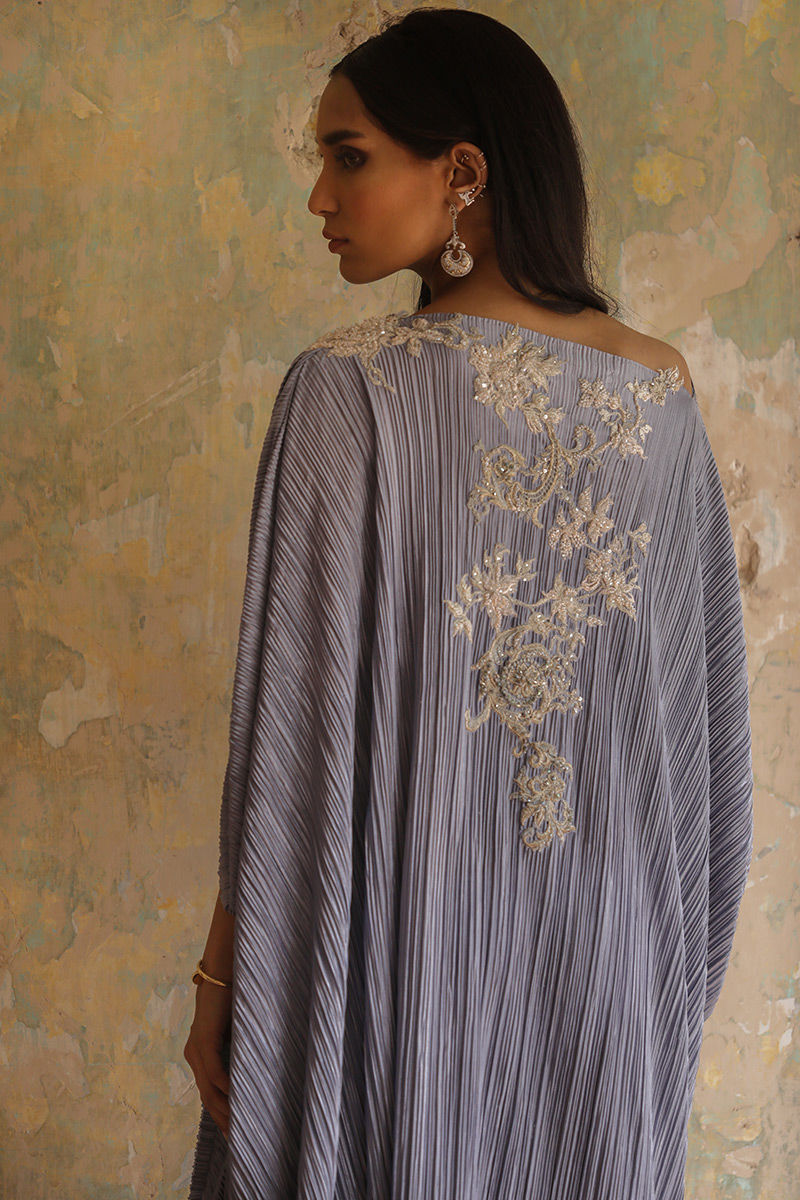 A perfect fusion of modern classy look can be seen in thus mineral greypleated kaftan. The 3D floral adornments scattered around the front and backline comprising of resham, sequins, beads and pearls highlights its beauty.