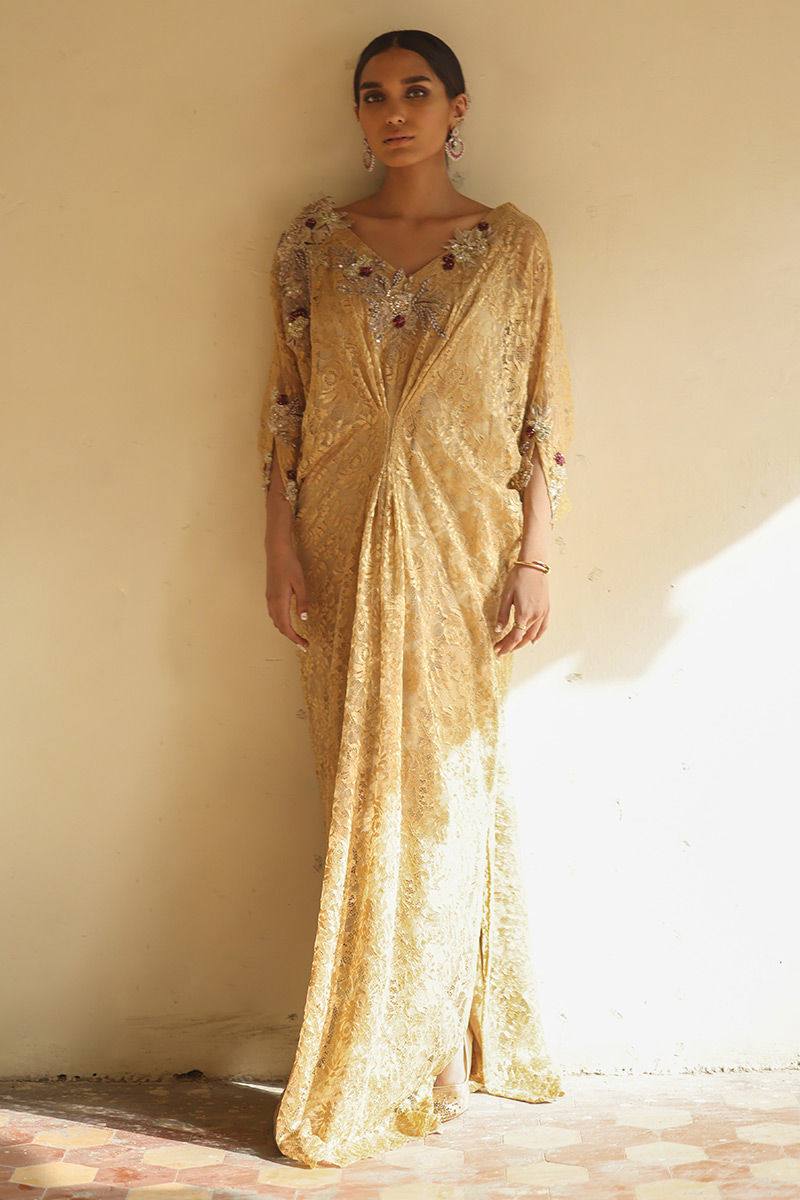 A perfect fusion of modern and traditional heritage can be witnessed in this gold Chantilly kaftan. The front and back neckline and sleeves are highlighted with crafted motifs of resham, zari, crystals, sequins and diamantes.